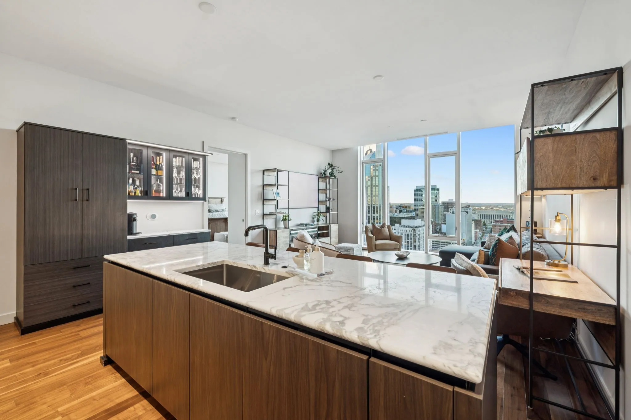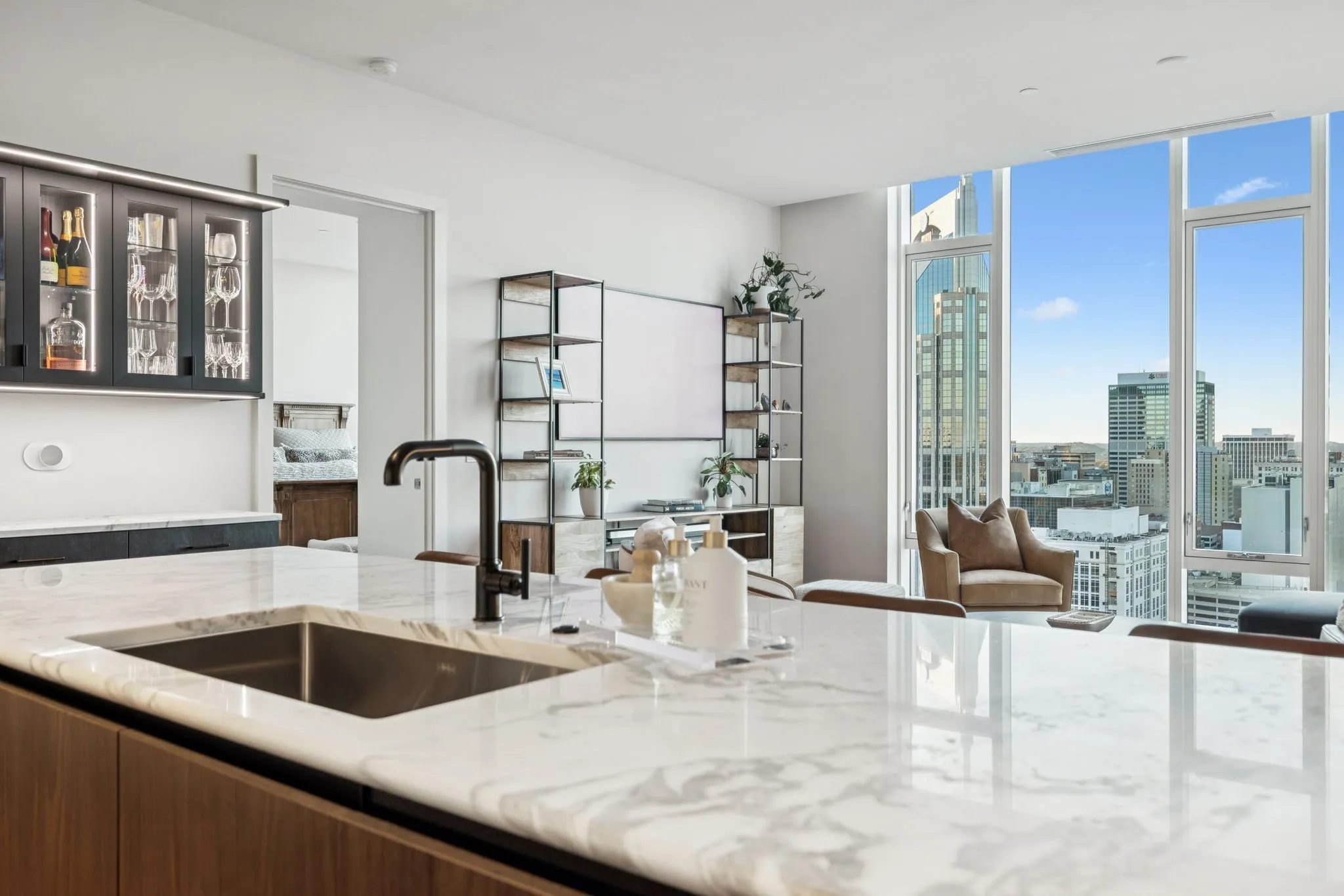 The open living space is flooded with natural light and frames sweeping views through floor-to-ceiling windows. The spa-inspired primary suite features a marble shower, soaking tub, and premium finishes. A powder bath, private storage unit, and dedicated resident elevator access add everyday convenience.