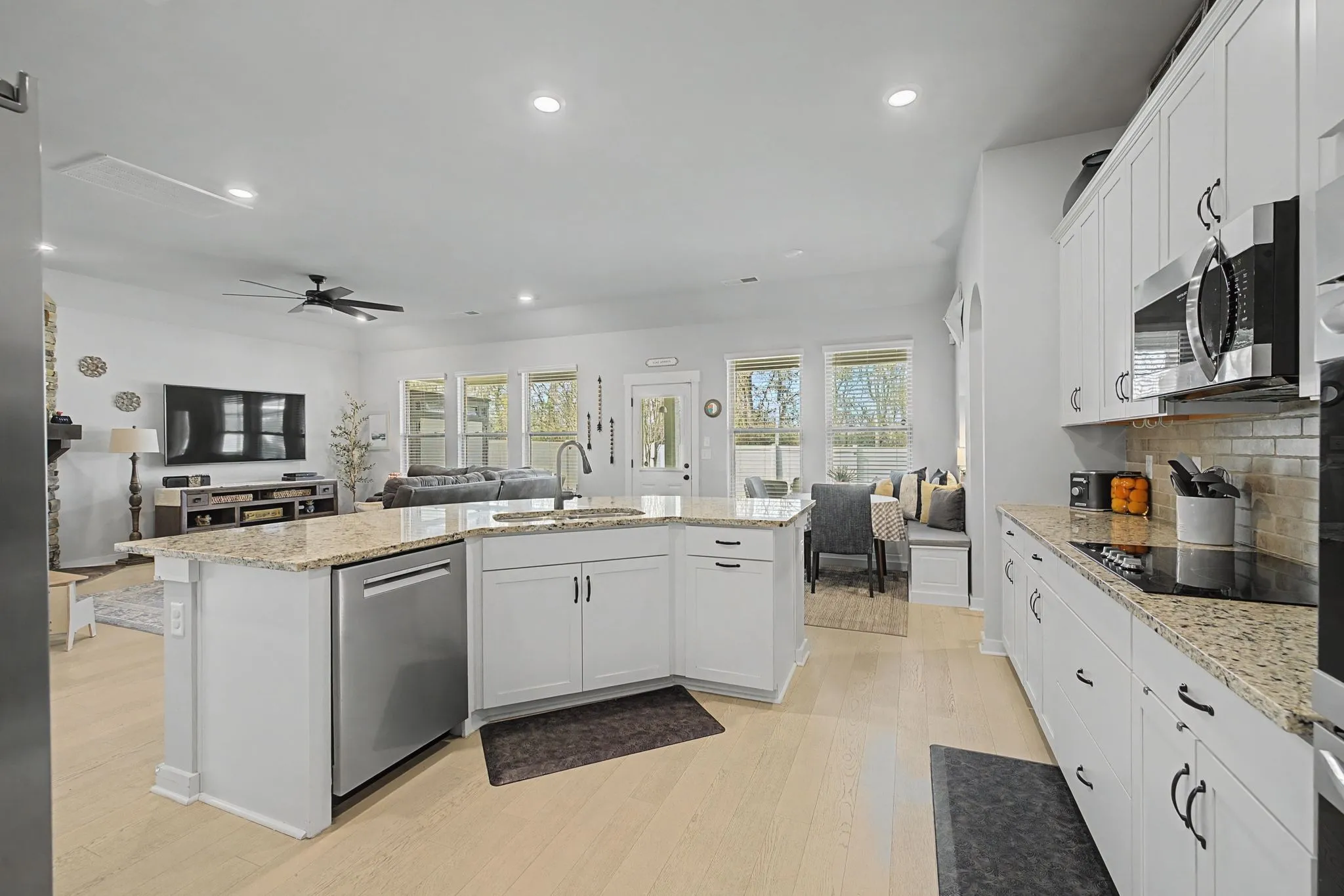 Designed for effortless entertaining, the open-concept layout shines inside and out. The spacious kitchen features a large island, double ovens, and a unique breakfast nook with a built-in planning center. Just beyond, enjoy a covered patio with two outdoor ceiling fans, overlooking a fully fenced backyard—perfect for relaxing or hosting guests. The home office is generously sized and lined with shelving for books, décor, or memorabilia. Storage is abundant throughout, including attic space, overhead garage shelving, a backyard storage shed, and thoughtful built-ins.