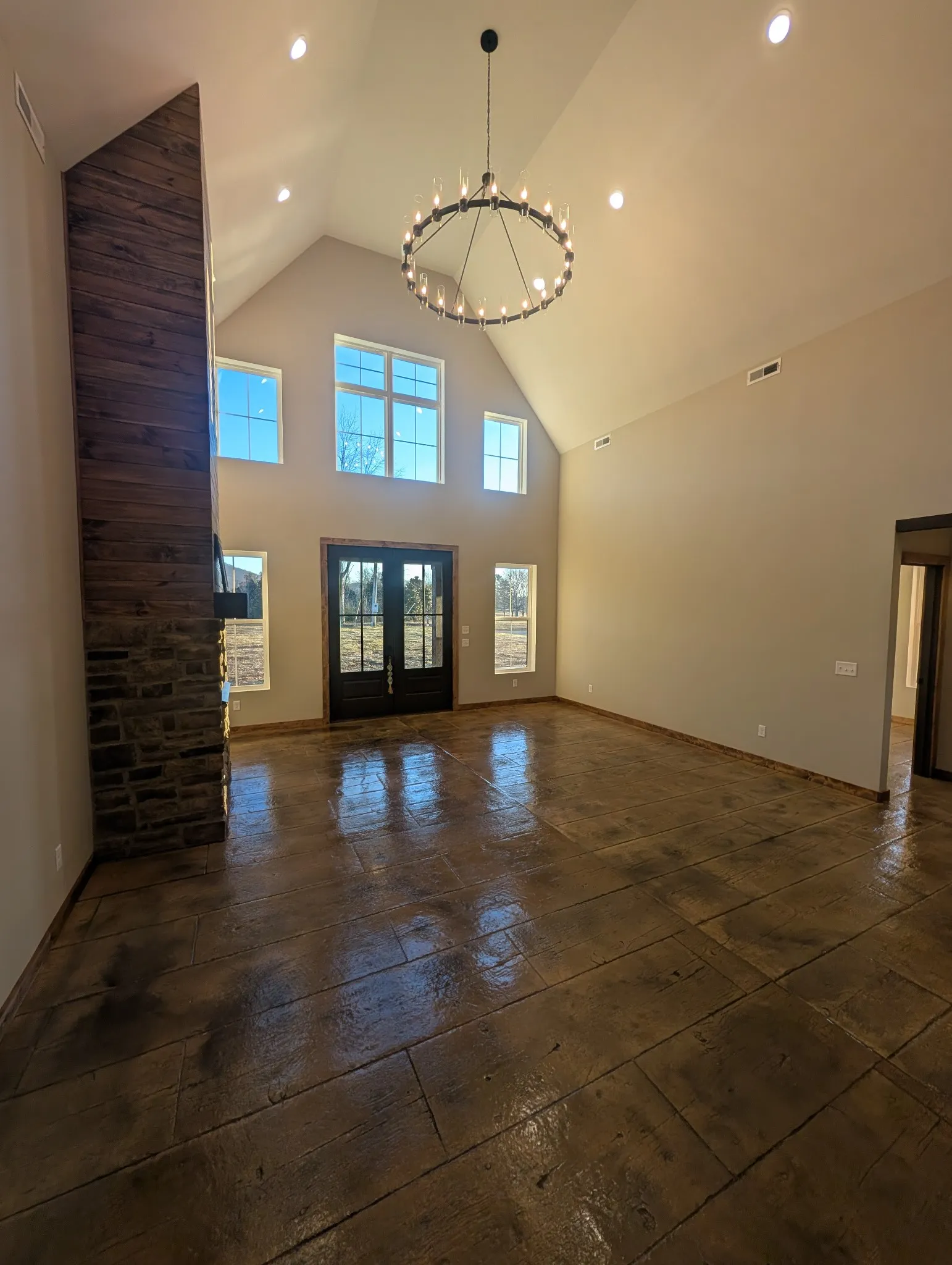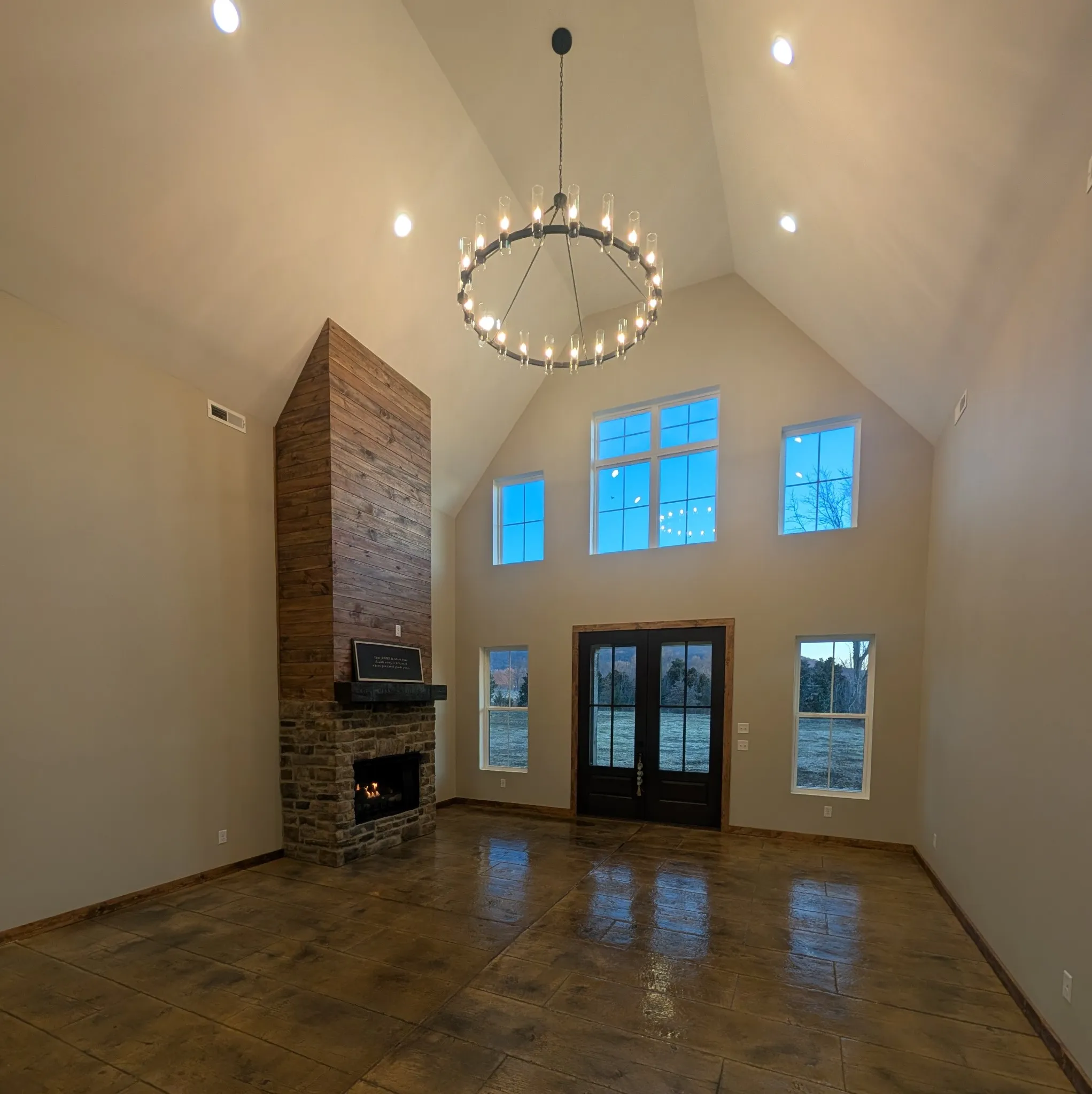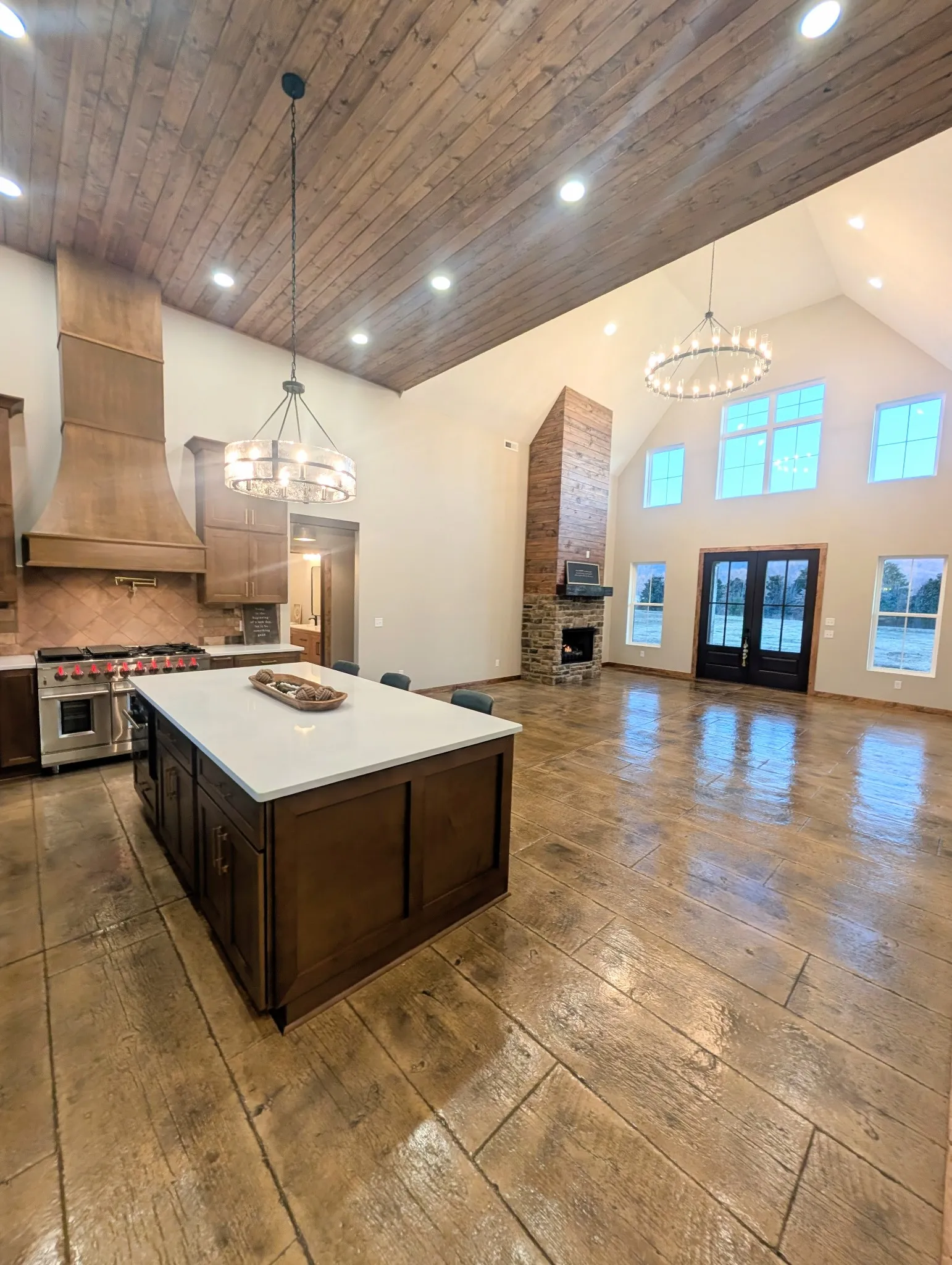 New Construction sets the Home feel immediately. Custom design and thought-out features. Stamped concrete floors gives a versatile lifestyle. Natural light shines from the gorgeous, oversized windows. The main living area has 24 foot ceilings and a floor to ceiling gas fireplace. Split floor plan flows well for times of family enjoyment, and also for peaceful, everyday living. The core of the home is the beautiful working kitchen boasting an 8 ft island, quartz tops, 48 inch Gas range, 60 inch Refrigerator, Microwave drawer, pot filler, and an impressive range hood. Pantry and large laundry just off the attached garage. The primary suite offers the feeling of a private retreat with a 3 head tiled shower with bench and a dreamy soaking tub. Wood interior trims, tall exterior doors, spa like finishes, mesmerizing lighting, hot water outside, tv outlets with mount bracing studs, exterior soffit lights, and great attic space for storage. Outside gives you a breathtaking view and the feeling of stillness yet conveniently located just outside the city limits. One acre lot gives space for fun evenings and additional possibilities!