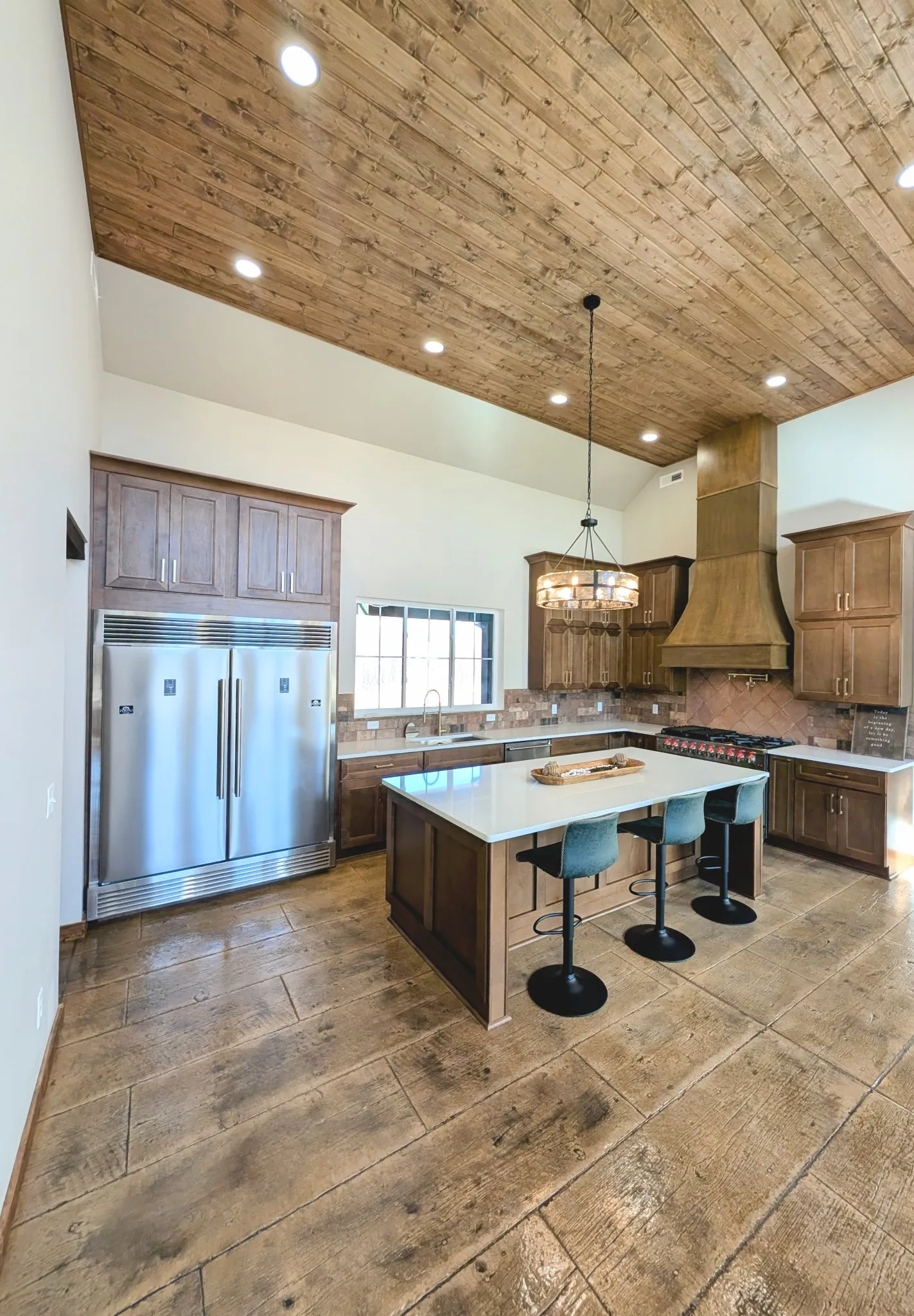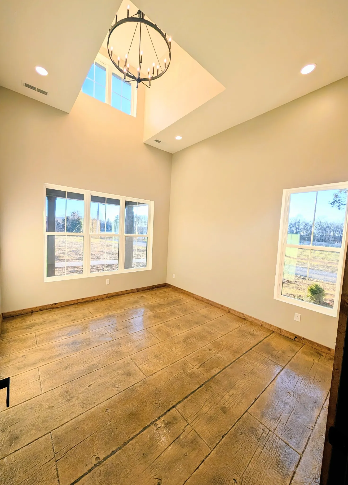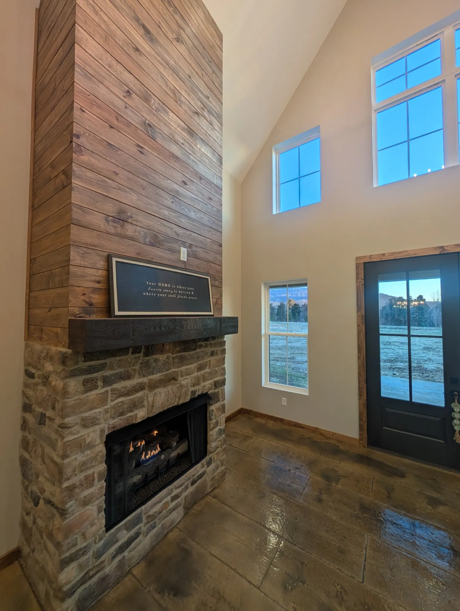 New Construction sets the Home feel immediately. Custom design and thought-out features. Stamped concrete floors gives a versatile lifestyle. Natural light shines from the gorgeous, oversized windows. The main living area has 24 foot ceilings and a floor to ceiling gas fireplace. Split floor plan flows well for times of family enjoyment, and also for peaceful, everyday living. The core of the home is the beautiful working kitchen boasting an 8 ft island, quartz tops, 48 inch Gas range, 60 inch Refrigerator, Microwave drawer, pot filler, and an impressive range hood. Pantry and large laundry just off the attached garage. The primary suite offers the feeling of a private retreat with a 3 head tiled shower with bench and a dreamy soaking tub. Wood interior trims, tall exterior doors, spa like finishes, mesmerizing lighting, hot water outside, tv outlets with mount bracing studs, exterior soffit lights, and great attic space for storage. Outside gives you a breathtaking view and the feeling of stillness yet conveniently located just outside the city limits. One acre lot gives space for fun evenings and additional possibilities!