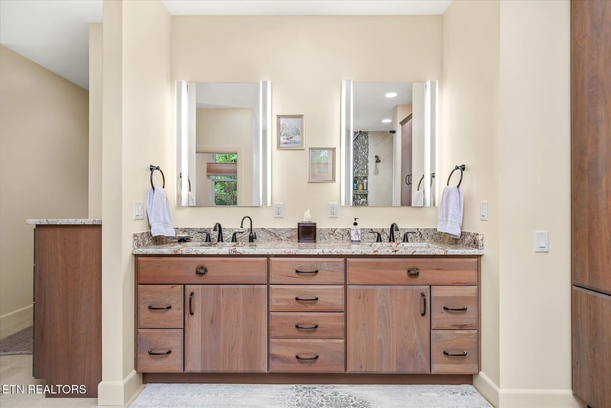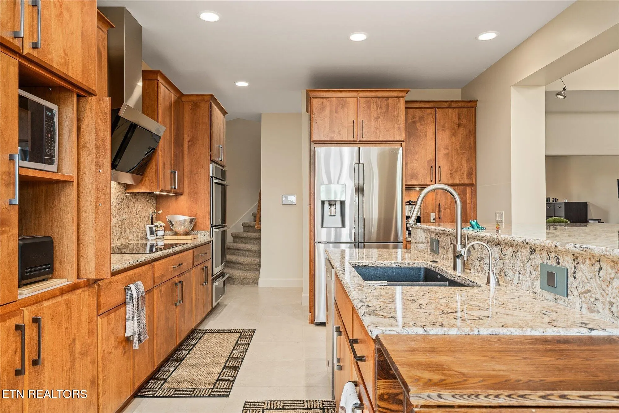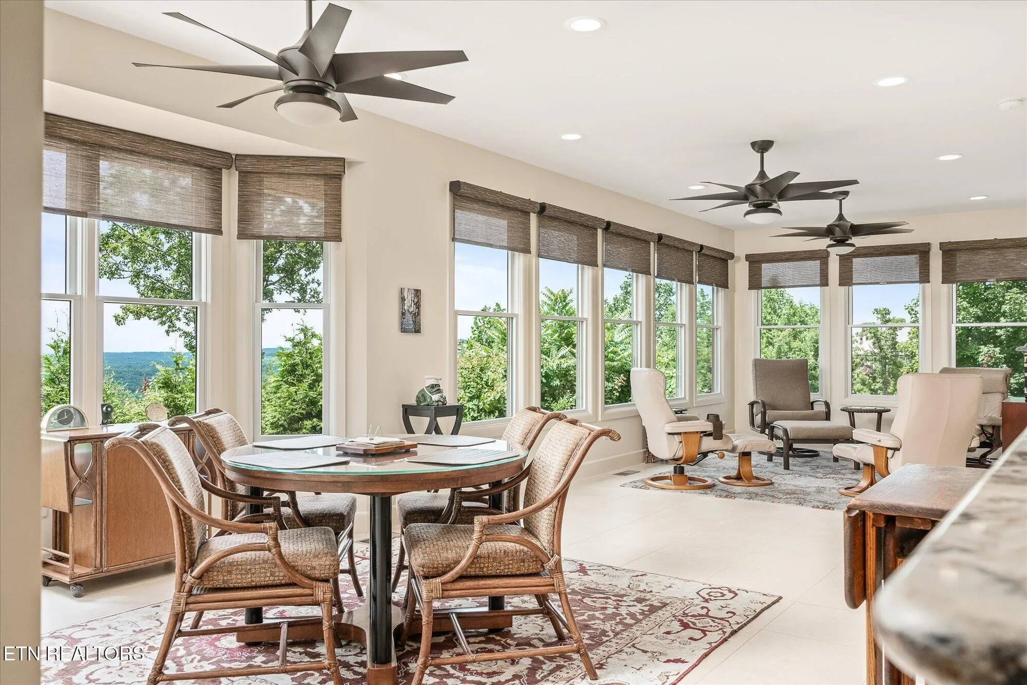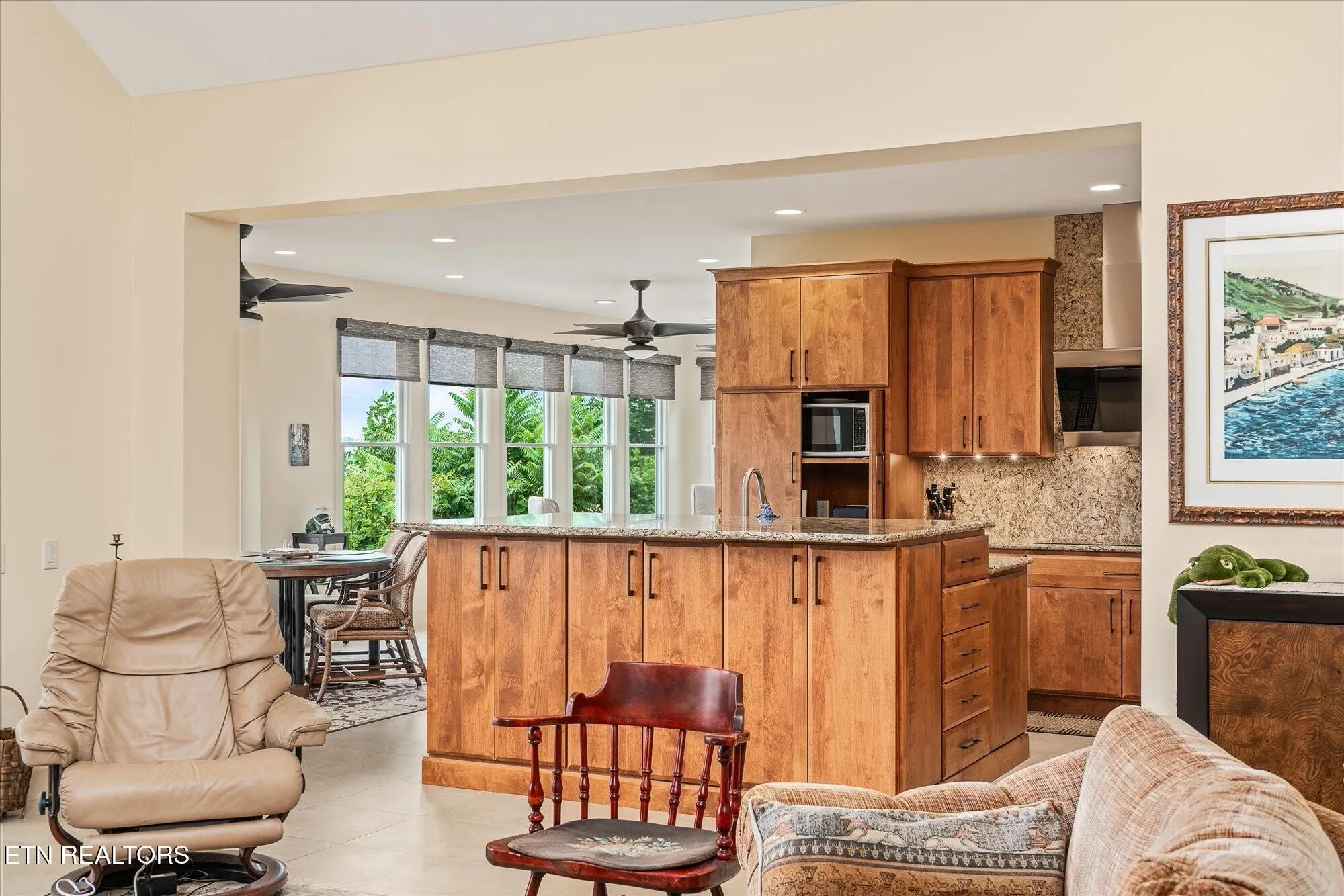 From the moment you walk in, you’re greeted by soaring ceilings and a wall of windows that invite the outdoors in, while the show-stopping floor-to-ceiling granite fireplace anchors the main living space with timeless style. The gourmet kitchen features an oversized granite island, walk-in pantry, and seamless access to the dining area, sunroom, and screened balcony.
