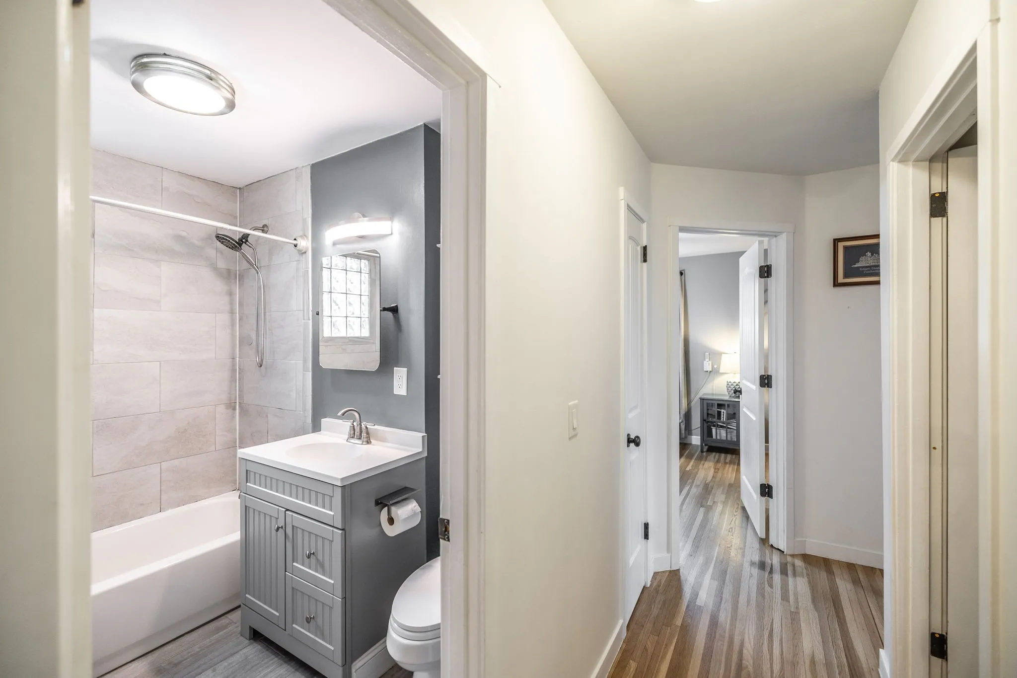 Recent updates include all new windows & doors, newer roof and new water heater. The finished basement includes a full bath and generous storage, providing flexible space ideal for a fourth bedroom, guest suite, home office, or recreation room. Finished hardwood floors and tile run throughout the home, with beautifully upgraded tile and finishes in every bathroom.