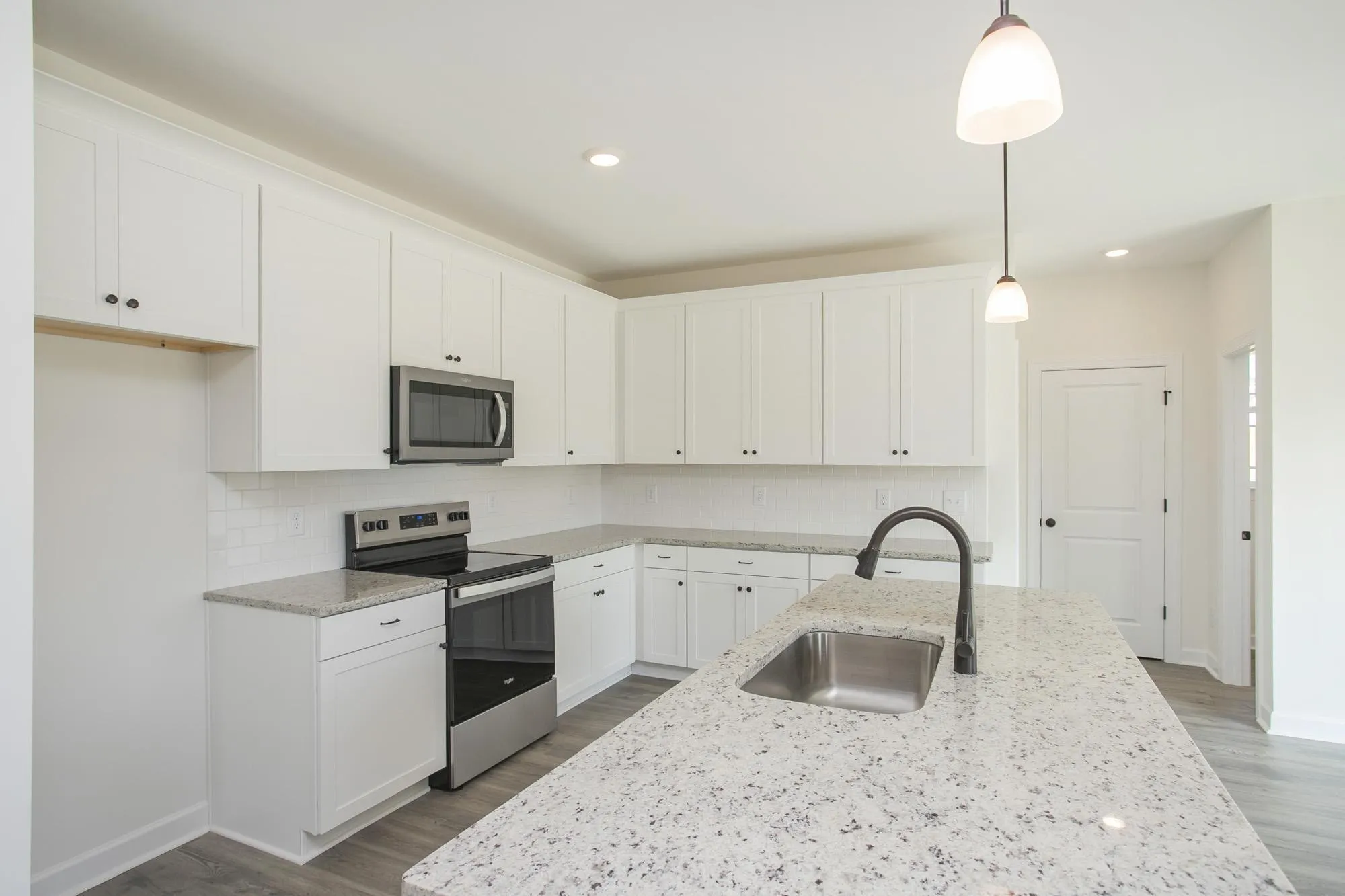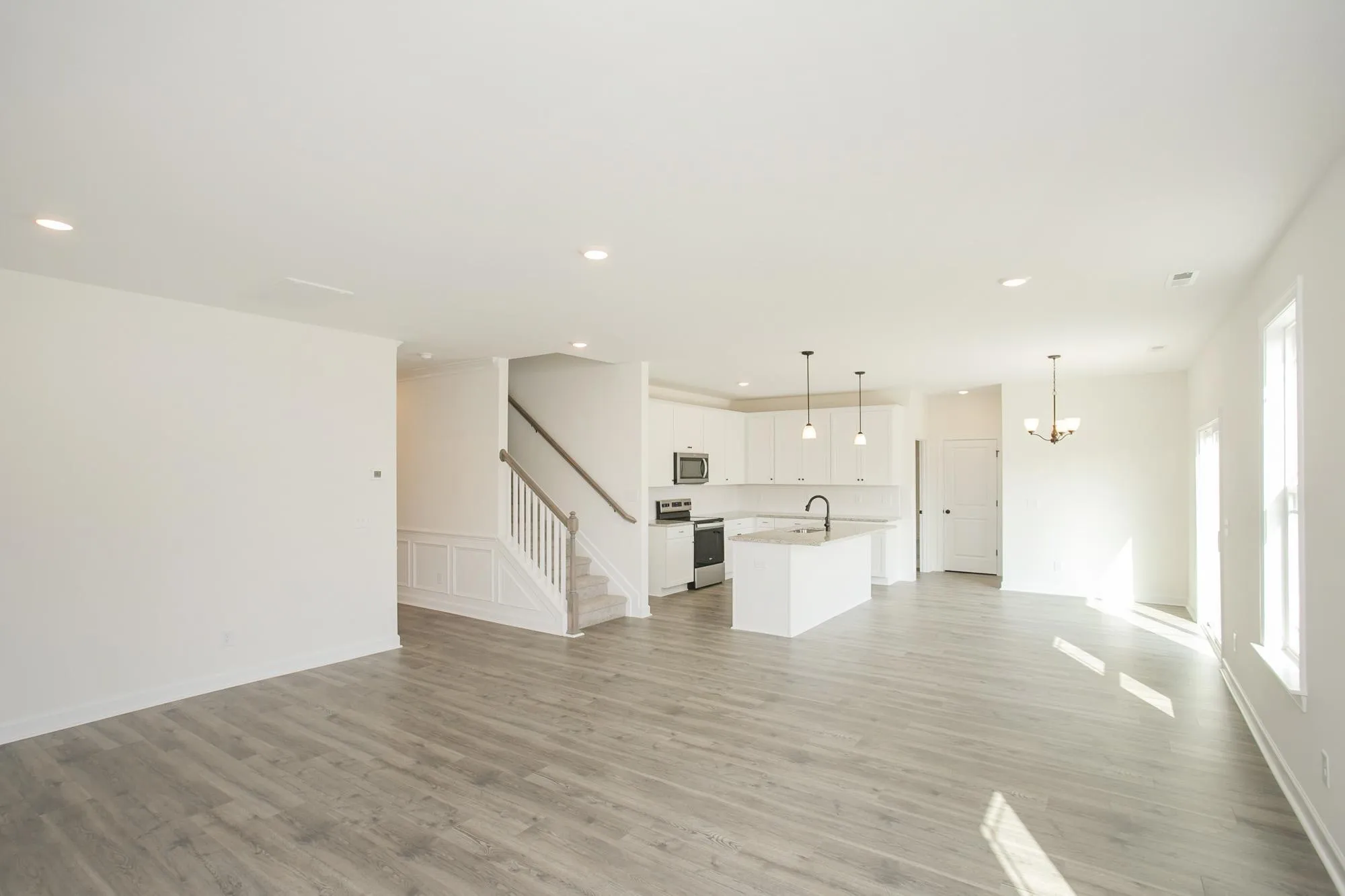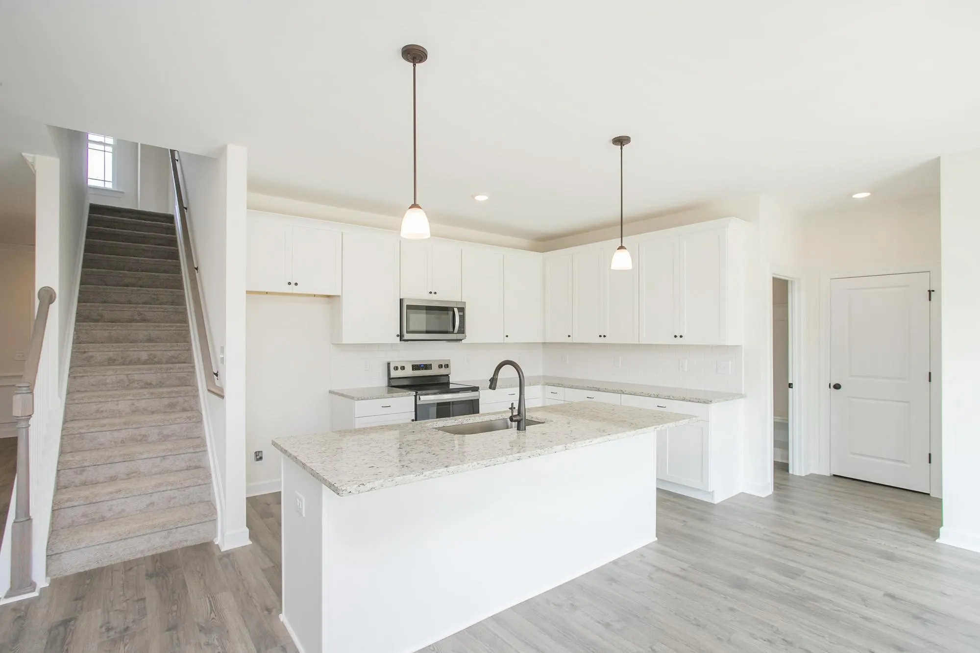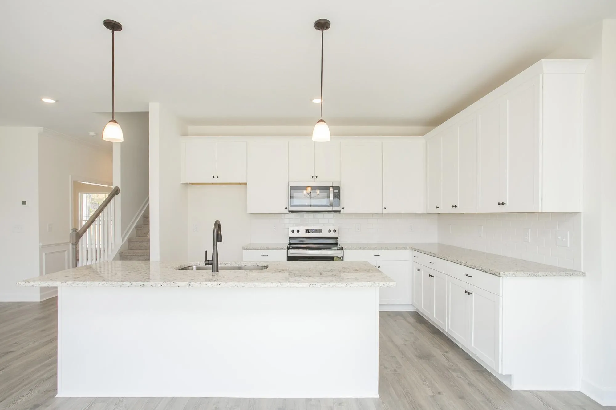 The main floor features an inviting open-concept layout with a formal dining room, family room, and a chef-inspired kitchen complete with a massive island with breakfast bar overhang, 42" cabinets, stainless steel appliances, and quartz countertops.\n