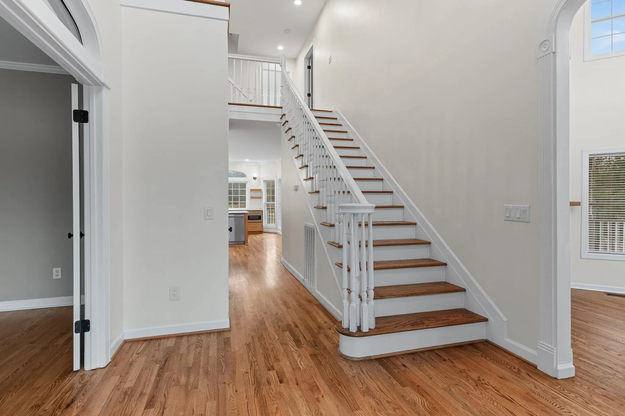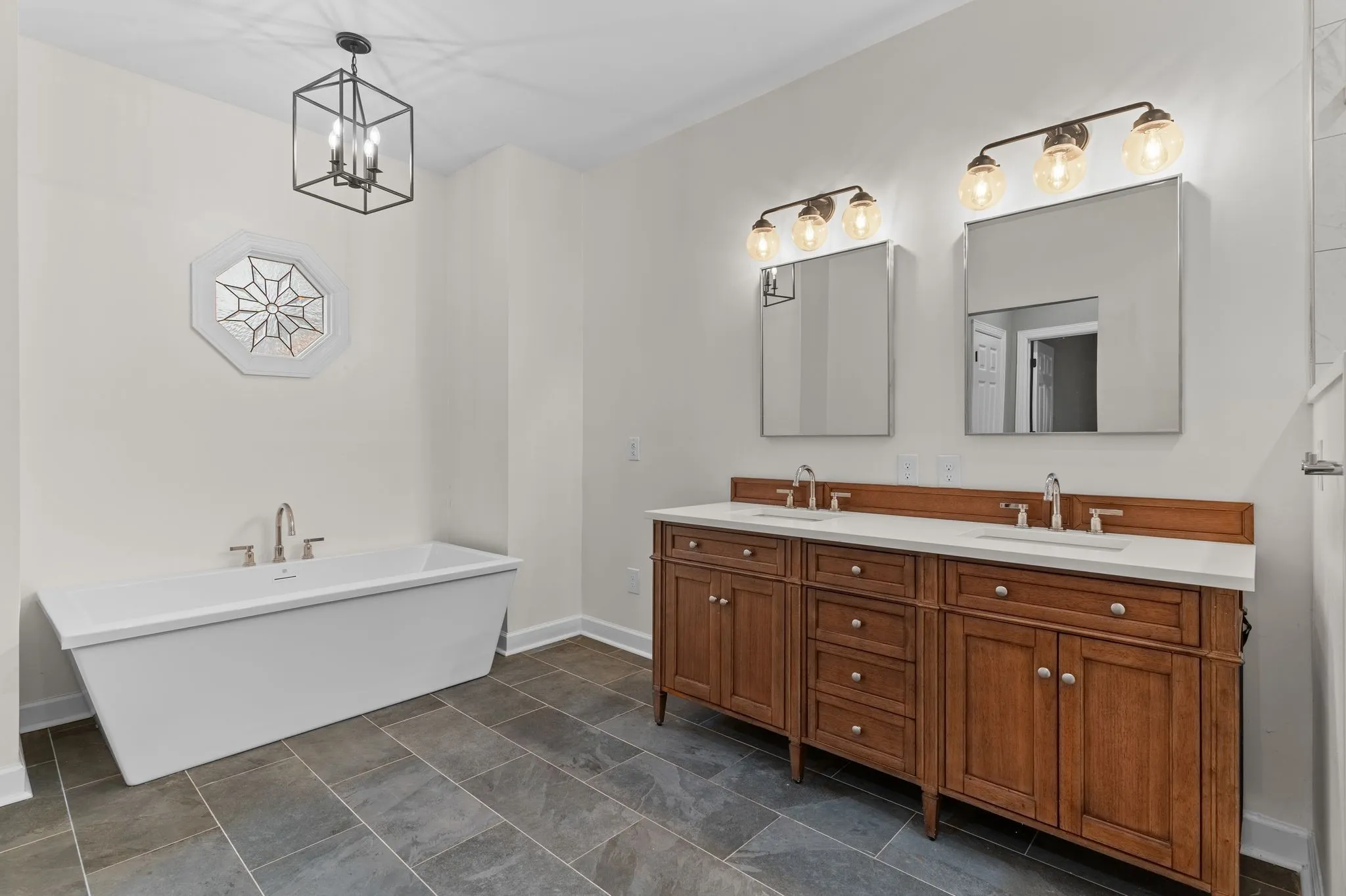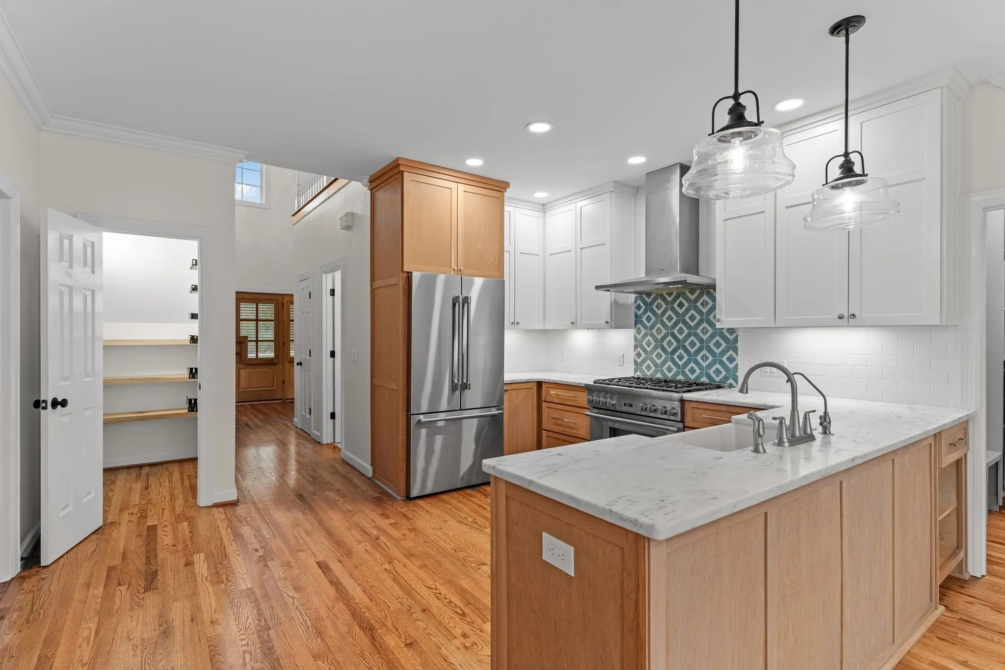Situated on almost 6 private acres, this all brick home was completely renovated and offers the perfect blend of timeless construction, modern luxury and versatile living space. The home features hardwood floors throughout and an exceptional chef’s kitchen equipped with Premium Thermador appliances including a gas range, dishwasher and refrigerator. Marble counters, natural wood cabinetry and an apron sink with pendant lighting make it the perfect place to entertain. Additional countertop space includes a wine fridge and microwave drawer. The main level owner’s suite has remote controlled black out shades, his and her walk in closets, and a top notch renovation of the primary bath including a walk in shower and separate tub, dual vanities and tile floor.