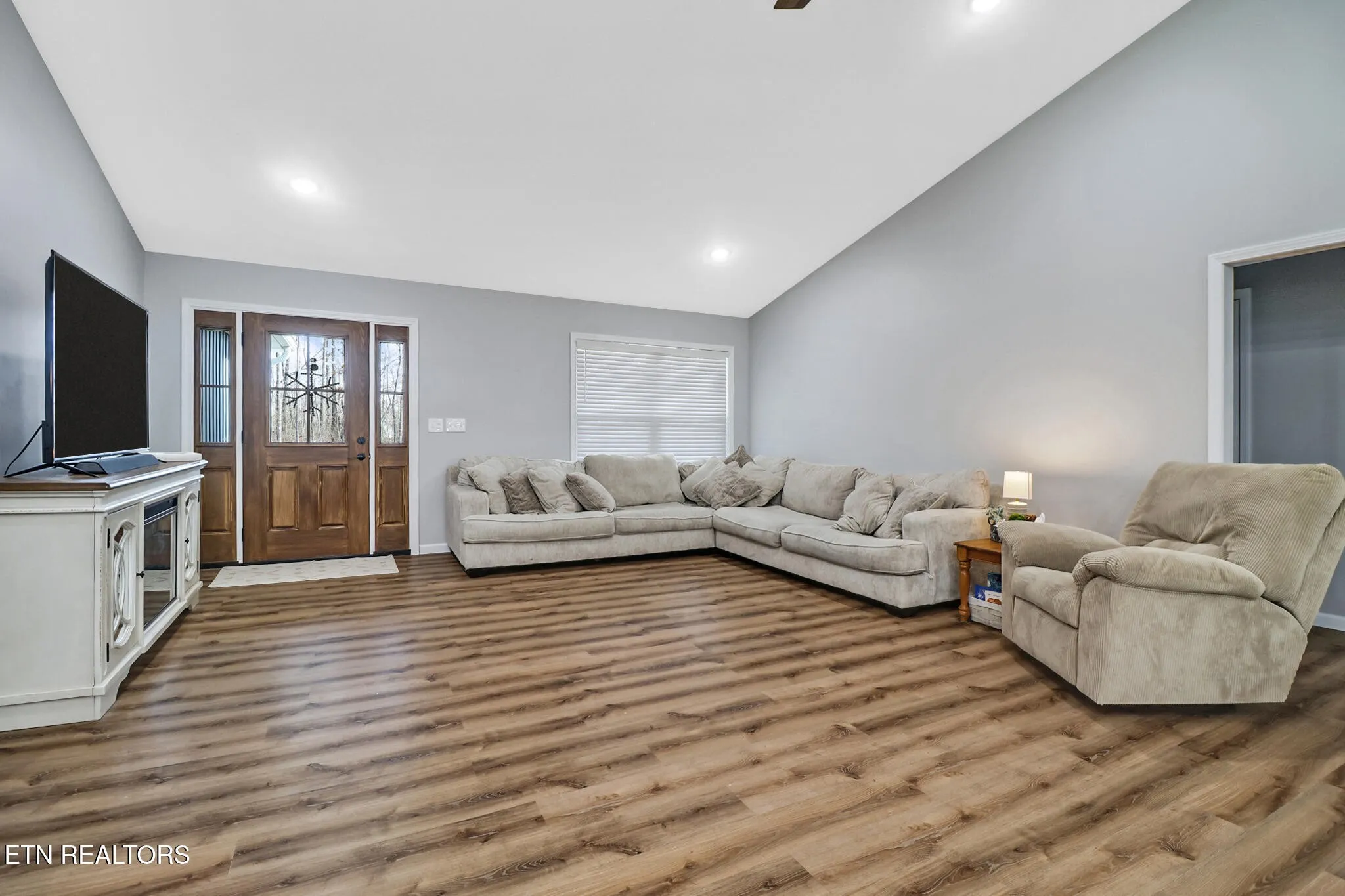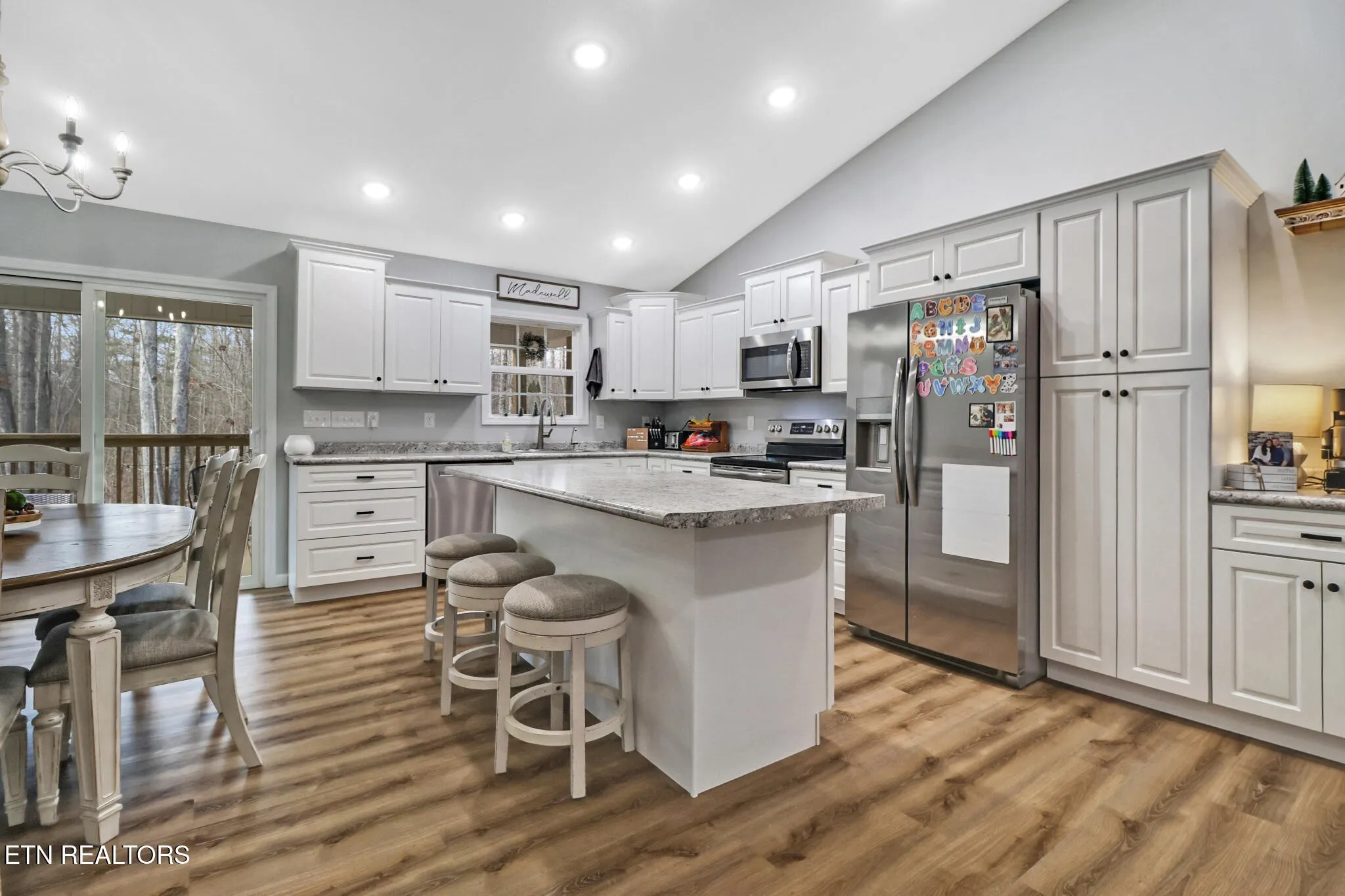 Well-maintained home featuring an open-concept layout with vaulted ceilings and luxury vinyl plank flooring throughout. Spacious living room flows into the kitchen and dining area, offering an ideal setup for everyday living and entertaining. Kitchen includes white shaker-style cabinetry, beautiful countertops, stainless steel appliances, and a large center island with ample storage.