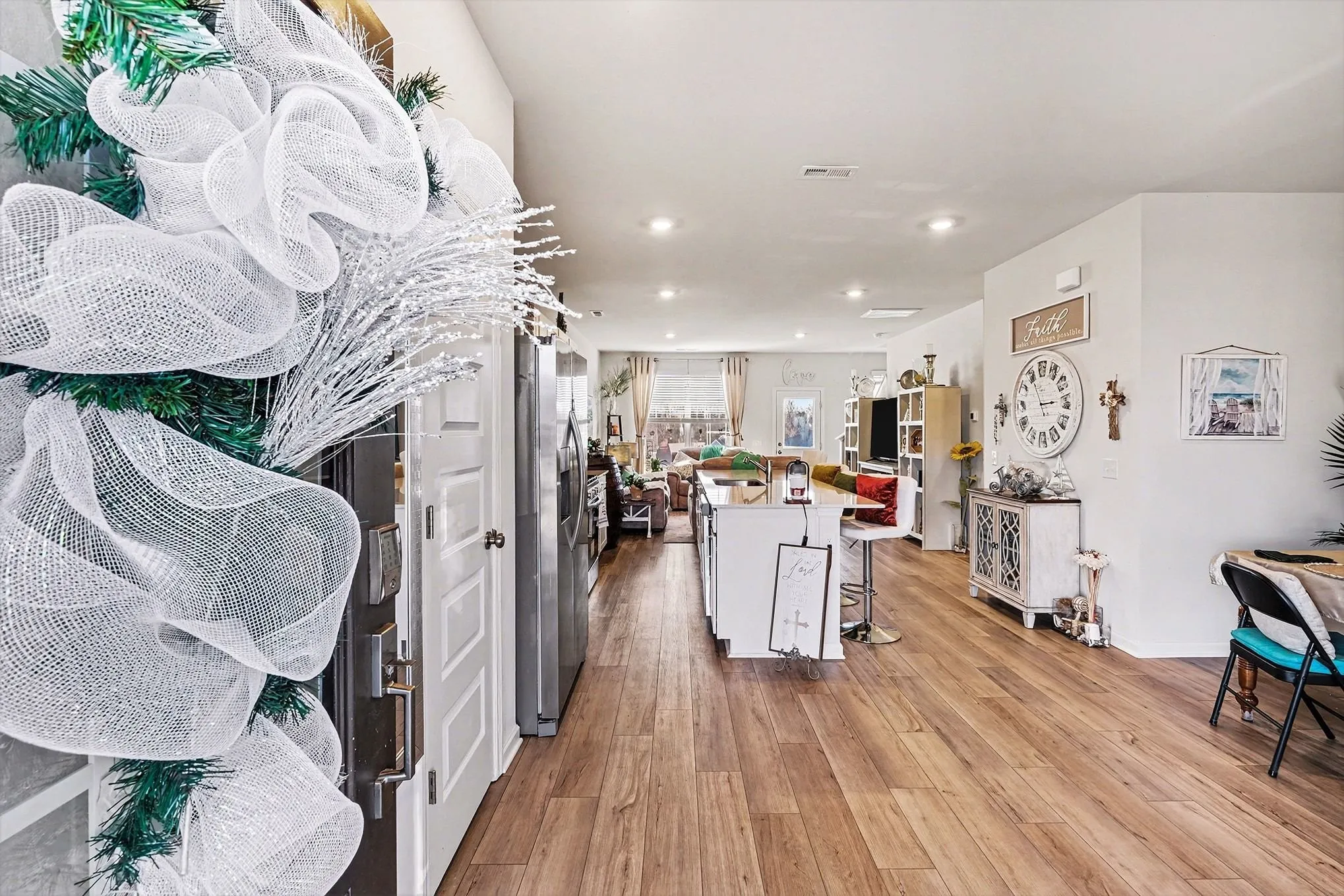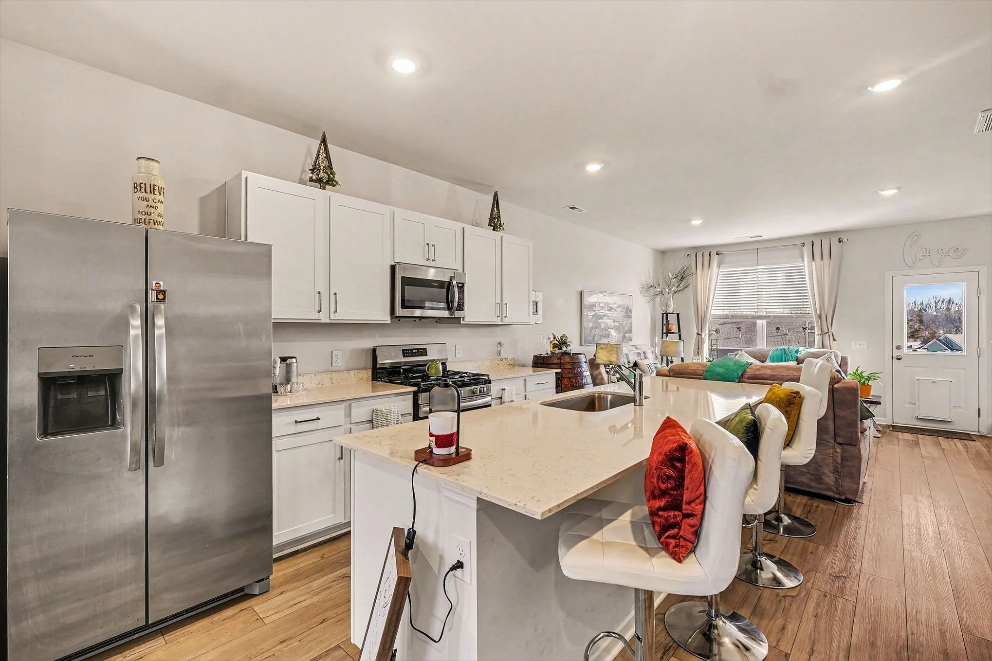 Like-new townhome just minutes from Spring Hill, offering modern style and a rare premium view. The open-concept layout features a chef-inspired kitchen with quartz countertops, oversized island seating, stainless steel appliances including a gas range, luxury vinyl plank flooring, 2-inch blinds, Ring doorbell, and smart thermostats.