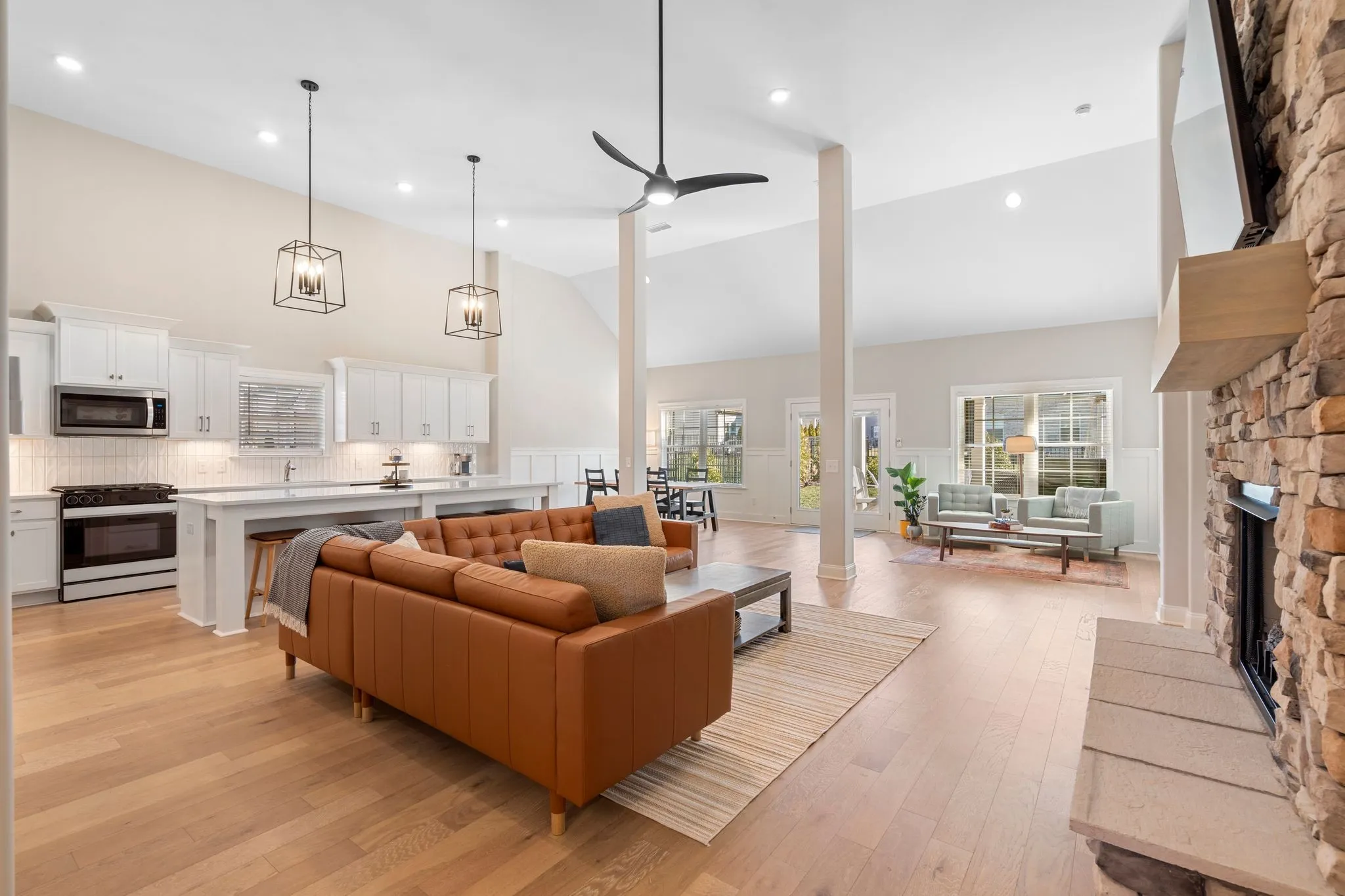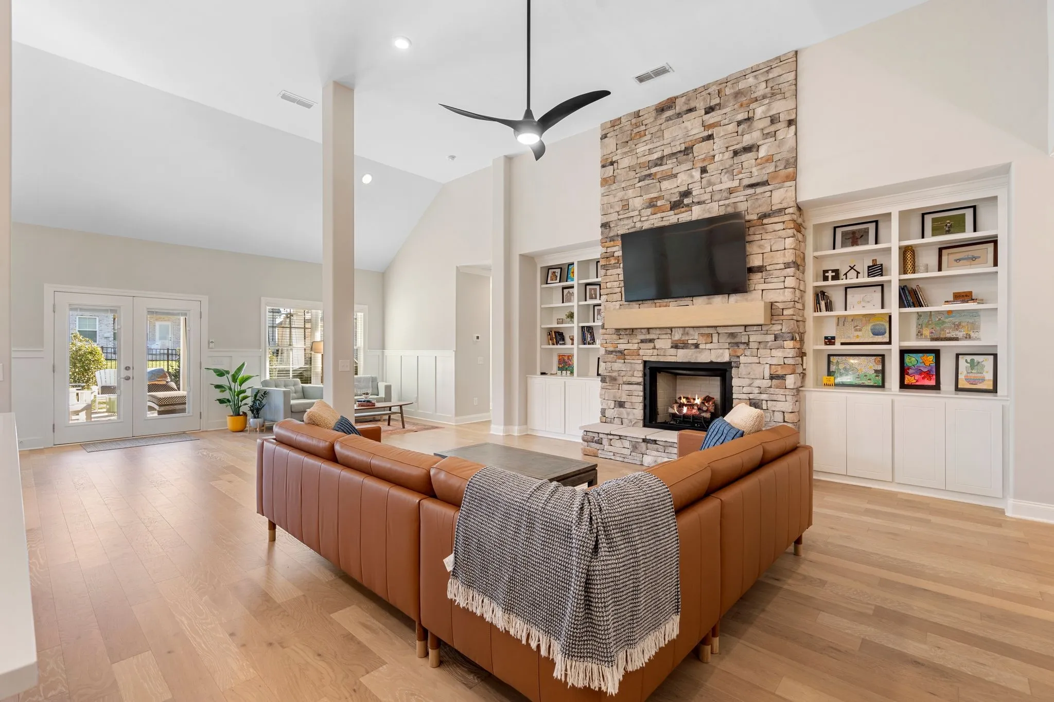 Beautifully designed 4-bedroom, 3.5-bath home with an exceptional layout and upscale finishes throughout. Three spacious bedrooms are located on the main level, including two with a convenient Jack-and-Jill bath. The private primary suite features a tray ceiling, double vanities, a separate soaking tub and shower, and a large walk-in closet. Dedicated office space adds everyday functionality.The heart of the home showcases a massive two-story open living area with a stunning stone fireplace, custom built-ins on both sides, and an oversized island surrounded by abundant cabinetry and a walk-in pantry. The dining area and adjacent sitting space create an ideal setting for entertaining. Upstairs offers a versatile bonus room/bedroom with a full bath. Outdoor living is just as impressive with a covered patio, extended patio space, wrought iron fencing, professional landscaping, and irrigation in both front and back yards. Additional features include an epoxy-finished two-car garage, gated entrance, underground utilities, and access to a beautiful community pool, pool house, and playground.