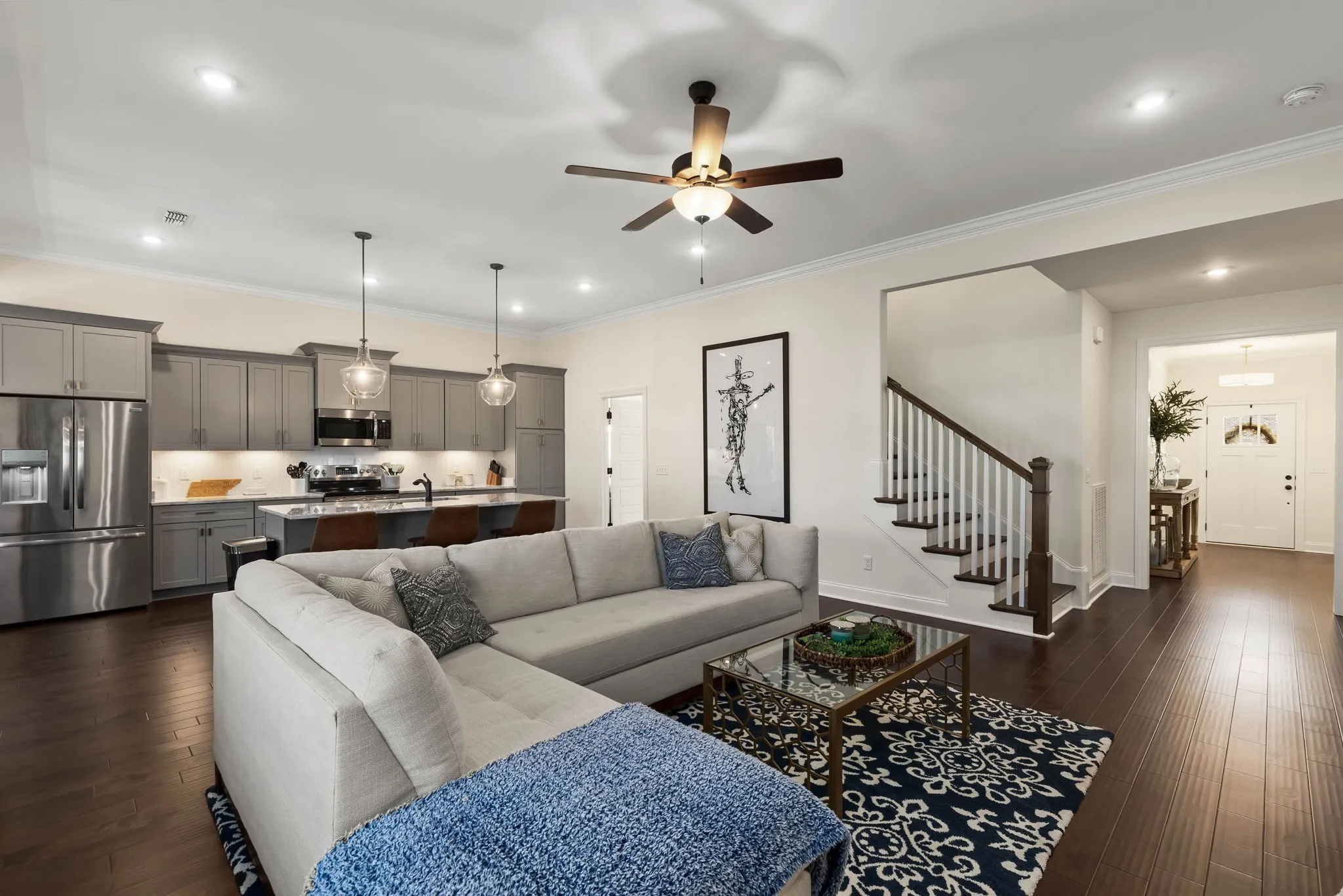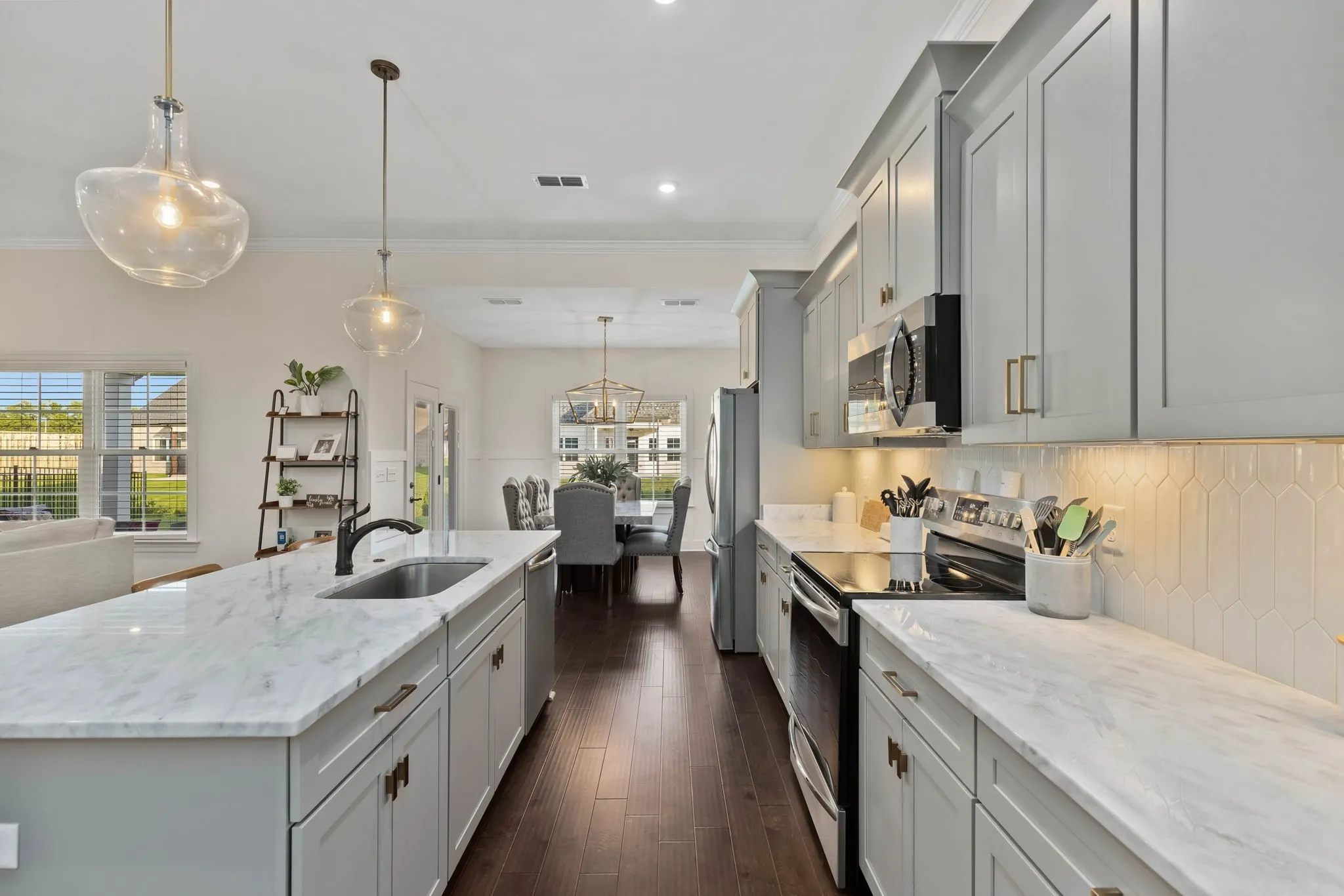 From the moment you step inside, you’ll be captivated by the open and inviting floor plan, ideal for both everyday living and entertaining. Natural light fills the living spaces, creating a warm and welcoming atmosphere that seamlessly connects each room. The heart of the home is the gourmet kitchen—a true chef’s delight—featuring high-end appliances, granite countertops, and a generous center island with seating, perfect for casual meals or gathering with guests. The adjacent dining area offers an inviting space for family dinners, holiday celebrations, or intimate dinner parties.\n