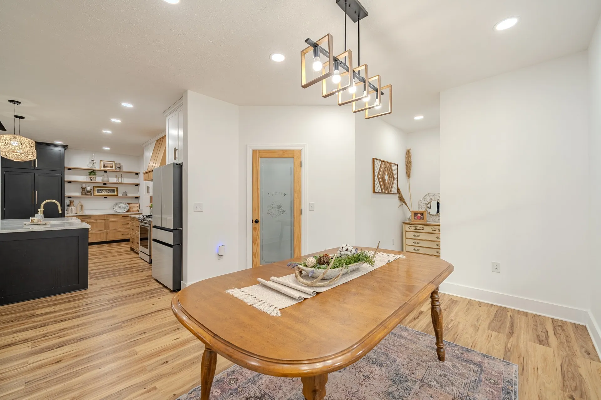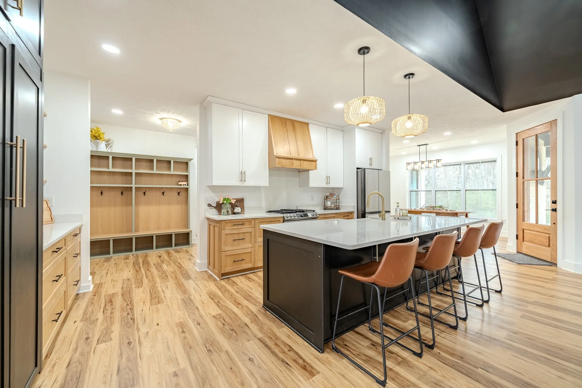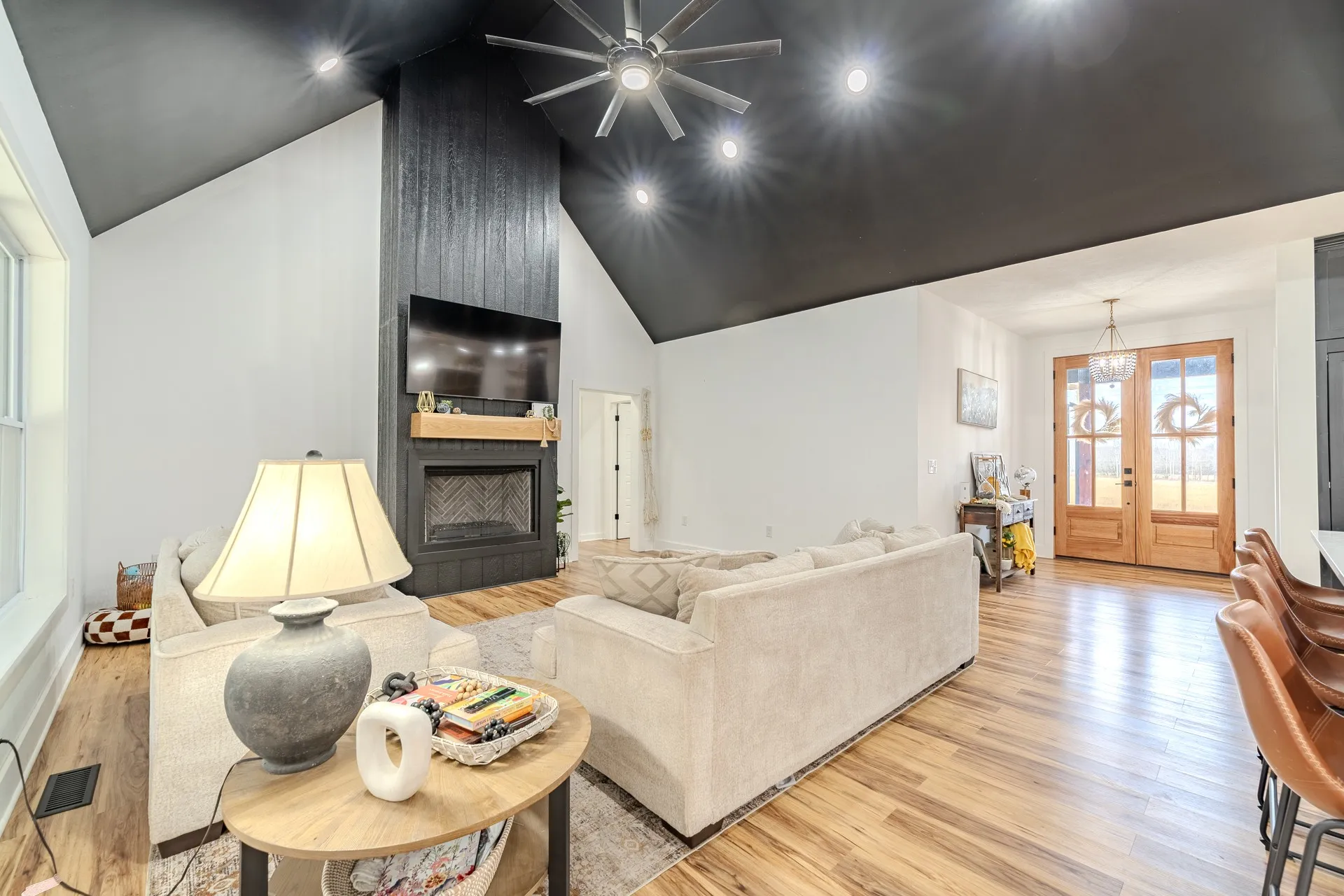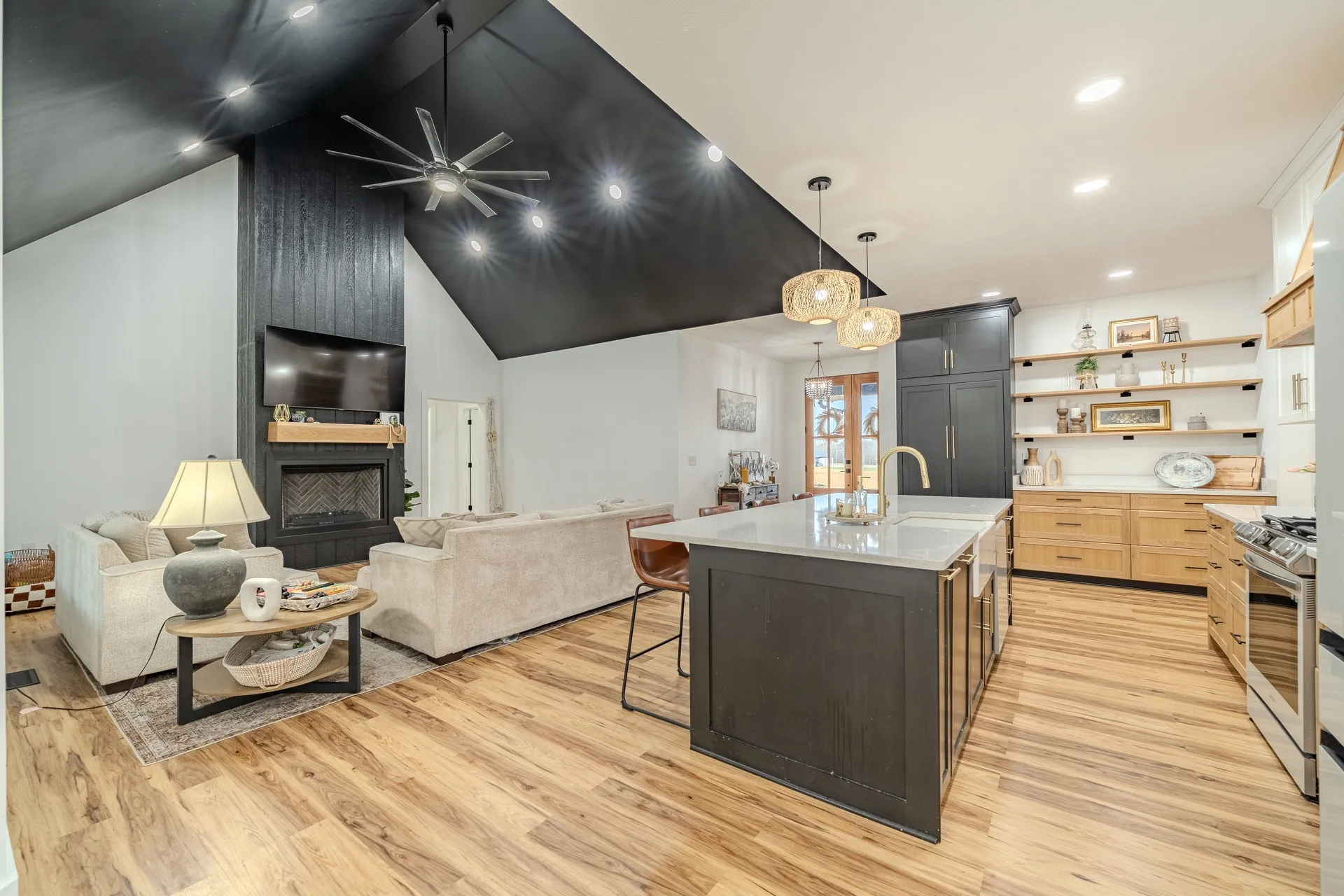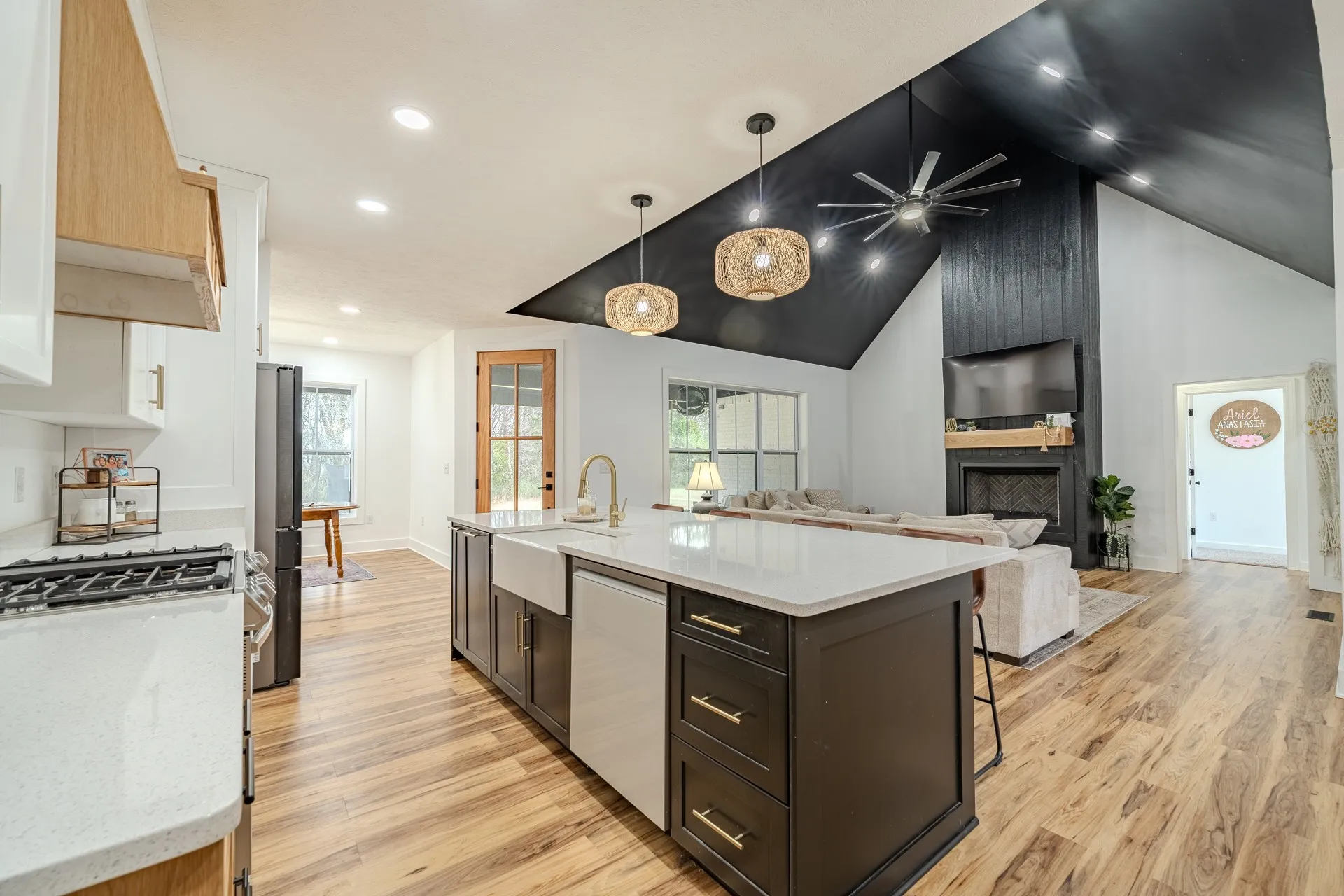 New price! Welcome home to this beautifully designed modern farmhouse that perfectly blends warmth, style, and functionality. Situated at the end of a cul-de-sac in a desirable subdivision. From the moment you arrive, the striking exterior with contrasting brick and board-and-batten siding, dark accents, and inviting covered front porch sets the tone for what’s inside.Step into a light-filled, open-concept living space featuring high ceilings, beautiful flooring and a dramatic floor-to-ceiling gas fireplace with a custom wood mantel.The chef’s kitchen boasts a large island with seating, sleek soft close cabinetry with modern hardware, high-end appliances, quarts countertops, and elegant pendant lighting. The kitchen is complete with a well-appointed pantry designed for maximum storage and convenience.Whether hosting guests or enjoying a quiet night in, this space is both stylish and highly functional.