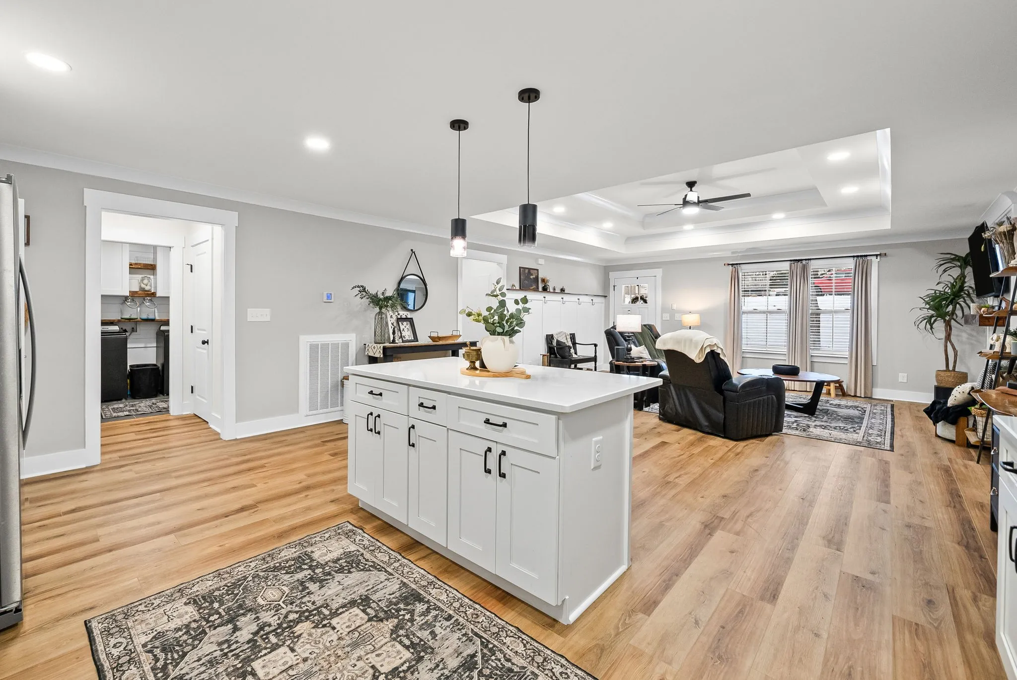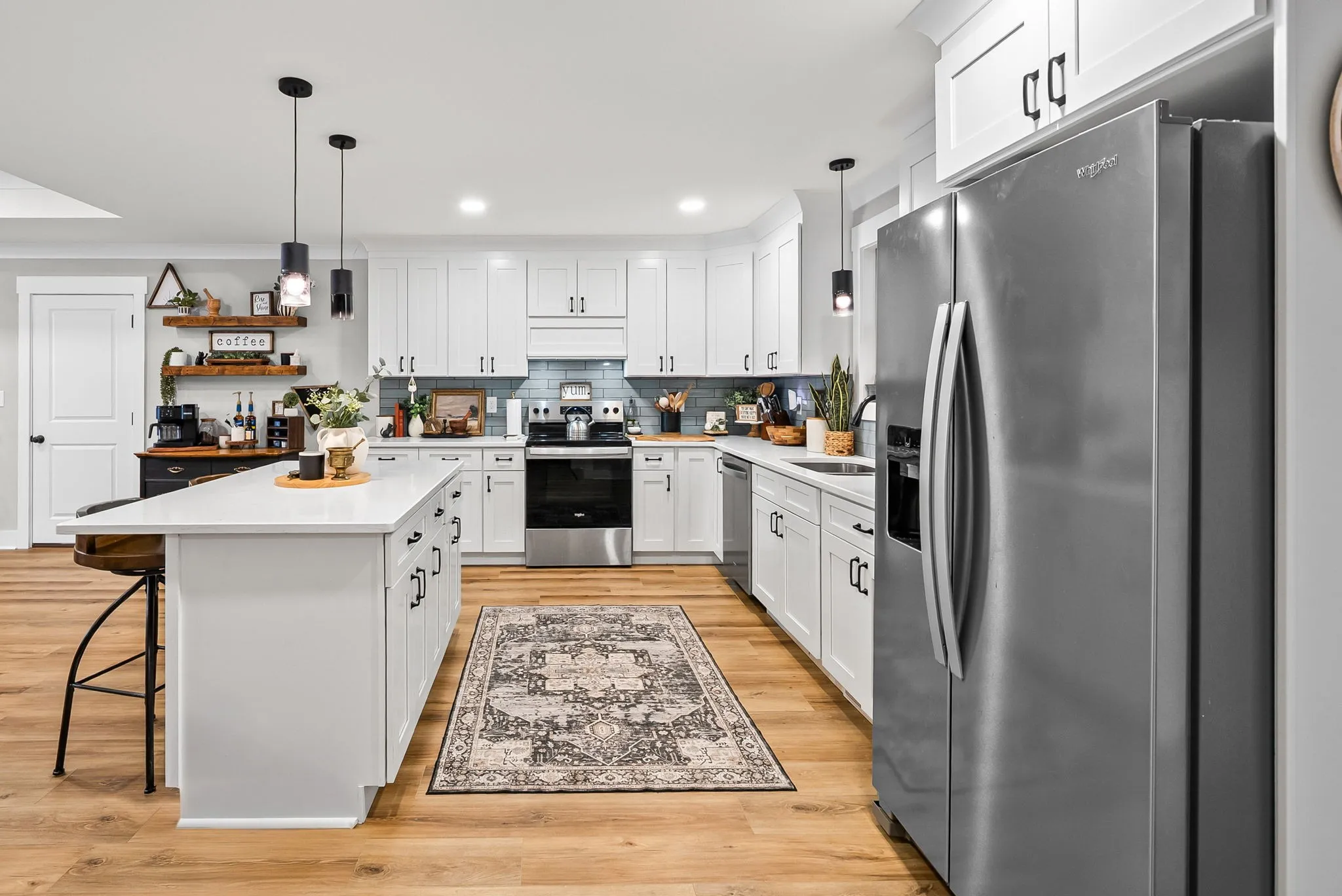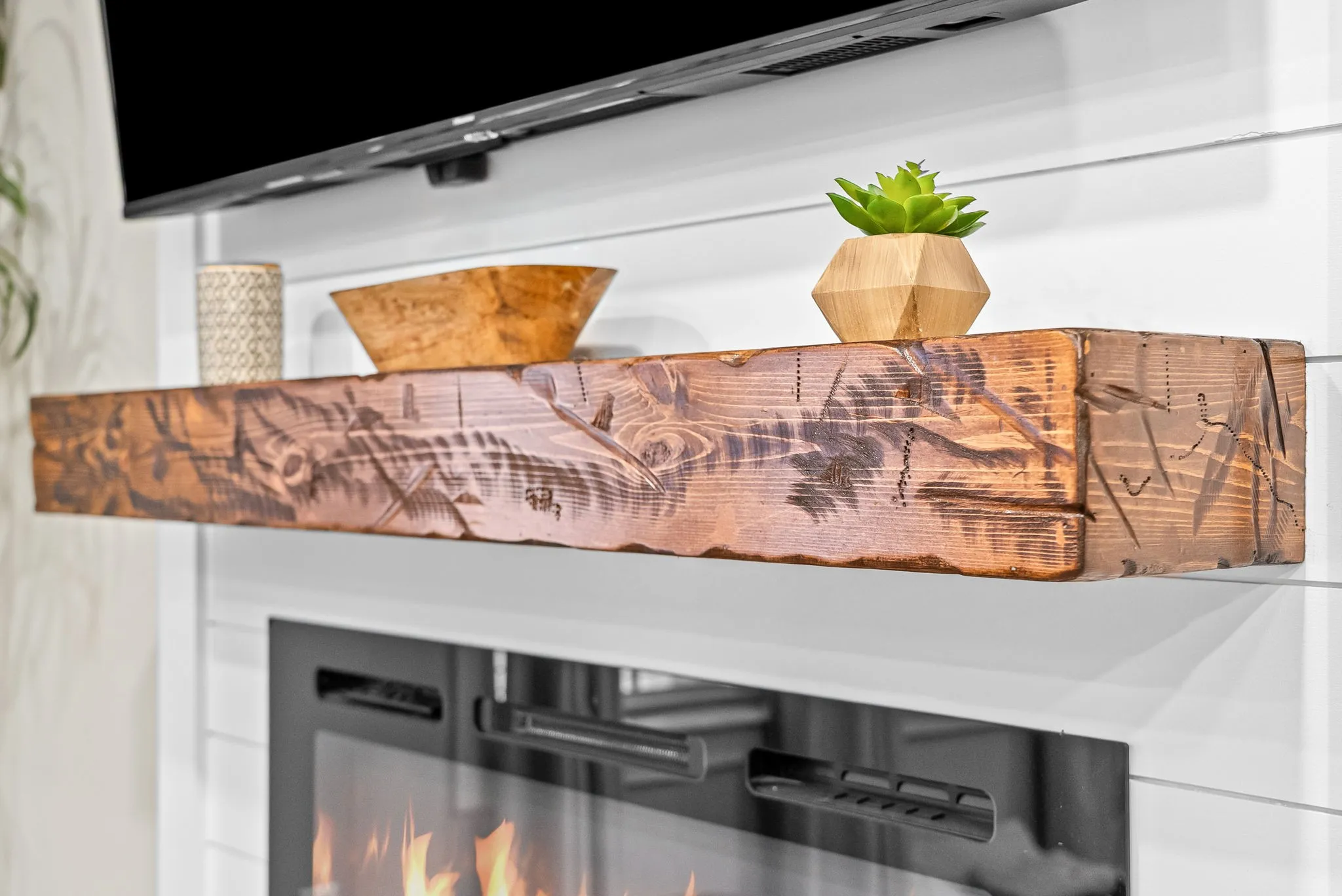 The heart of the home is the stunning kitchen, featuring custom cabinetry, quartz countertops, a beautiful custom backsplash, range hood, and a large center island, plus a walk-in pantry with custom built-ins for extra storage. The living space is anchored by a statement electric shiplap fireplace with a live-edge mantle, creating a warm and inviting focal point.