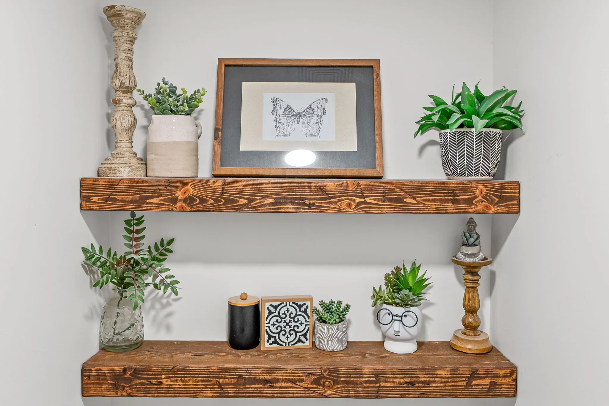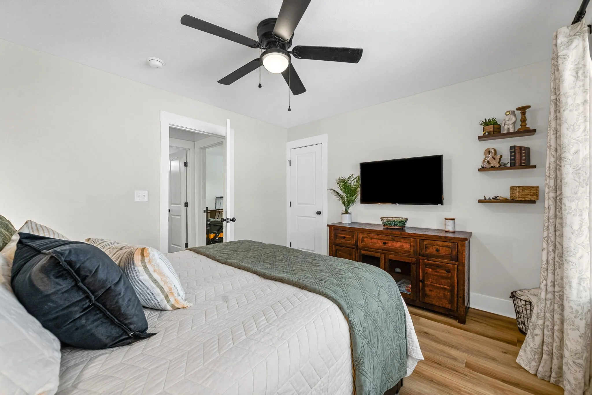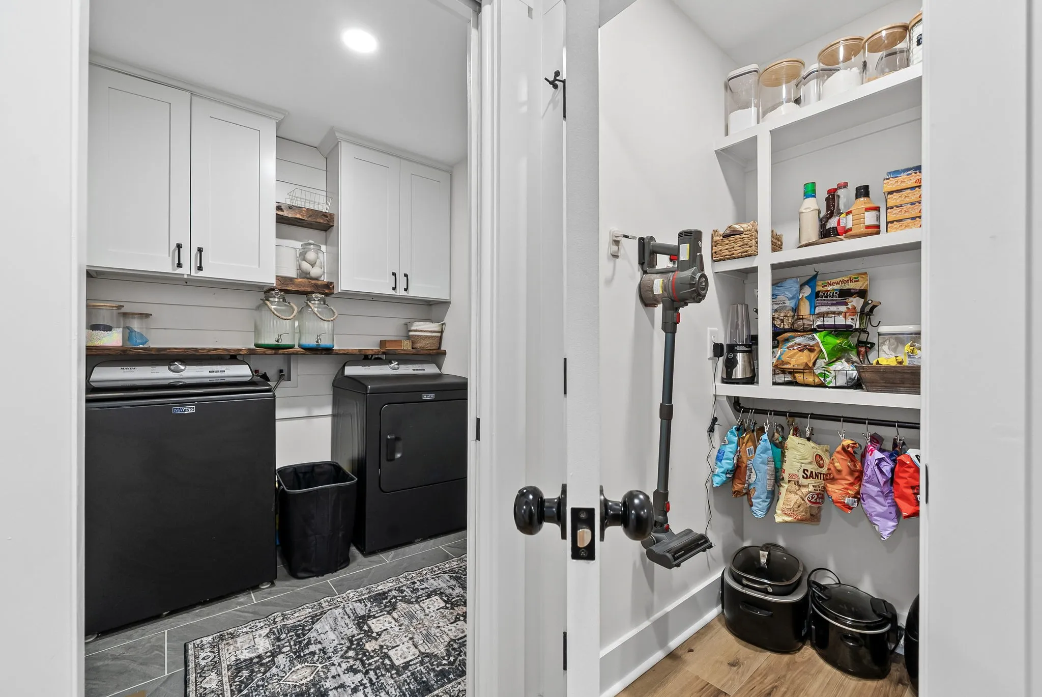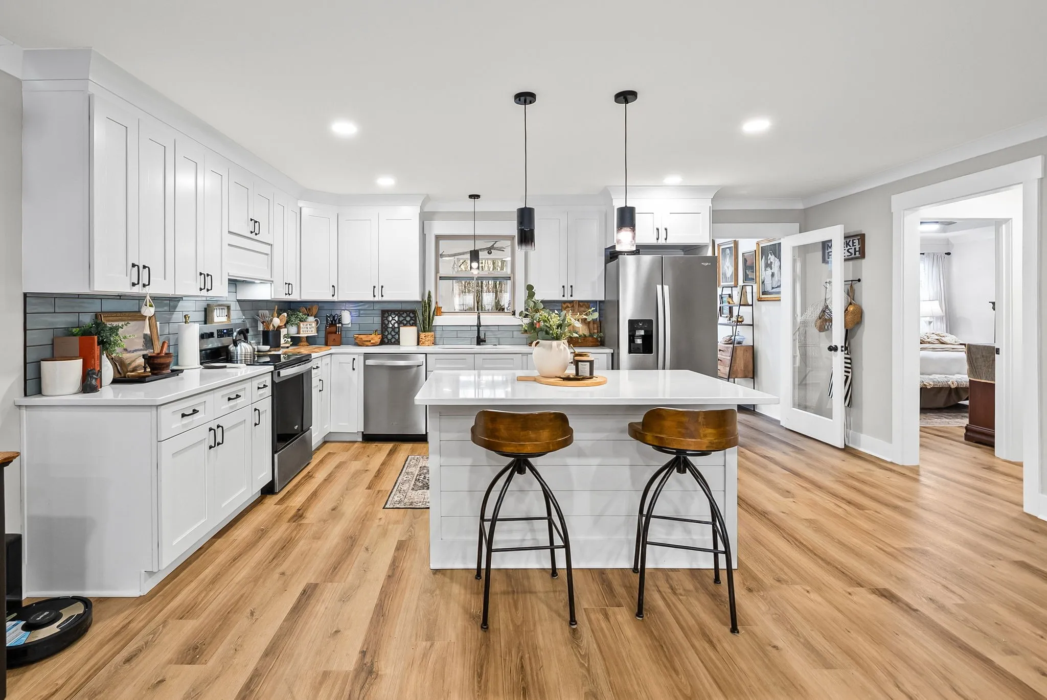 The heart of the home is the stunning kitchen, featuring custom cabinetry, quartz countertops, a beautiful custom backsplash, range hood, and a large center island, plus a walk-in pantry with custom built-ins for extra storage. The living space is anchored by a statement electric shiplap fireplace with a live-edge mantle, creating a warm and inviting focal point.