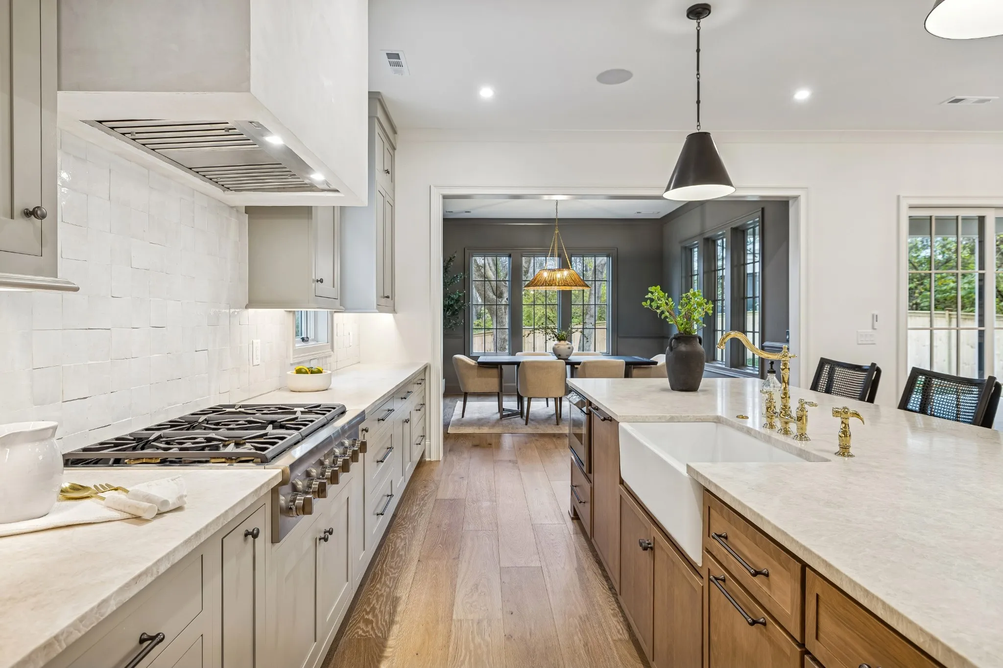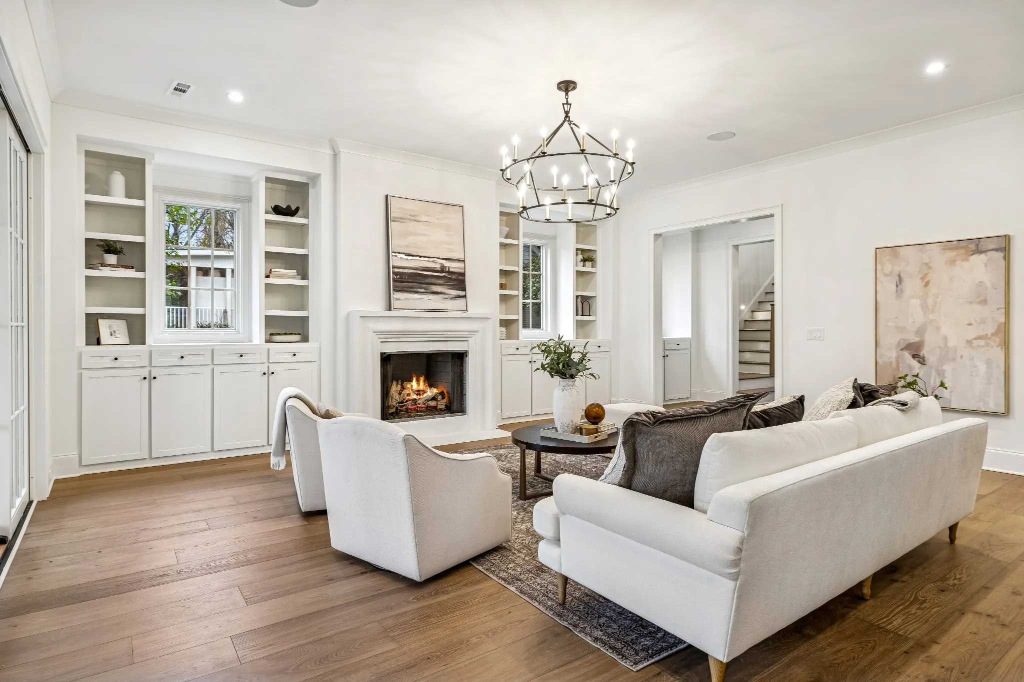 The interior features soaring ceilings, wide-plank hardwood floors, and an open-concept layout designed for both daily living and entertaining. The chef’s kitchen anchors the main living space with a large island, Thermador stainless-steel appliances, custom cabinetry, designer tile accents, and a modern range hood. The living area is highlighted by a statement fireplace and expansive windows providing abundant natural light.\n