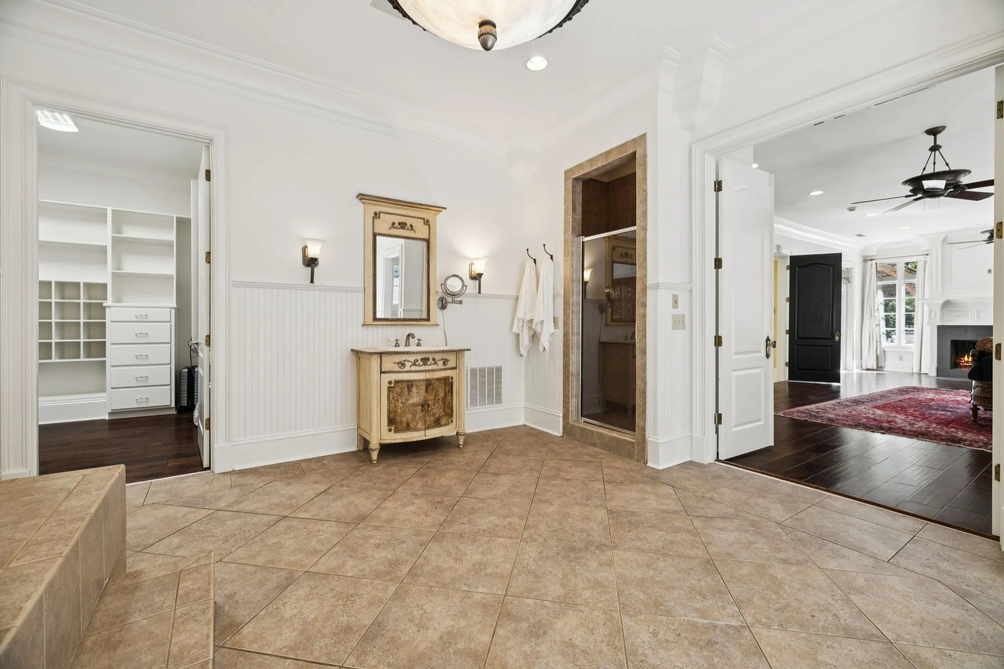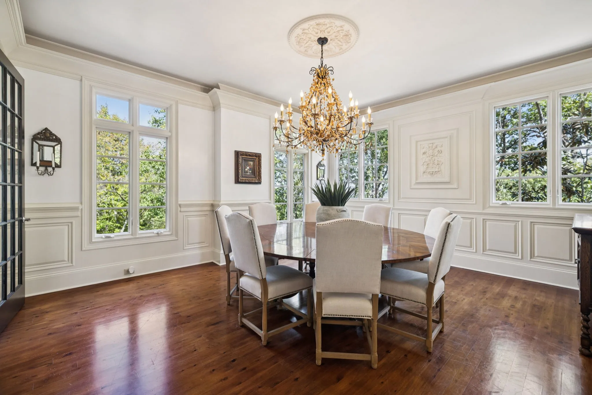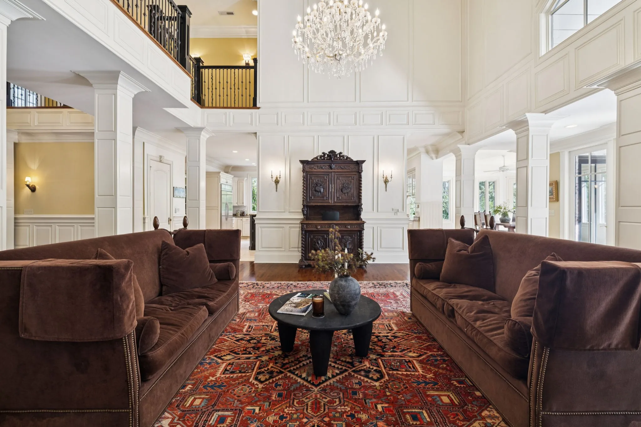 Light-filled and elegantly designed, the home features soaring ceilings, detailed crown moldings, and refined finishes throughout. A distinguished home office evokes classic Ralph Lauren style with rich wood paneling, custom built-in bookcases, and timeless architectural detail, while the formal dining room reflects the refined elegance of a Veranda magazine spread—perfect for memorable gatherings.\n