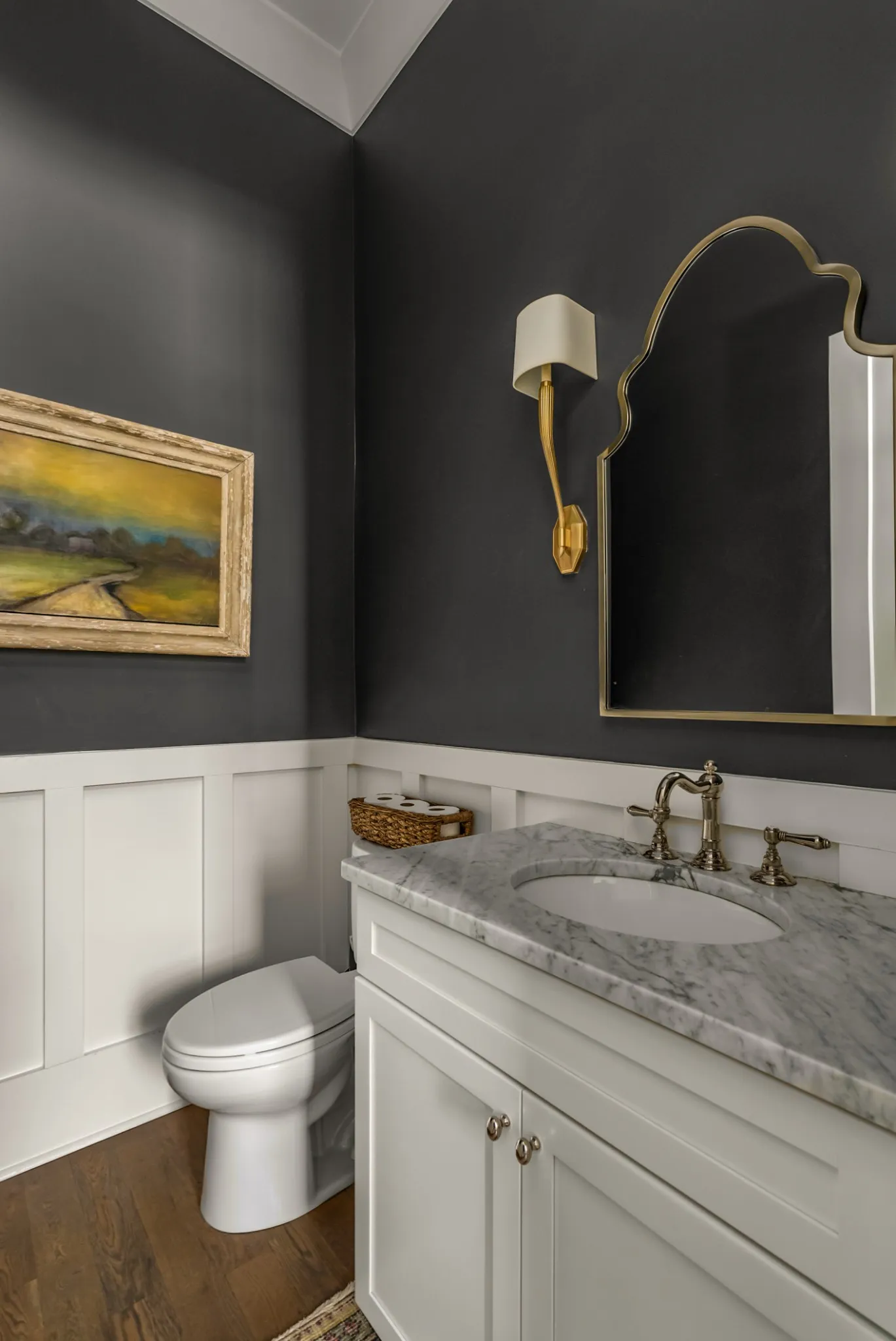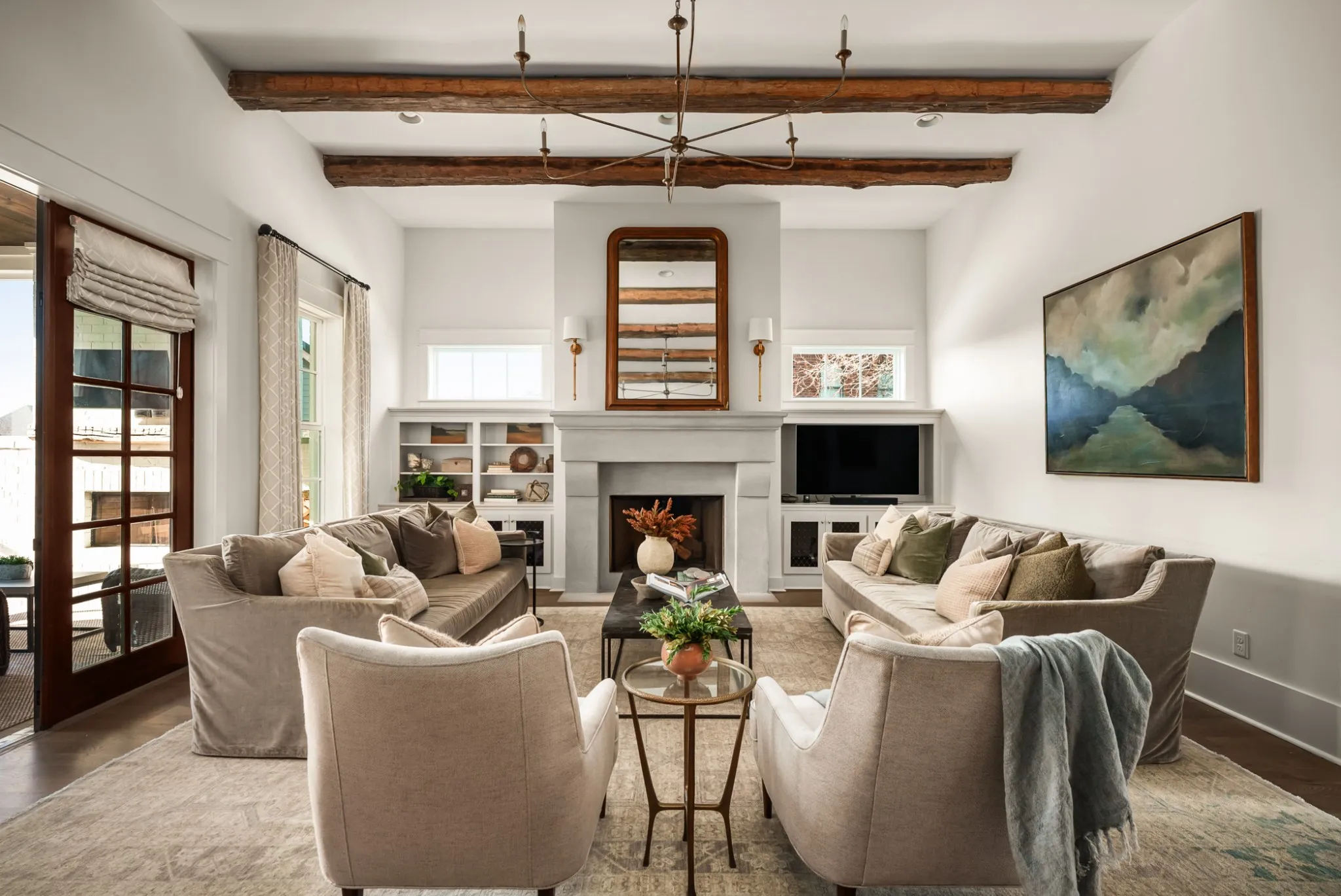 Offering 4,473 square feet, the home includes five bedrooms, four full baths, and one half bath, with spaces that feel intentional and welcoming. Hardwood floors run throughout, and the main living area is anchored by a custom plaster fireplace. Custom cabinetry with brass grille accents imported from the UK and designer lighting from Visual Comfort and Currey and Co elevate the space while remaining warm and functional.