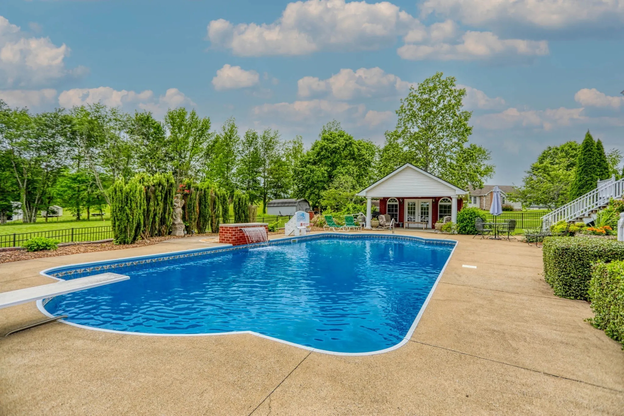Welcome to this breathtaking all-brick home nestled on a serene 2-acre lot across the road from Greenbrier Country Club Golf Course, offering the perfect blend of elegance, comfort, and functionality. Step onto the charming covered front porch and into the grand entry foyer, where you’re greeted by a dazzling chandelier and soaring 19-foot ceilings. The main level features a dedicated home office, a formal dining room with a butler’s pantry, and a spacious living room with built-in shelving, a cozy fireplace, and expansive windows that flood the space with natural light. Step out onto the deck to enjoy a beautiful view of the in-ground pool—perfect for entertaining. The gourmet kitchen is a chef’s dream, boasting tons of cabinetry, a massive 6-foot island, stainless steel appliances including a double oven, refrigerator, and dishwasher, and a cozy 13×12 eat-in nook. Head upstairs via the elegant staircase to find three spacious bedrooms—two share a full bath, while one has its own private en-suite. A convenient laundry chute leads to the laundry room for added ease. On the lower level, the walk-out basement is an entertainer’s paradise with a bar area, fireplace, and ample space for a pool table and ping pong table. Two generous storage rooms (15×14 and 13×11) offer plenty of space, while the three-car garage completes the lower level. The 35×23 bonus room with a fireplace and its own deck offers stunning pool views and endless potential for a game room, home theater, or second living area. Outdoors, enjoy summer fun with a large in-ground pool and pool house complete with a 17×12 shaded canopy area and a private restroom. A blacktop driveway leads to the impressive 40×24 shop with a concrete floor and electricity—ideal for hobbies, storage, or a home business. This property truly has it all—space, luxury, and thoughtful laid out.