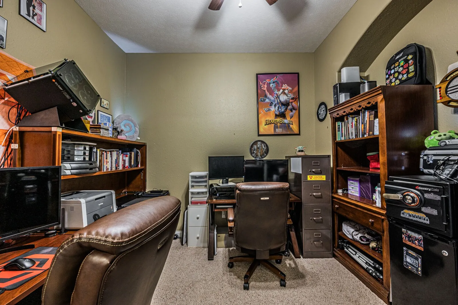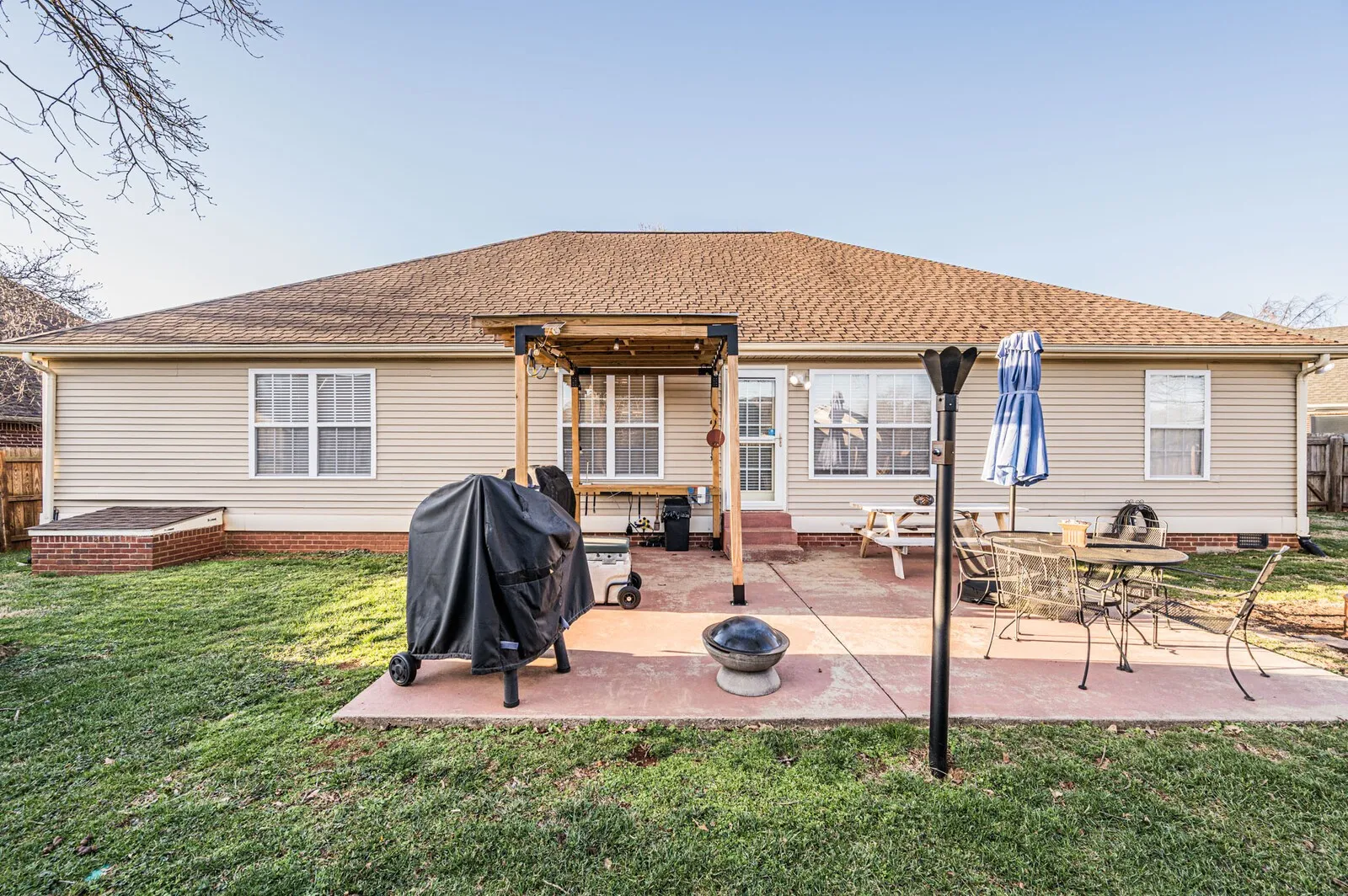 This great home offers a covered porch, beautiful archway details, and a spacious great room ideal for everyday living and entertaining. A dedicated office with French doors provides the perfect work-from-home space. Neutral paint throughout creates a bright, inviting feel, while the kitchen offers tons of cabinet space for ample storage. Step outside to enjoy the patio and fenced-in backyard, complete with a storage building. Centrally located on a quiet cul-de-sac, the home also features neighborhood sidewalks for easy strolls and added community charm.