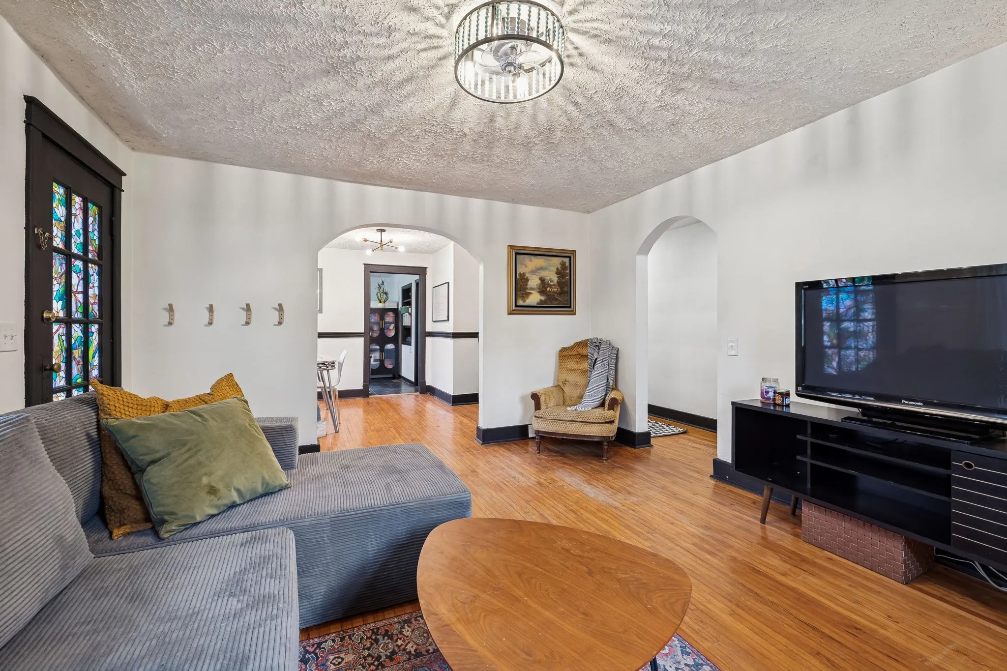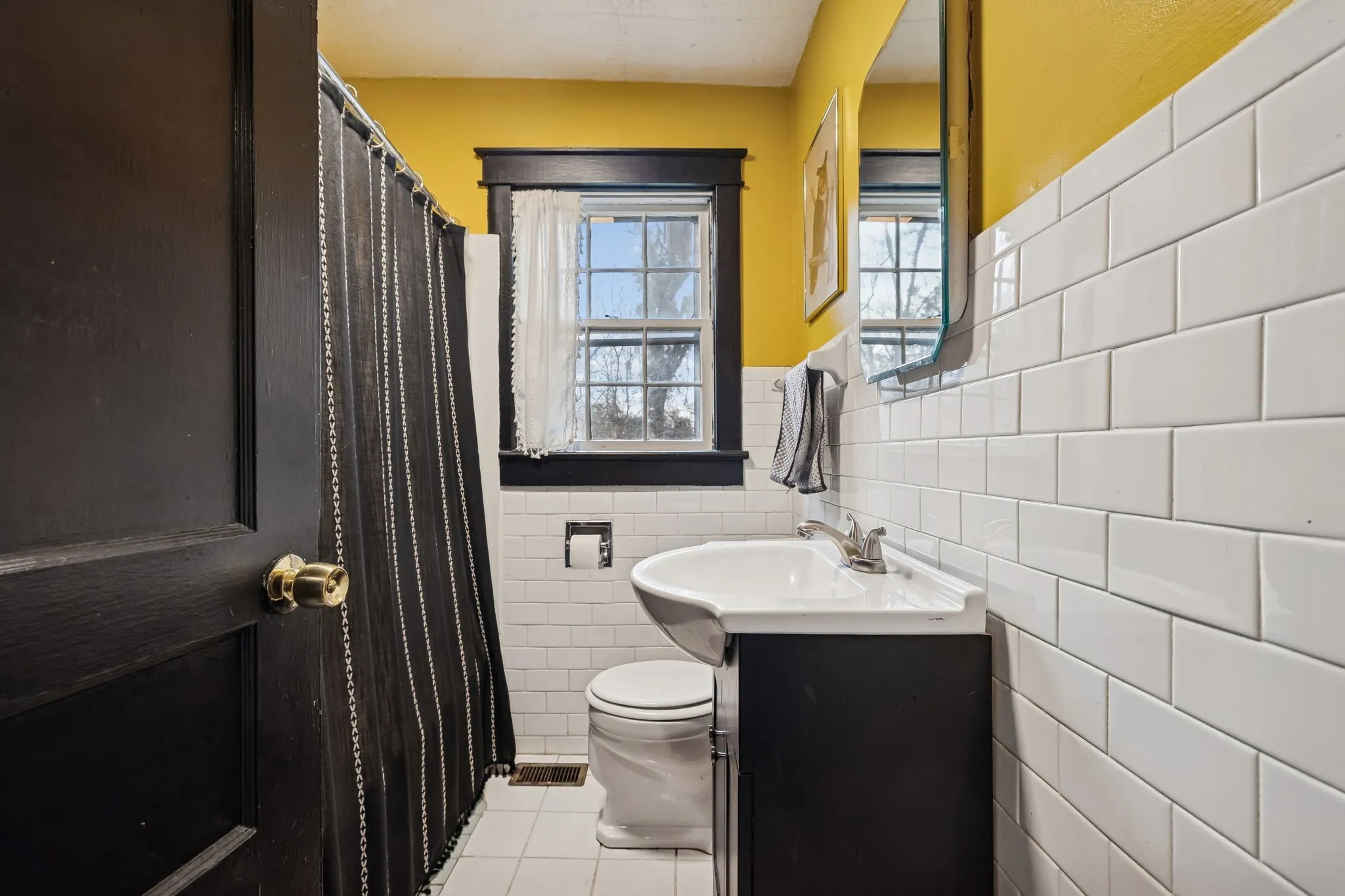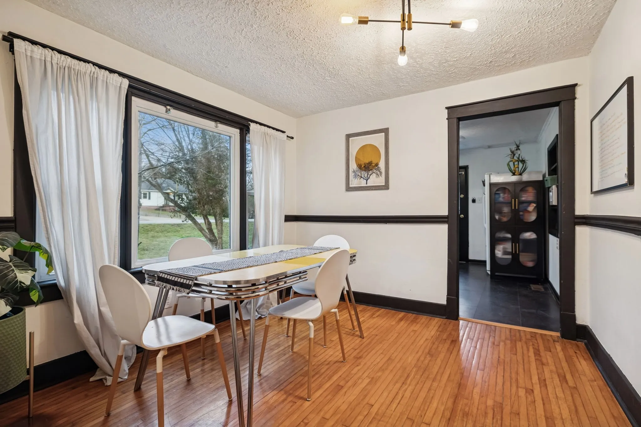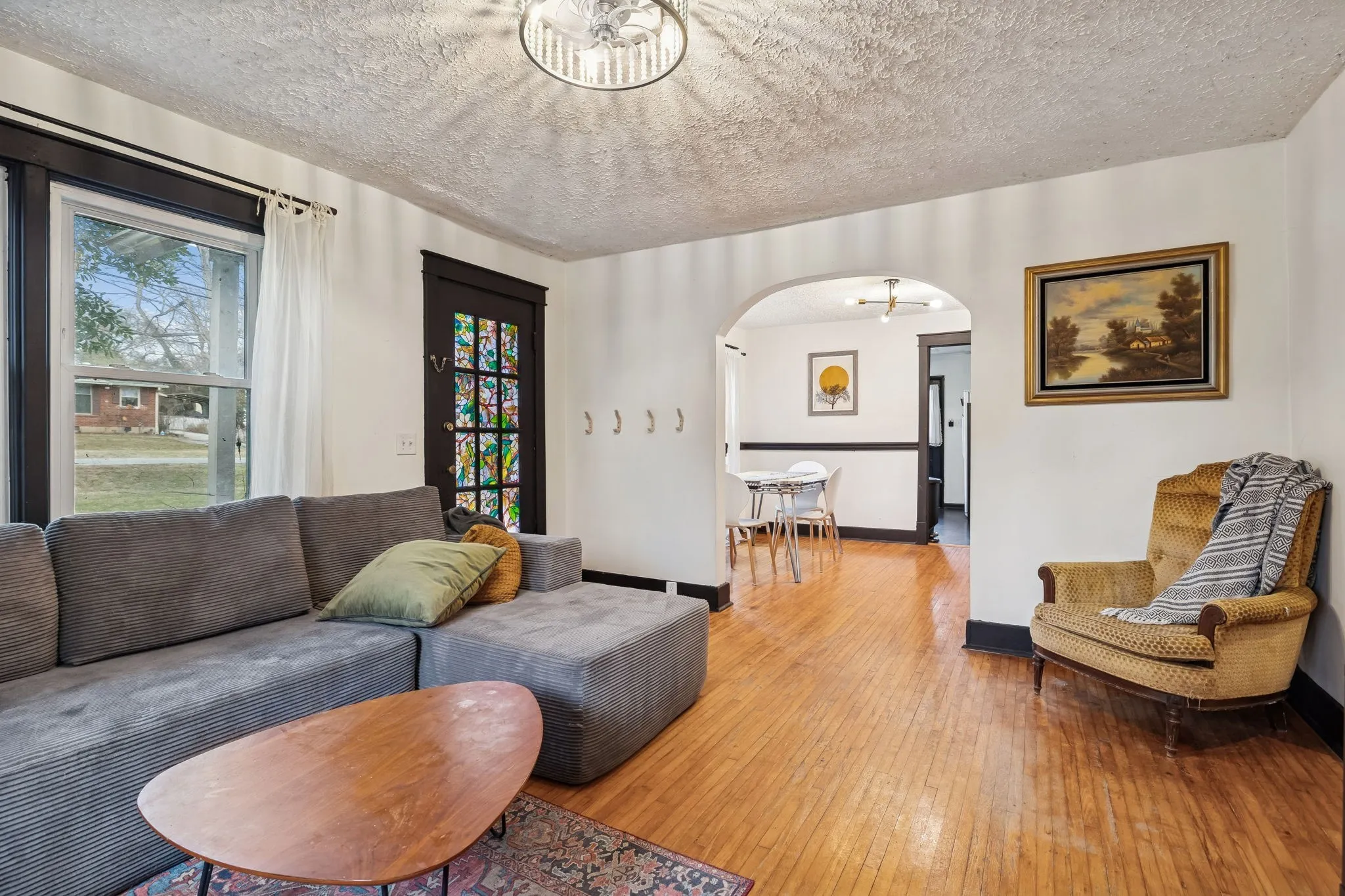 Inside, you’ll find original hardwood floors throughout the main living areas, a warm and inviting living room, and a light-filled, functional layout. The kitchen features new flooring (December 2022), freshly painted cabinets, built-in shelving, and updated lighting that complements the home’s vintage character. The bathroom adds a fun nod to the past with a 1950s-era laundry chute, while major peace of mind comes with a new HVAC system installed in April 2024.