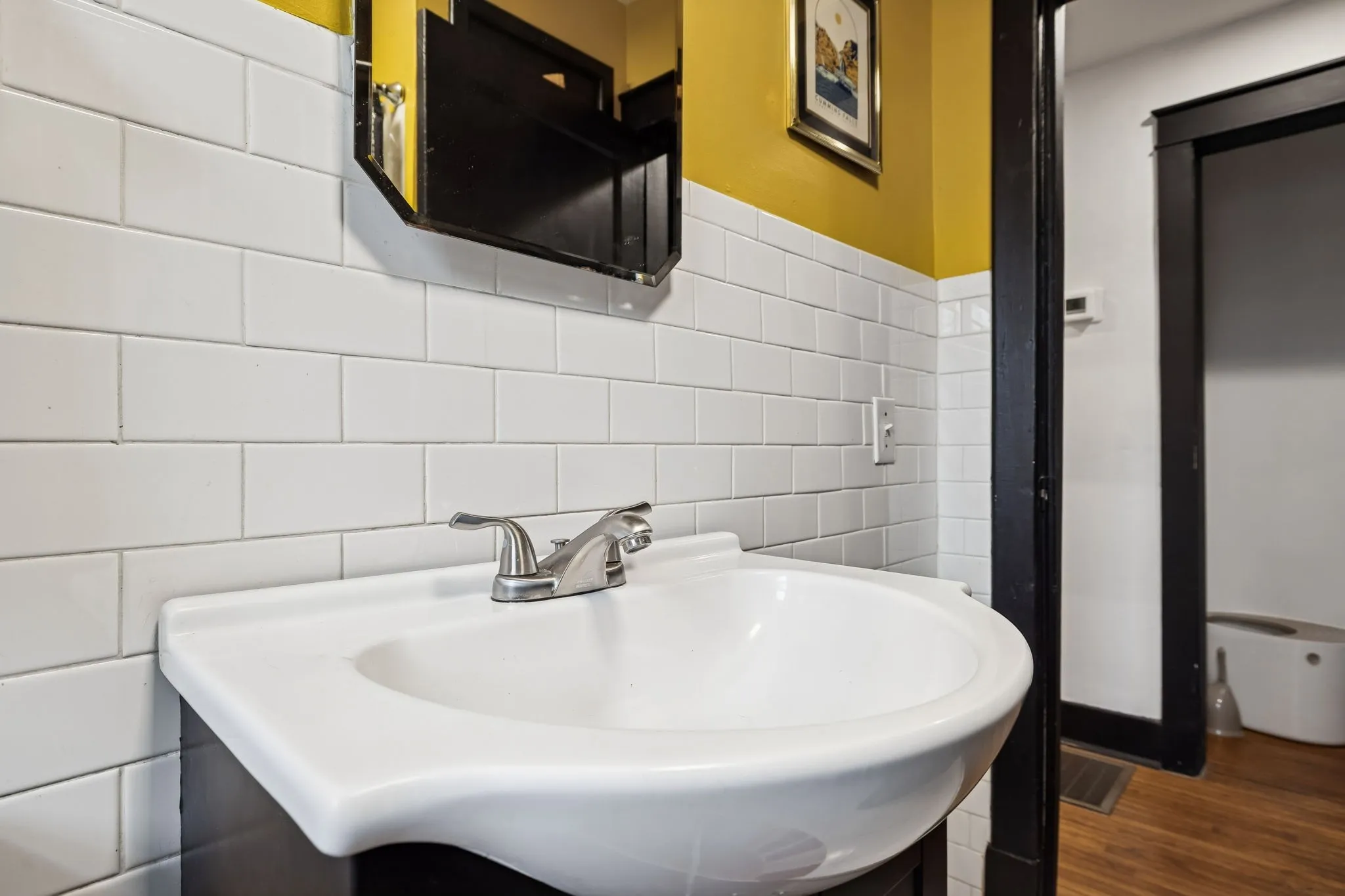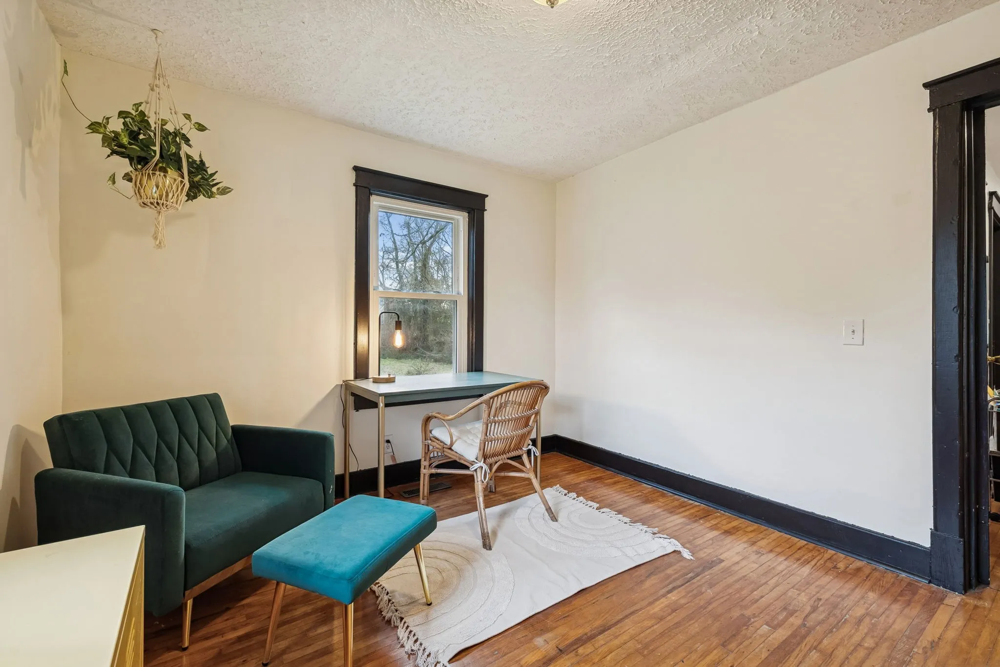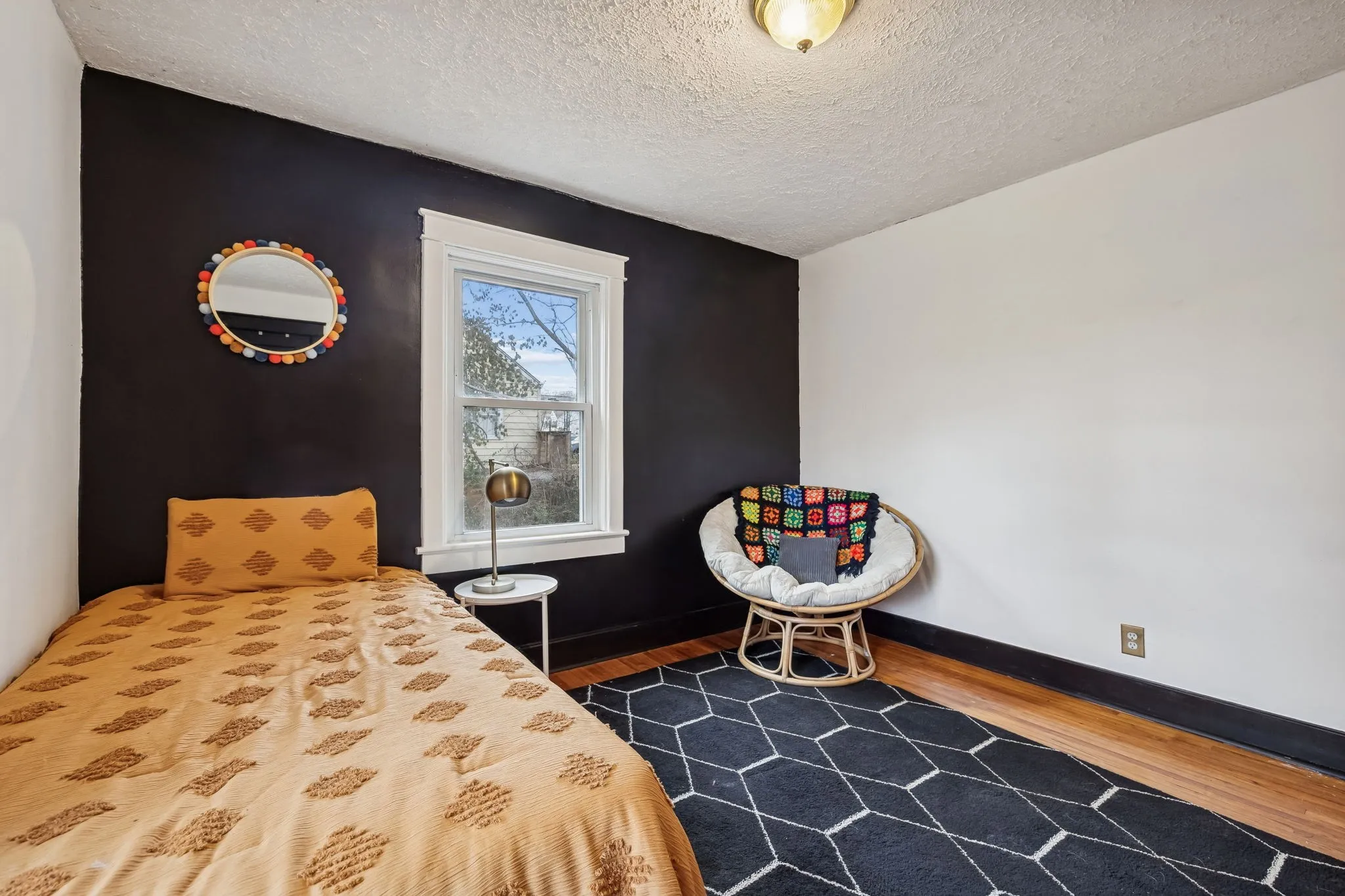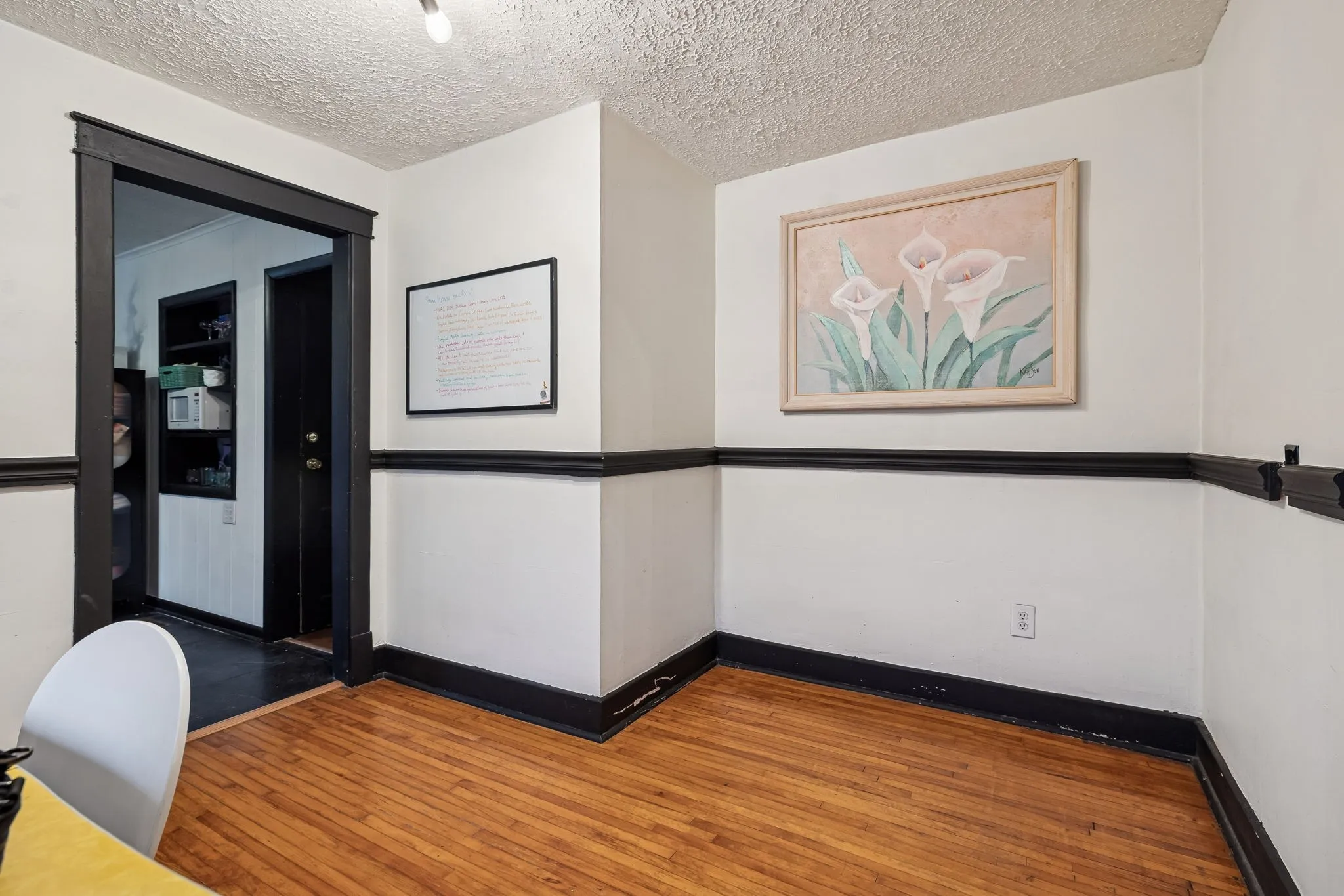Inside, you’ll find original hardwood floors throughout the main living areas, a warm and inviting living room, and a light-filled, functional layout. The kitchen features new flooring (December 2022), freshly painted cabinets, built-in shelving, and updated lighting that complements the home’s vintage character. The bathroom adds a fun nod to the past with a 1950s-era laundry chute, while major peace of mind comes with a new HVAC system installed in April 2024.