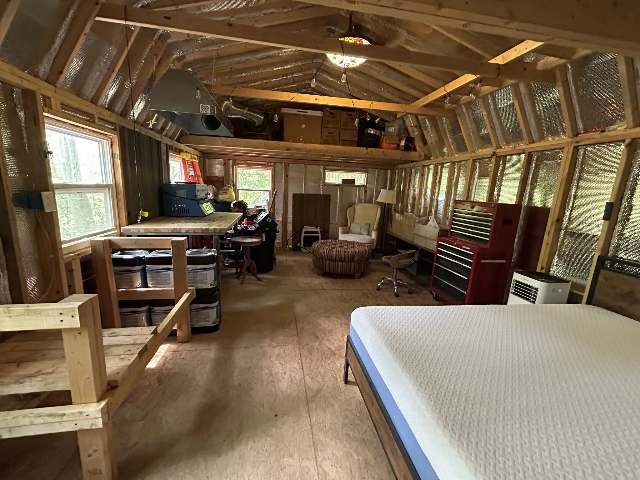 The cabin features newly installed electric (up to code), a ceiling fan, and access to city water and WiFi. City electric meter is already in place. Generator, propane heater, and portable AC all stay.