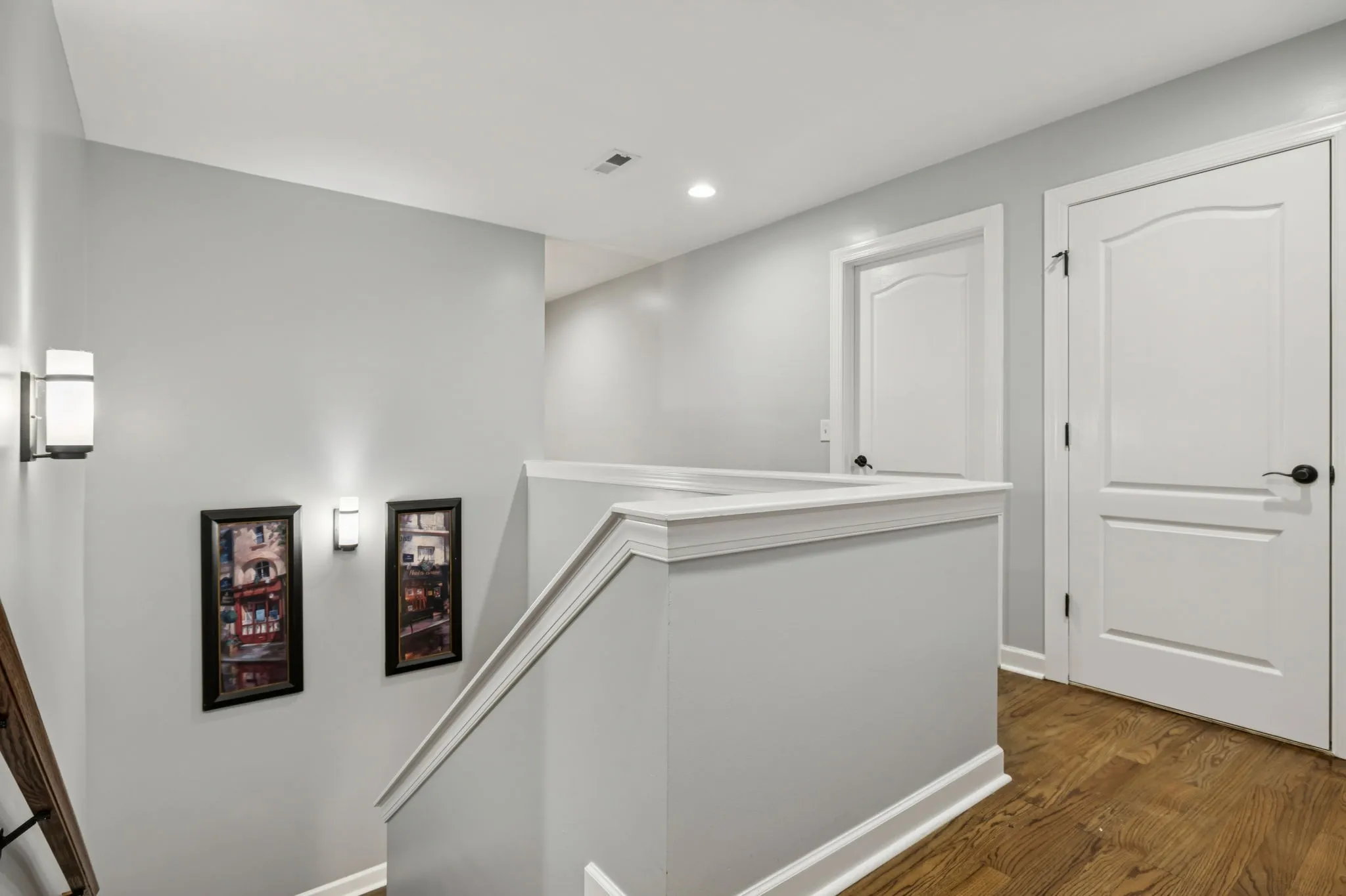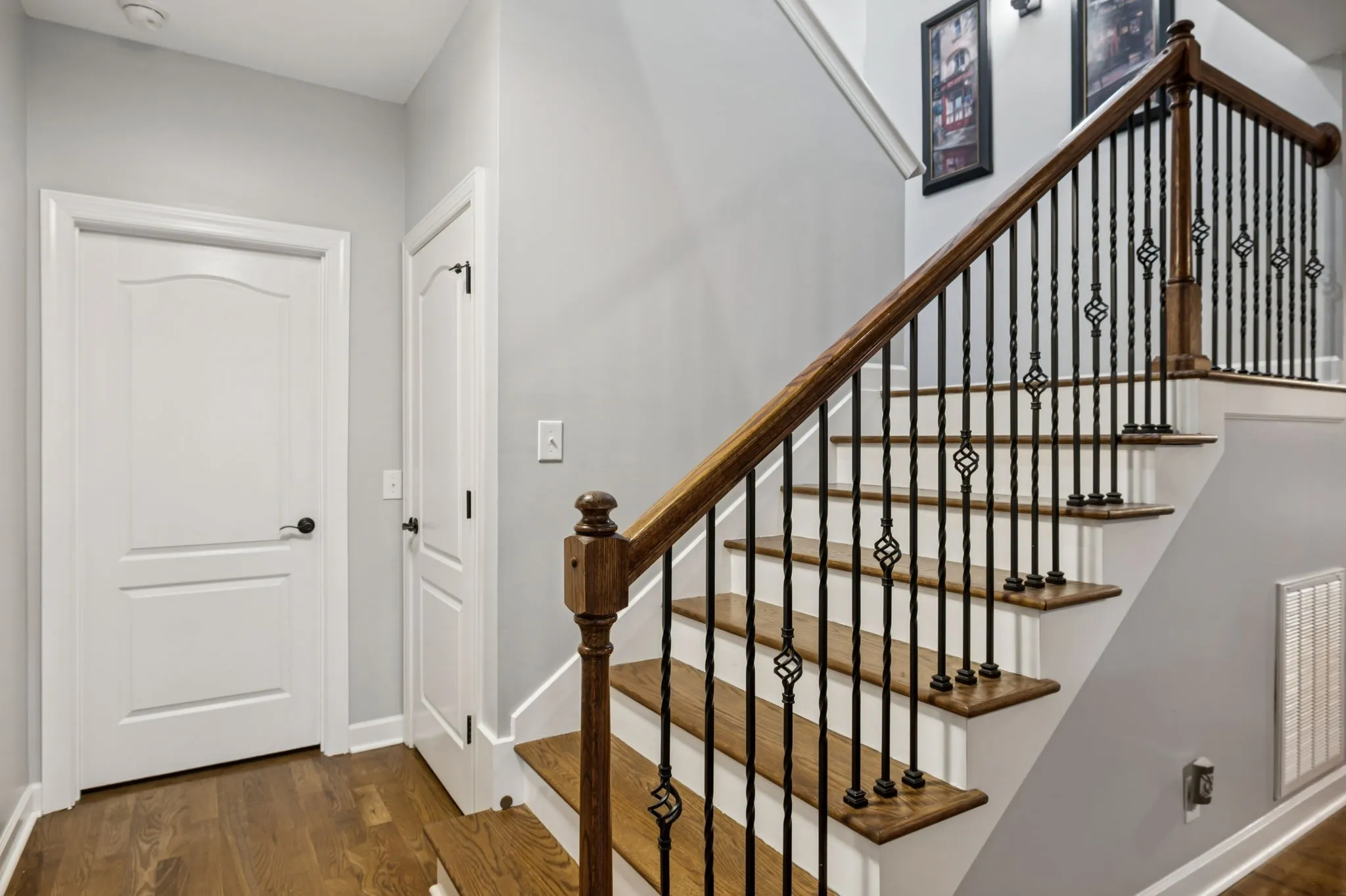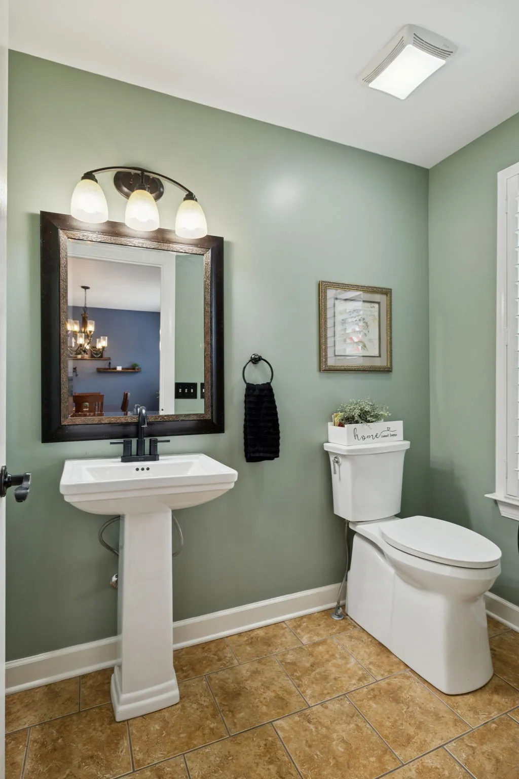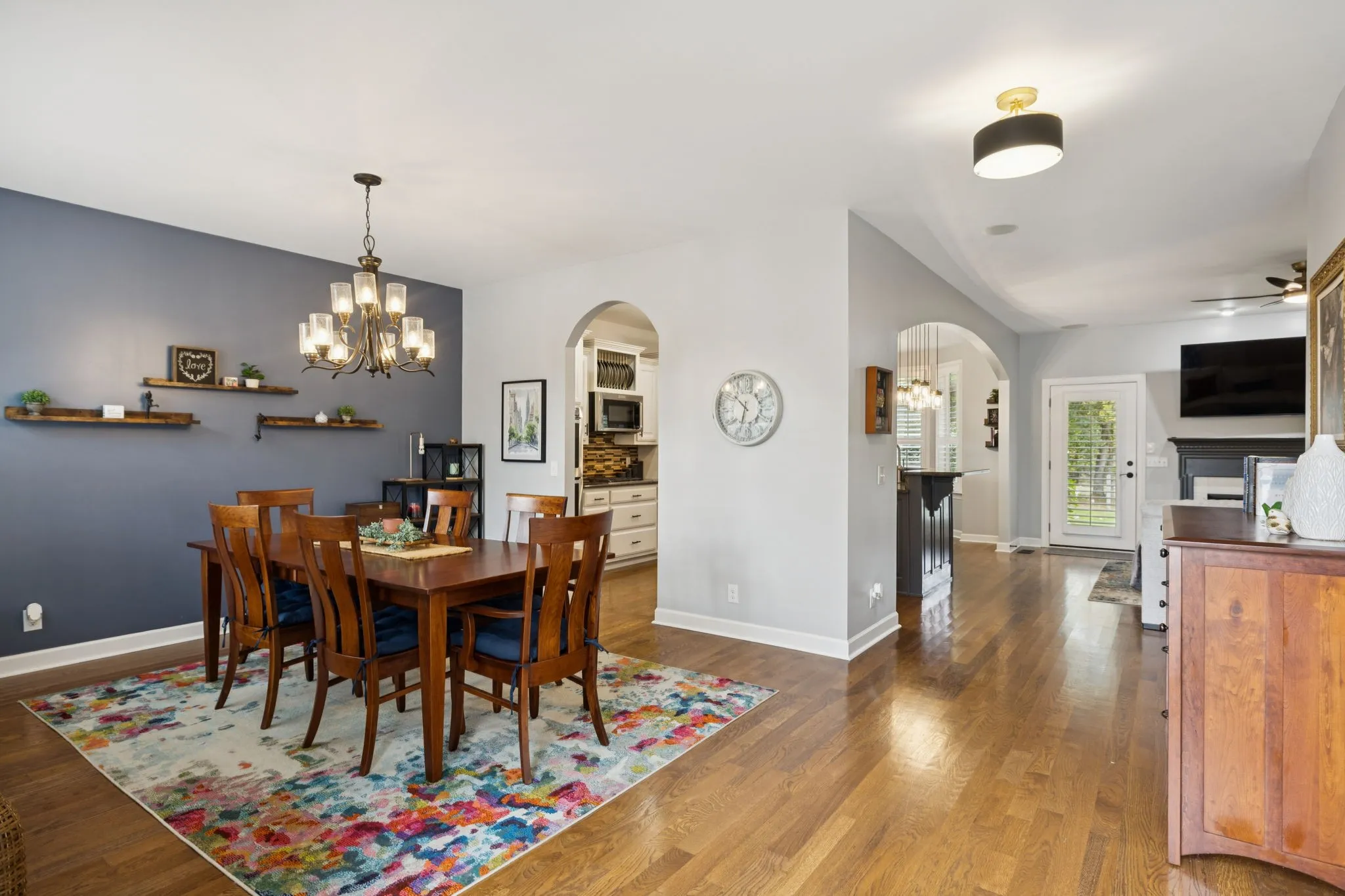 Inside, you will find hardwood floors throughout & no carpet. Fresh paint, new lighting & bath fixtures, and plantation shutters create a bright and inviting interior. The foyer opens to a formal dining room and a spacious great room with a gas log fireplace & access to the covered patio and outdoor living. Surround sound is installed throughout the home, and a main-level half bath adds convenience.