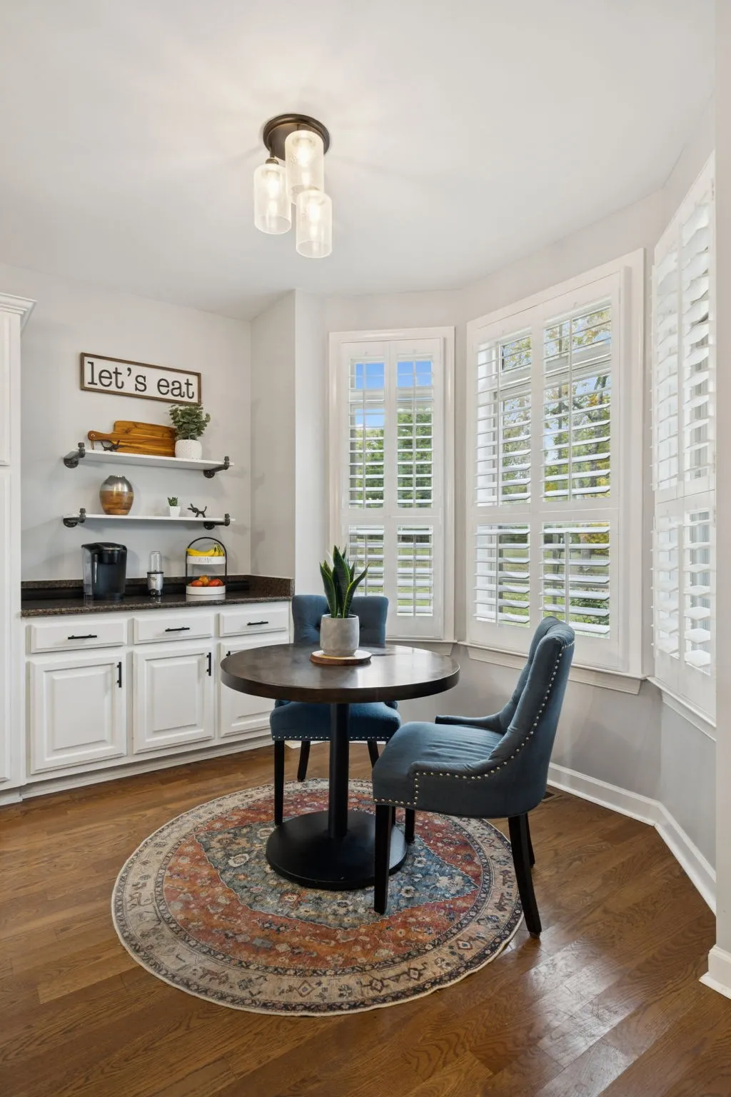 The kitchen features white cabinetry, granite countertops, stainless steel appliances, a breakfast bar, buffet and coffee station, bay-window dining, pantry, and double ovens. Large laundry with drop zone.