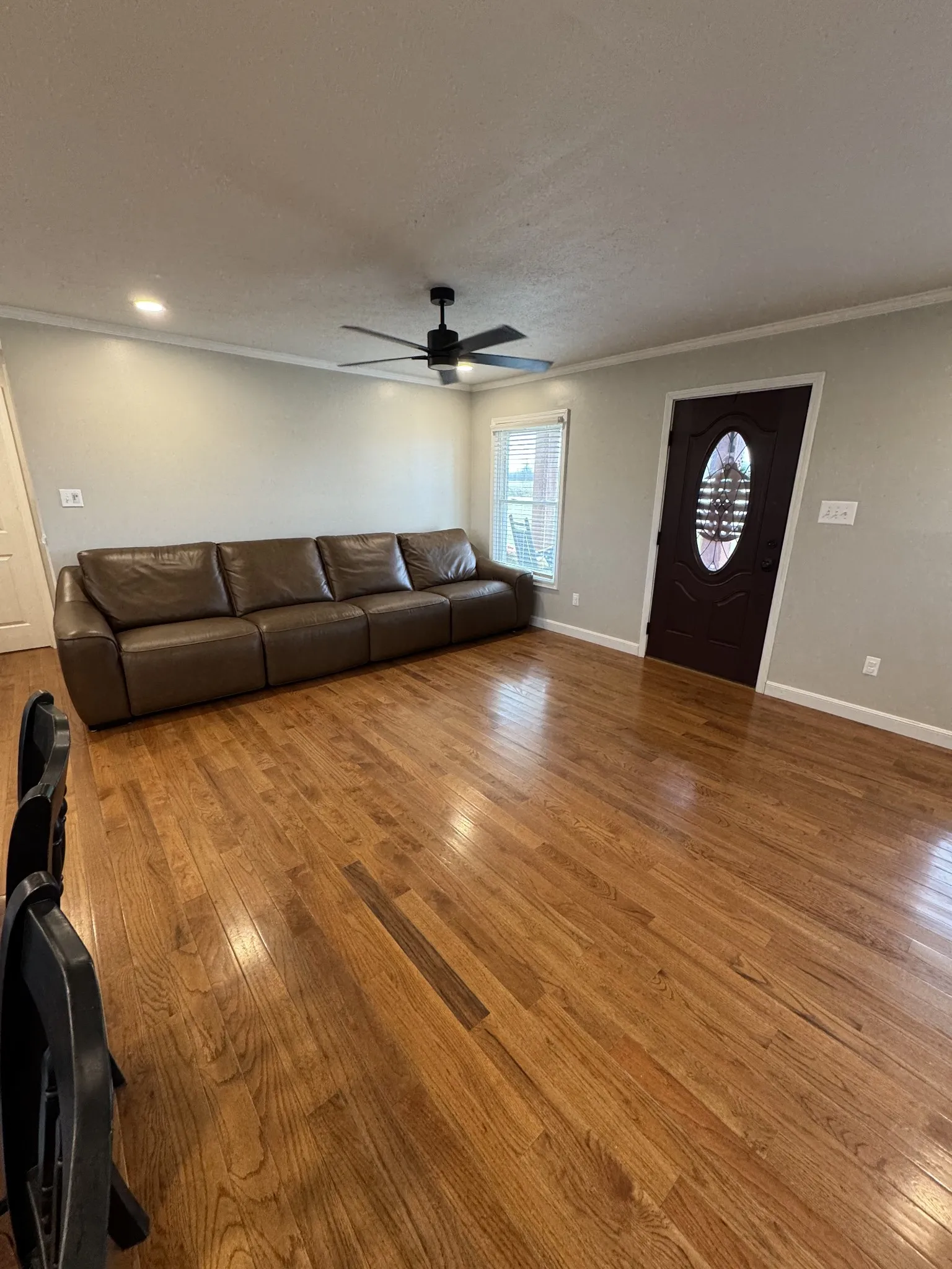 Inside, the home offers a bright, open layout that flows easily from the living area into the updated kitchen. The kitchen features white cabinetry, granite countertops, stainless steel appliances, and ample workspace for everyday living and entertaining. Neutral paint tones along with hardwood and tile flooring throughout create a clean, welcoming feel.