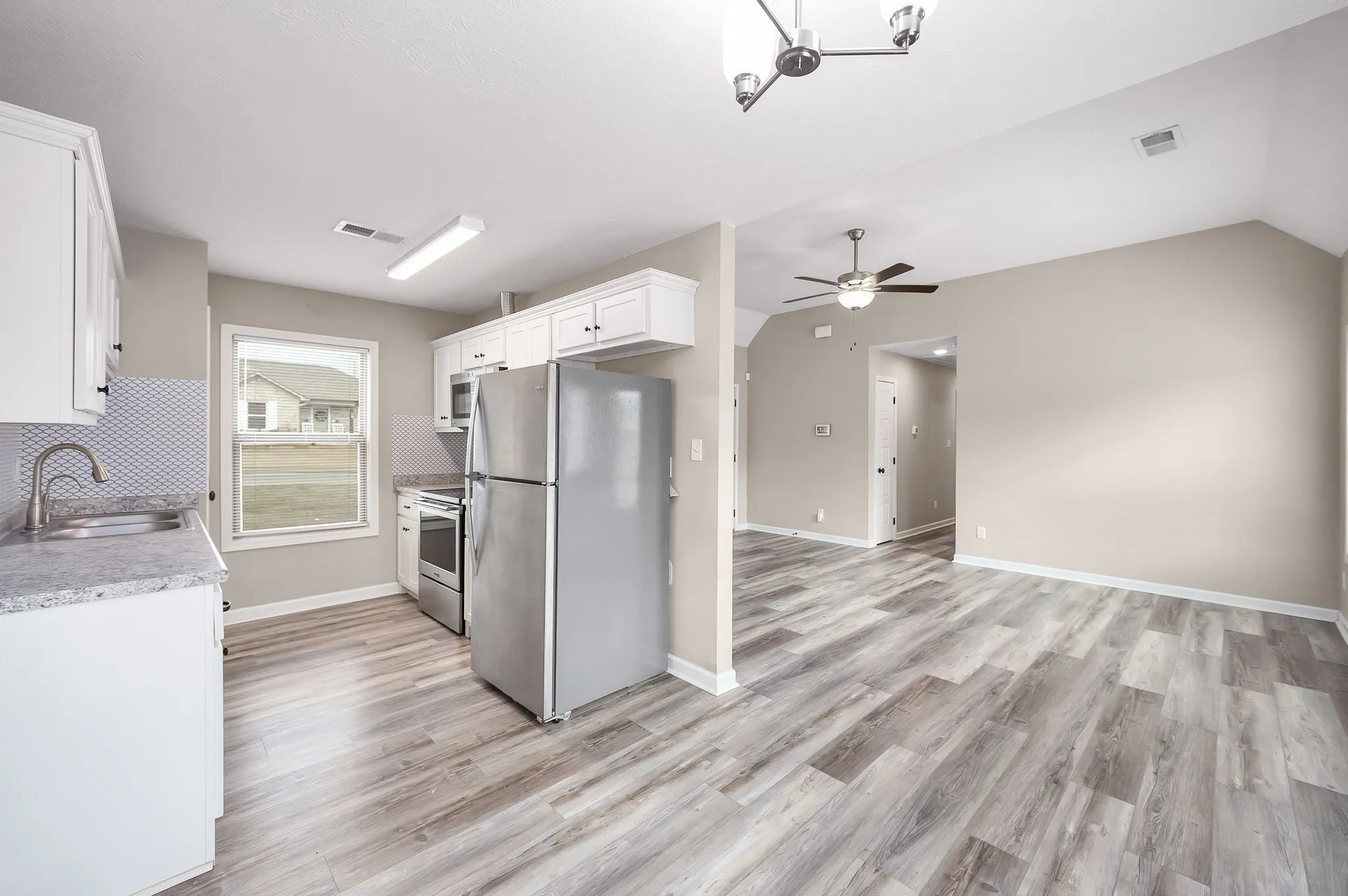 Like-new construction built in 2023, this 3-bedroom, 2-bath home offers efficient one-level living with a practical layout. Main living areas feature durable flooring, while all bedrooms include carpet for added comfort. The open kitchen and living space provides a functional flow and comes furnished with stainless steel appliances, including the refrigerator. Situated on a manageable lot in Brownsville with easy access to local amenities. Move-in ready with modern systems and finishes throughout.