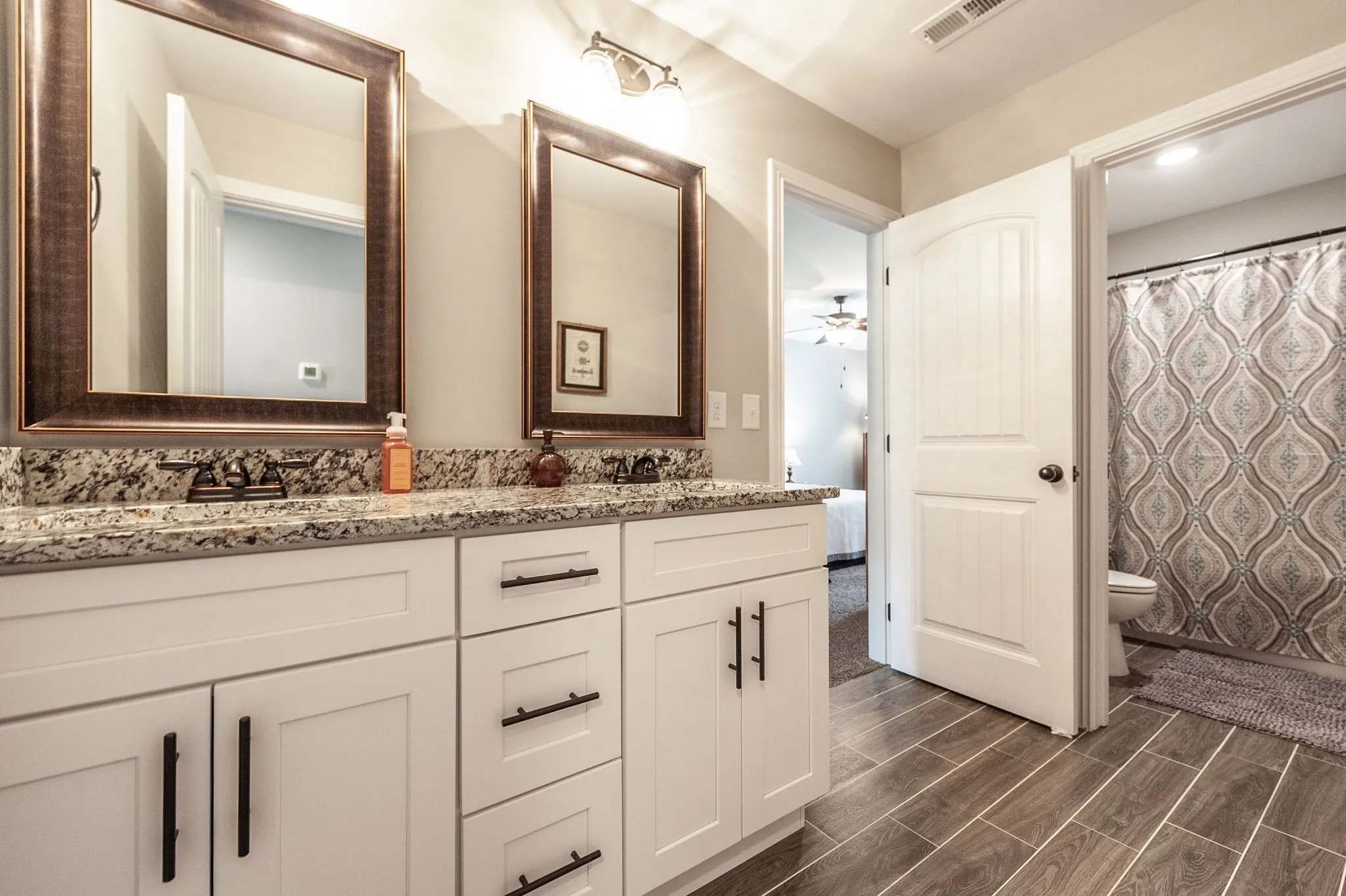 From the moment you step onto the charming covered front porch and through the double doors, this home will leave you breathless. Inside a shiplap-accented foyer and gleaming hardwood floors set the tone for style and warmth. The gourmet kitchen is a dream with white cabinetry featuring glass fronts, granite counters, a tile backsplash, rustic wood ceiling beams, and a huge island with a farmhouse sink – All Open to a Cozy Great Room with a Stunning Stone Gas Fireplace with Raised Hearth. The primary retreat is your sanctuary with a soaking tub, walk in shower, double vanities and walk in closet. Full Finished Basement with Full Bath. Garage seems like a