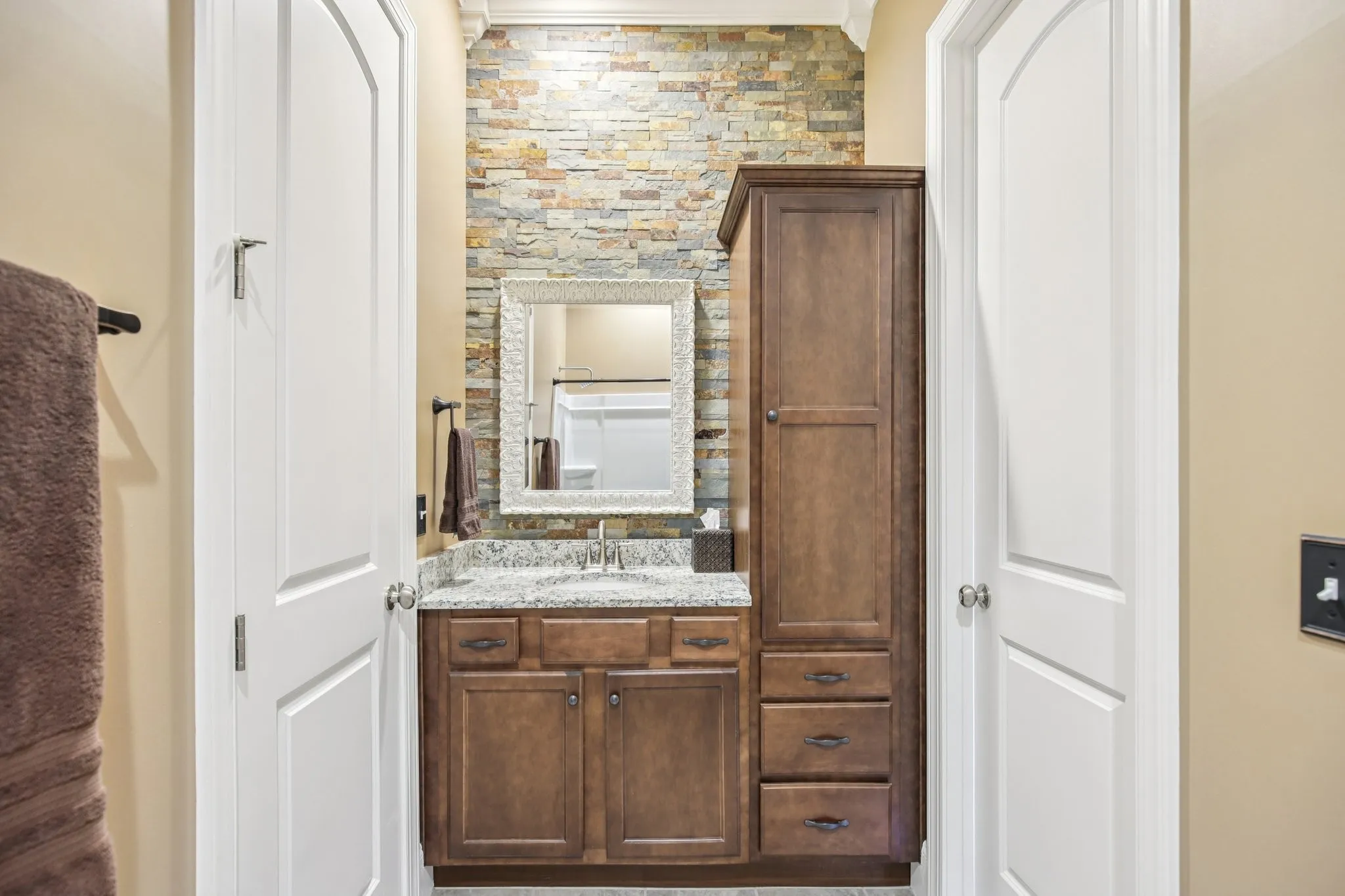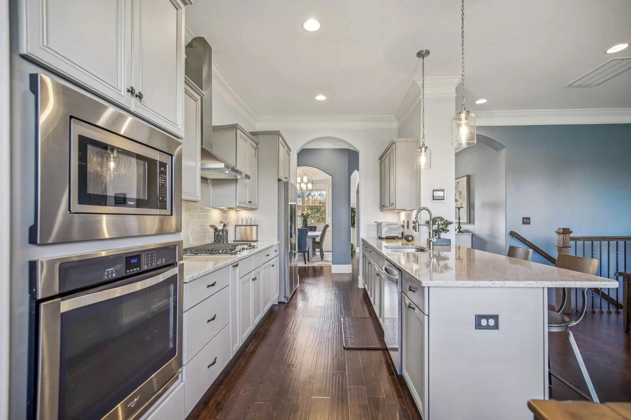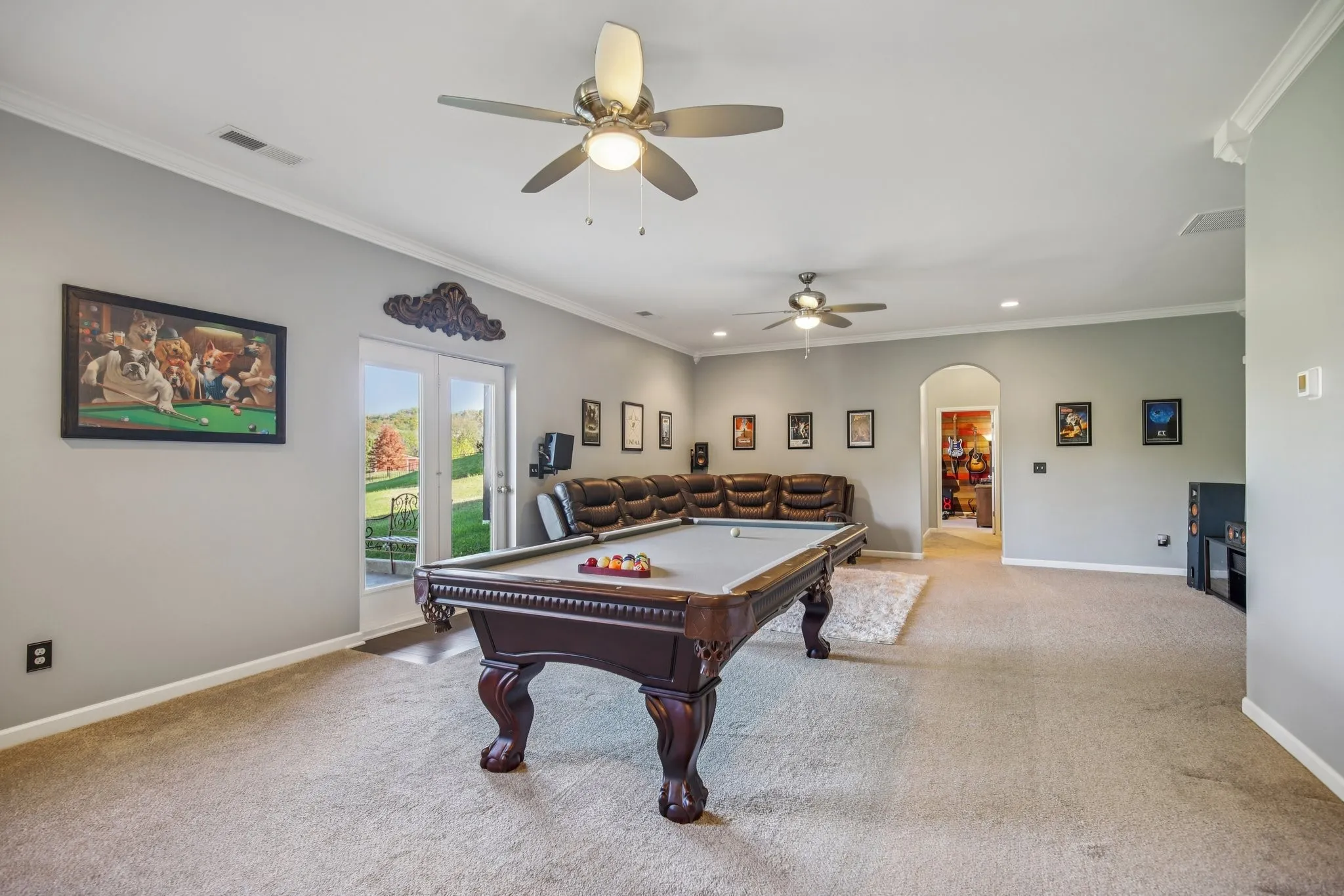 Inside, discover elegant arched hallways, 10-foot ceilings with 8-foot doors, accent walls, crown molding, and wainscoting that add warmth and character throughout. The open-concept layout is perfect for entertaining, highlighted by a stunning stone fireplace and large windows that fill the home with natural light. The gourmet kitchen features granite countertops, stainless steel appliances, and ample cabinetry.\n