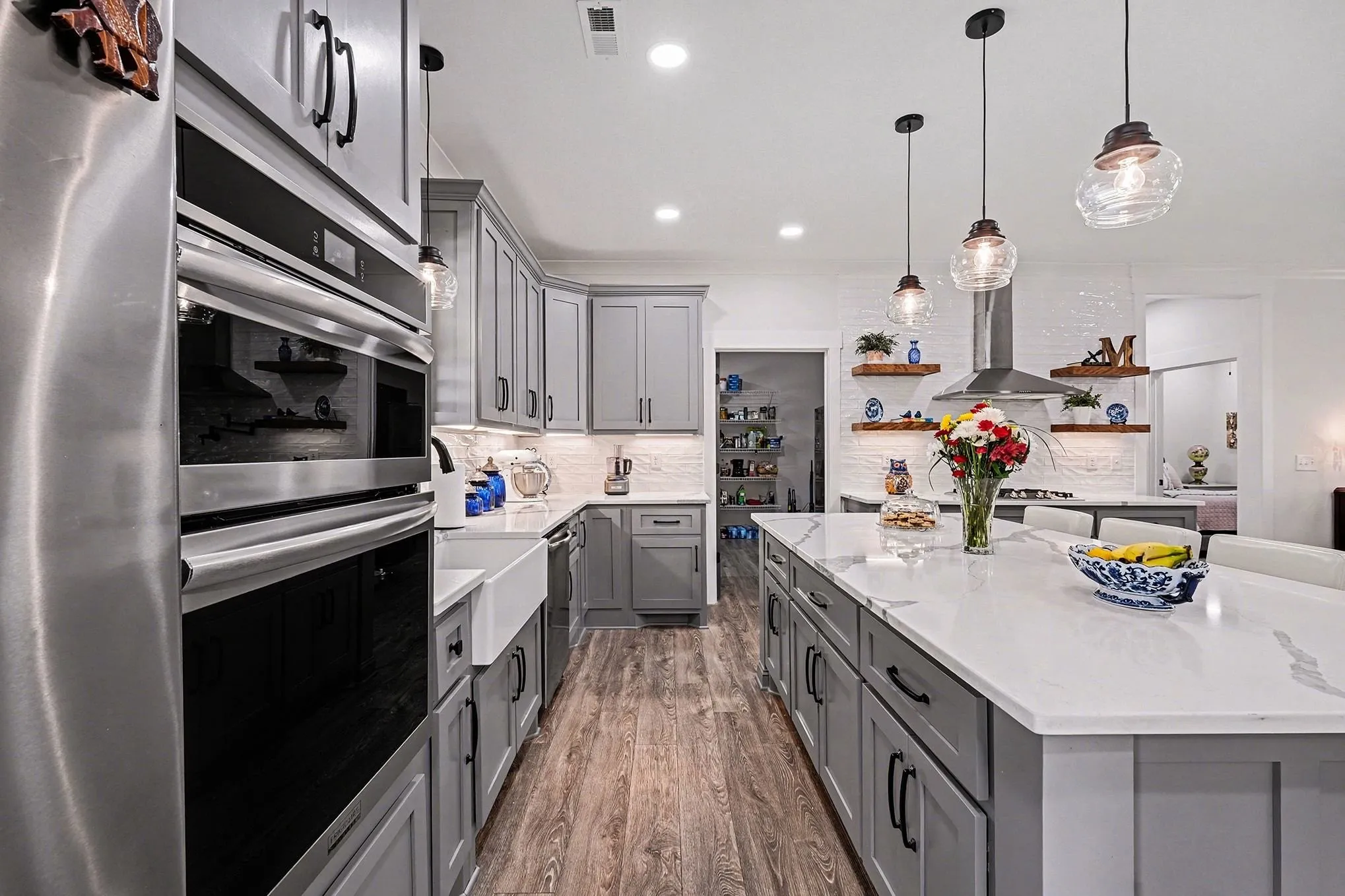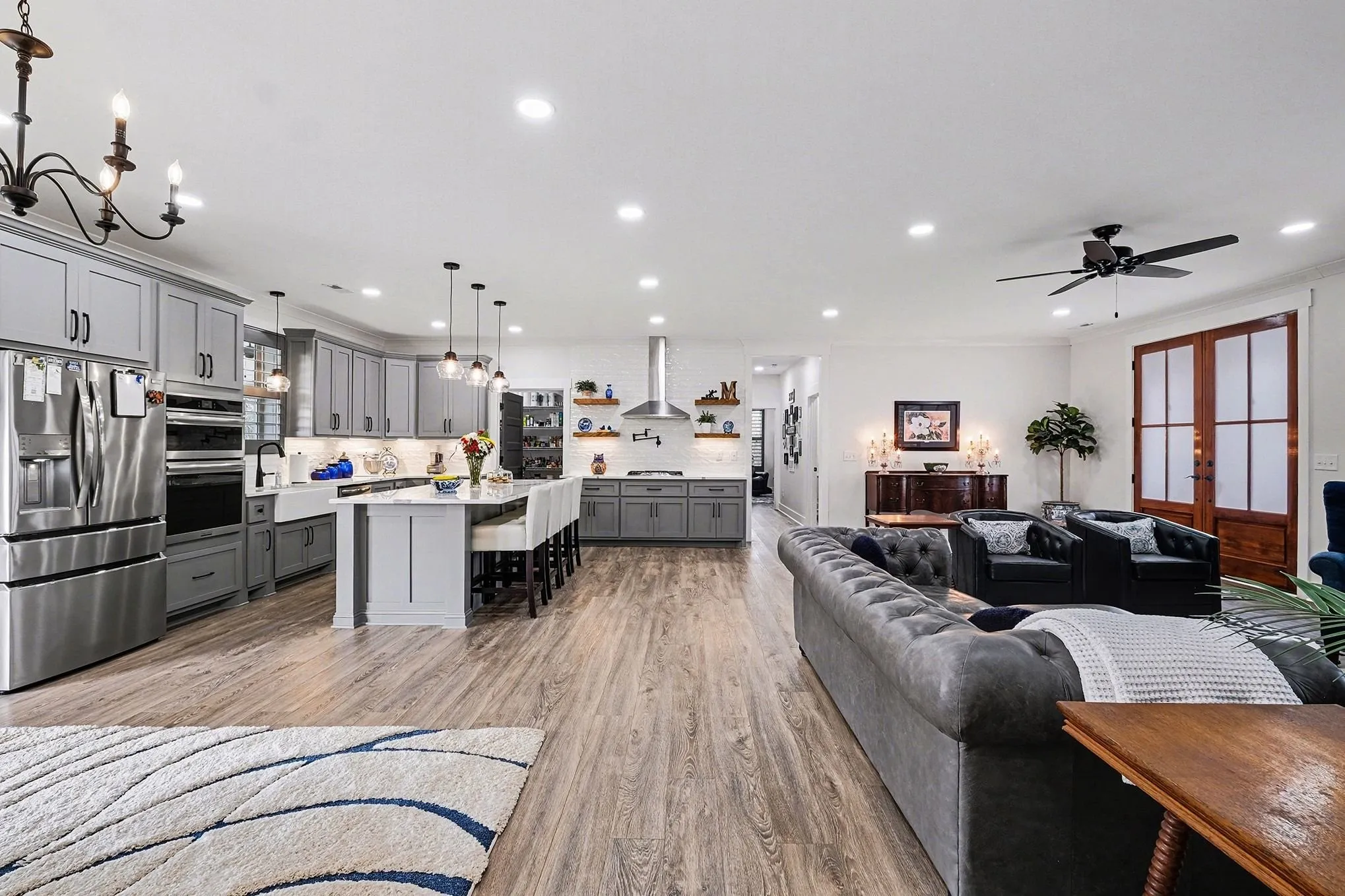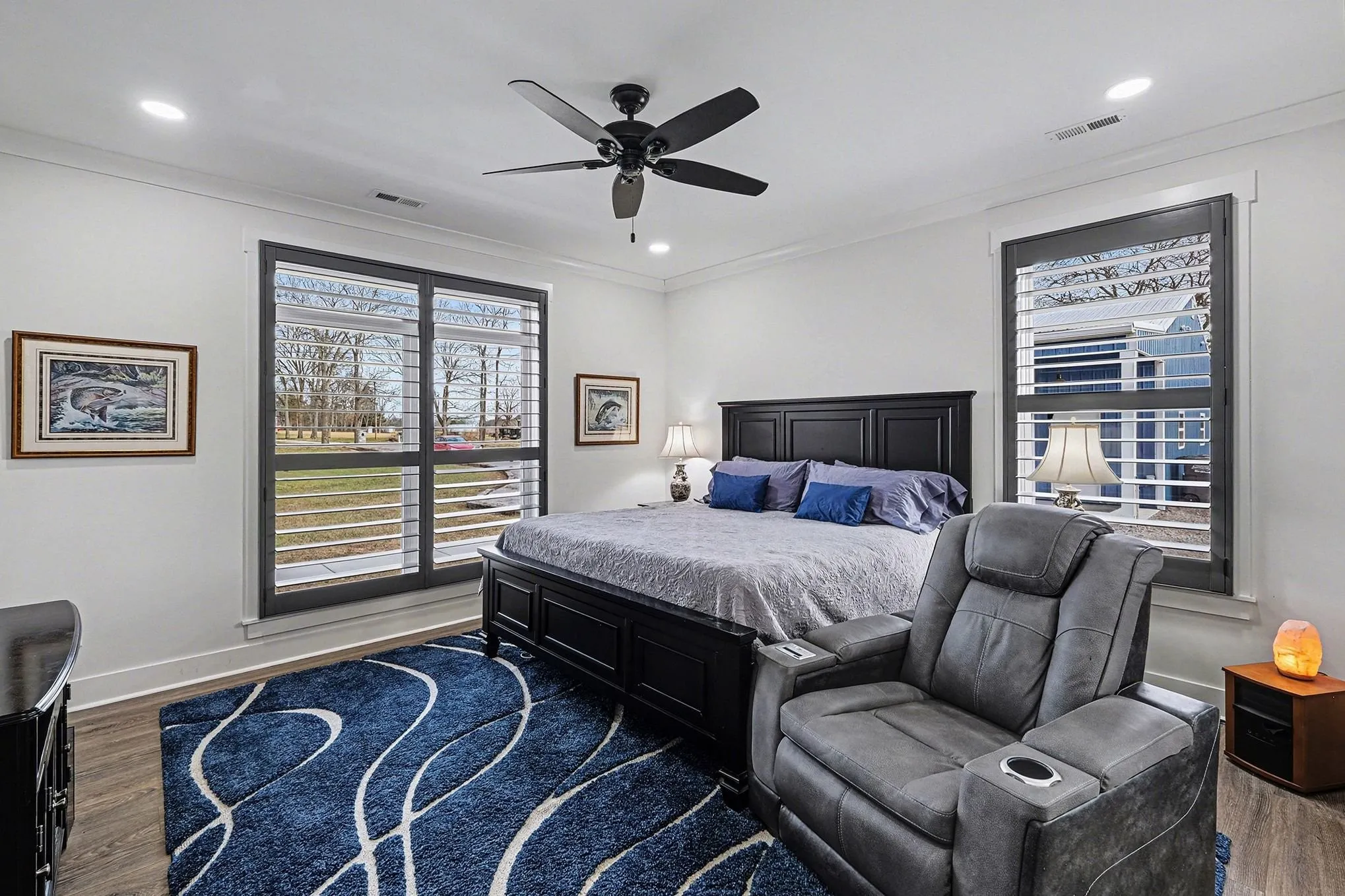 Outdoor Style: Barn-style lights and Hunter Fans adorn all porches, perfect for enjoying a quiet evening outdoors.\n