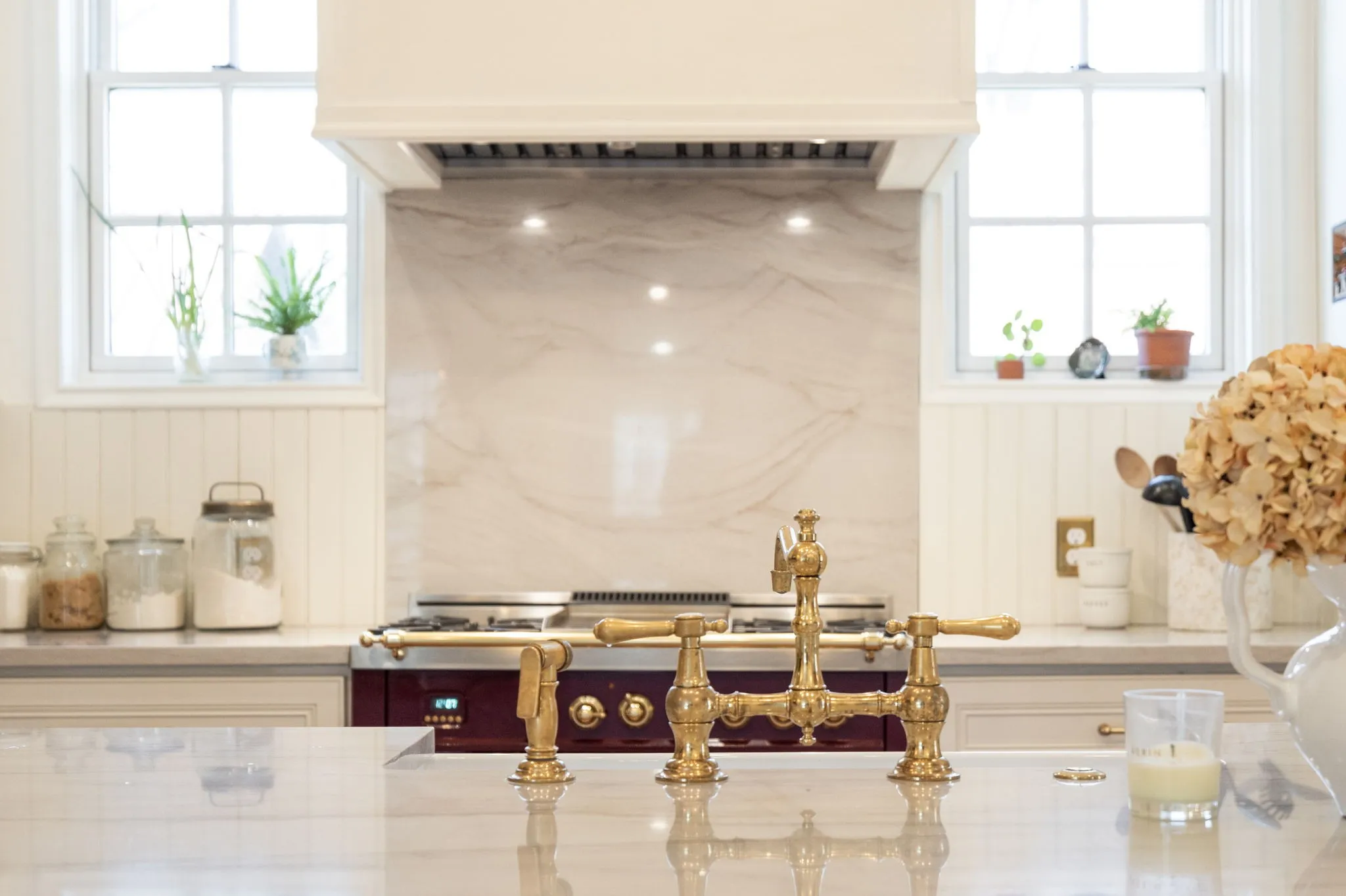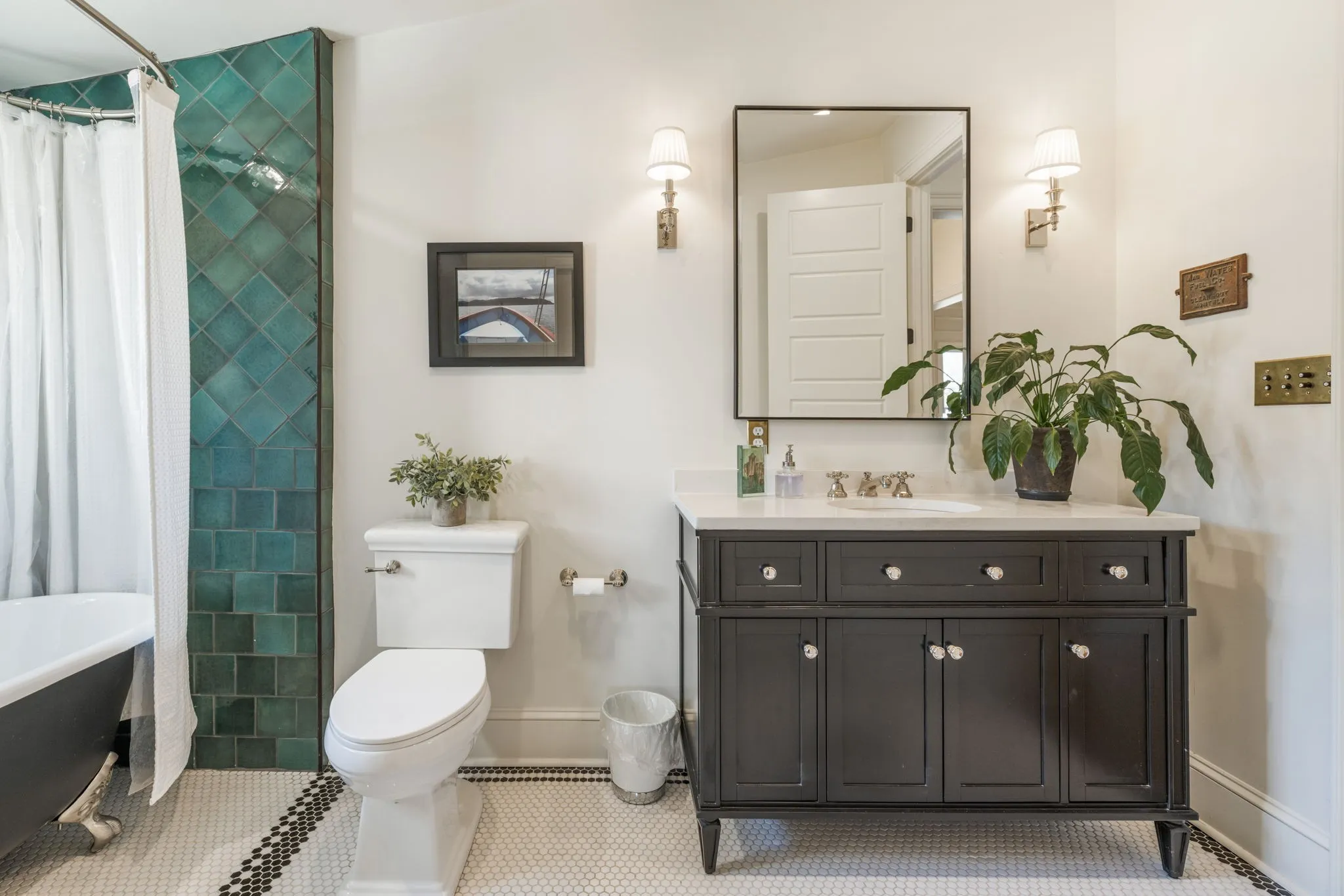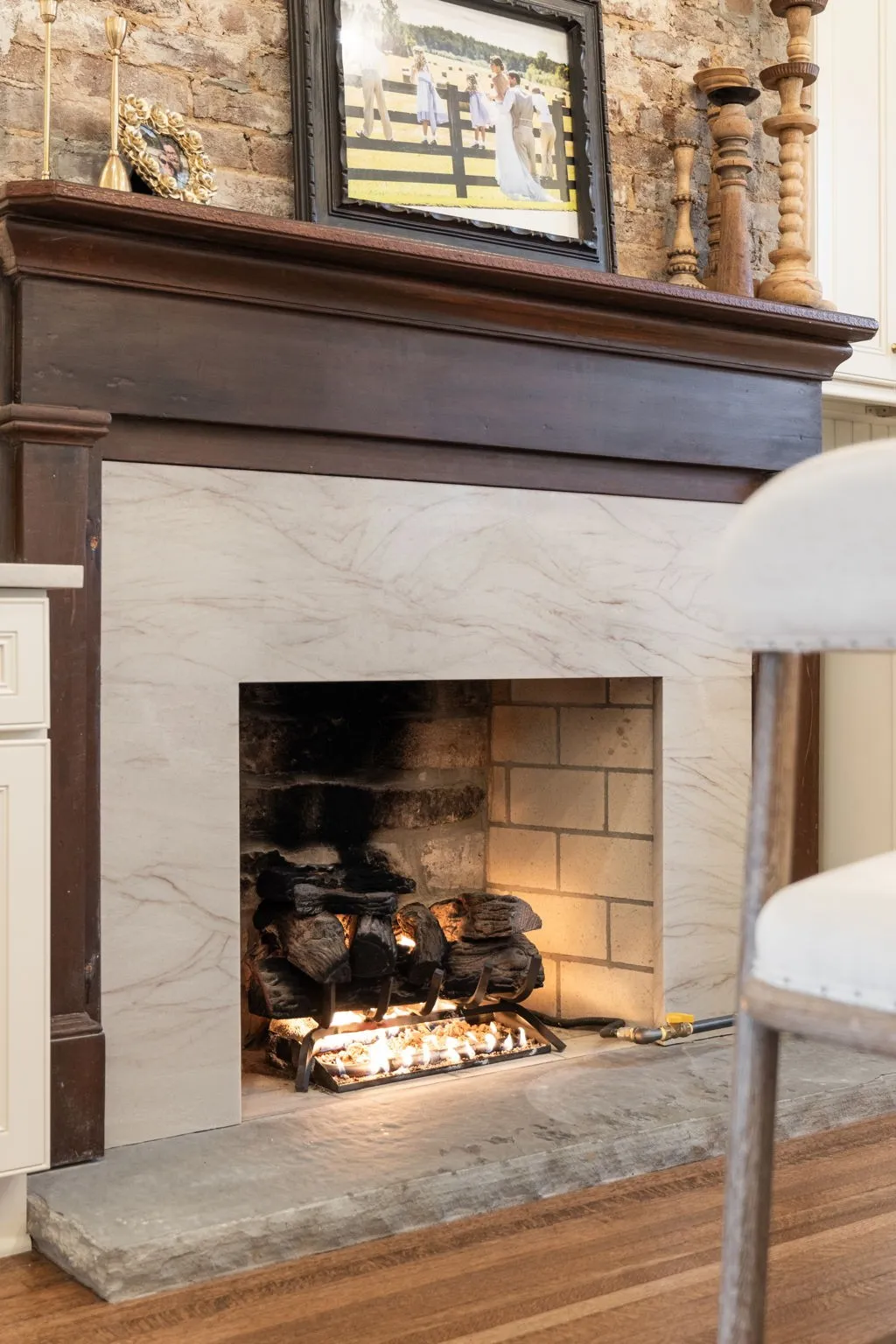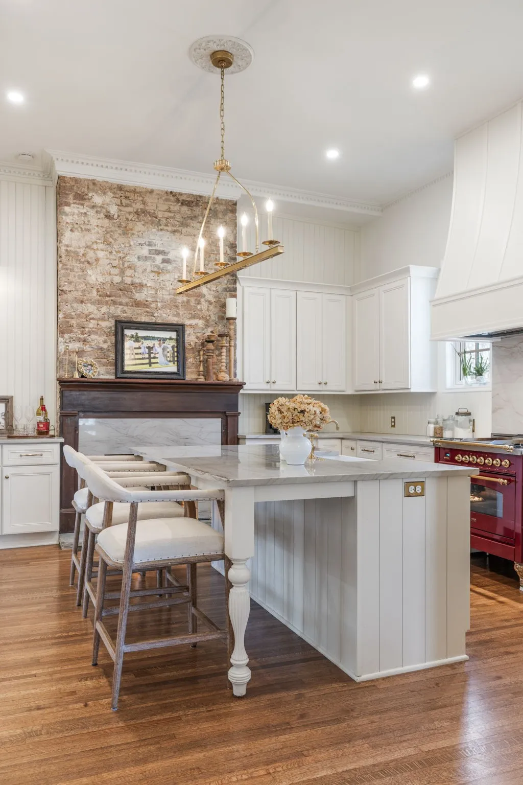 The living spaces are anchored by restored stone fireplaces and designer lighting. The kitchen and baths feature custom cabinetry, quartzite countertops, Carrara honed marble, and high-end appliances. The primary bath includes heated floors, a frameless shower, and refined finishes, while the secondary bath showcases a classic clawfoot tub that honors the home’s historic roots.