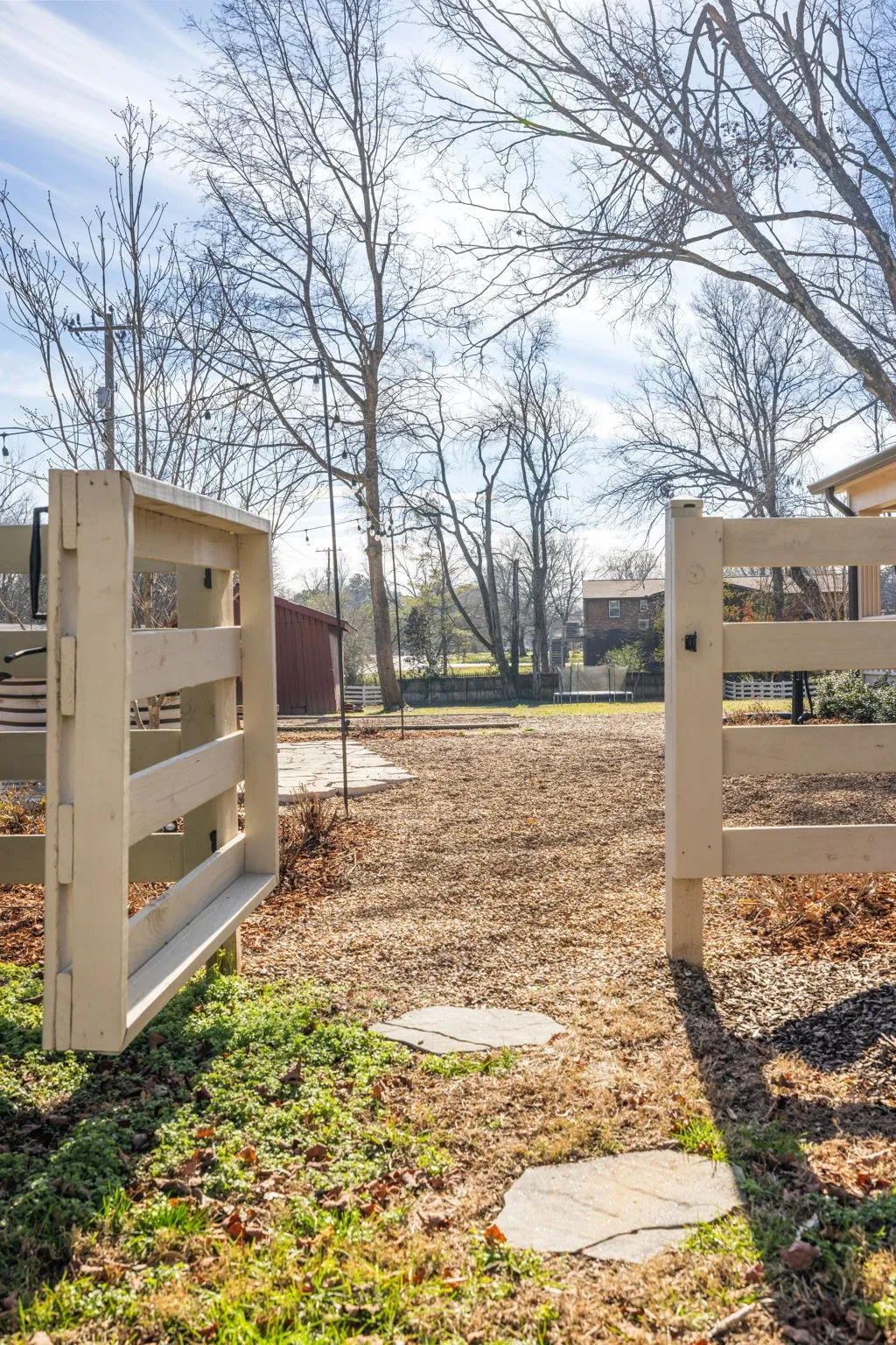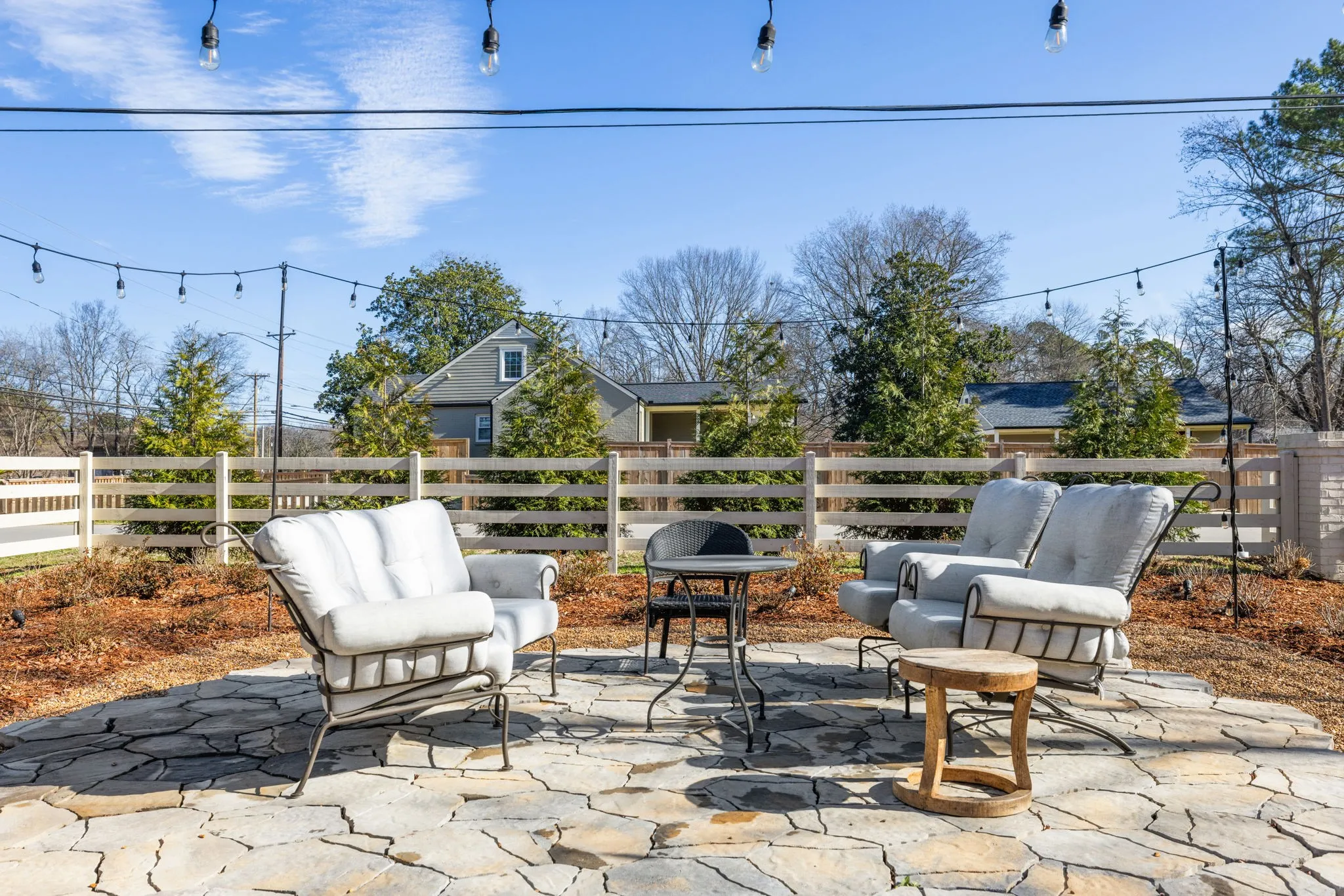 Outdoor living is equally impressive with a fully fenced property, gated entry, irrigated landscaping, stone patio with bistro lighting, pea gravel walkways, and period-correct exterior details.