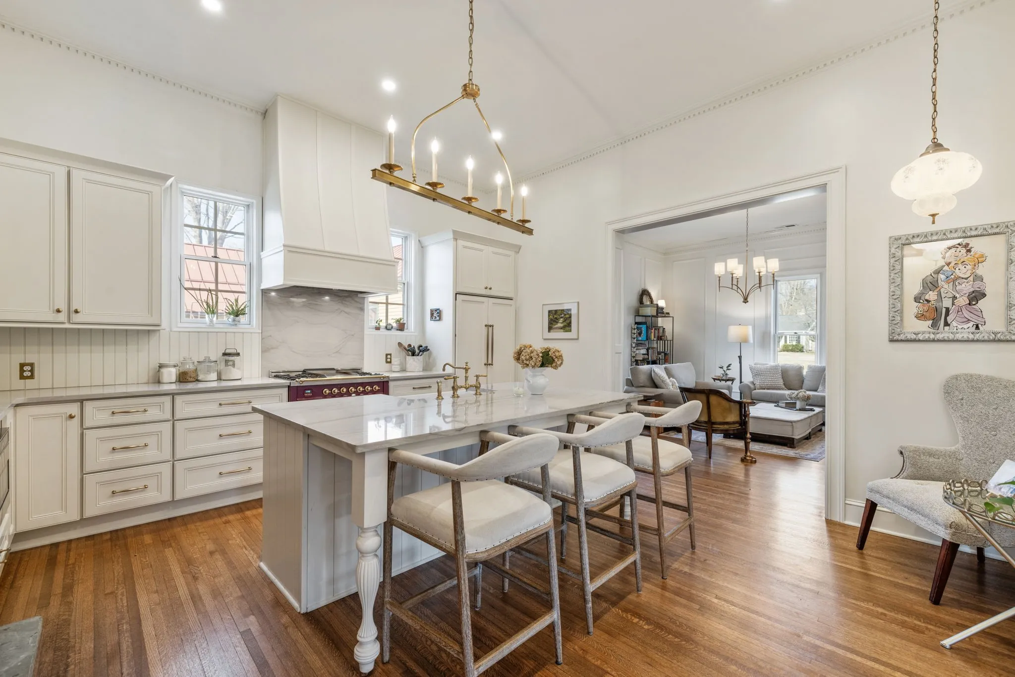 The renovation includes new dimensional roofing, cement board siding, upgraded framing, insulation throughout, Pella Lifestyle double-pane windows, new HVAC, new electrical with a 200-amp panel, tankless water heater, new plumbing, and a full gas system supporting fireplaces, range, and gas lanterns. Inside, refinished and new oak flooring flows throughout, complemented by upgraded trim, cased openings, and picture-frame molding.