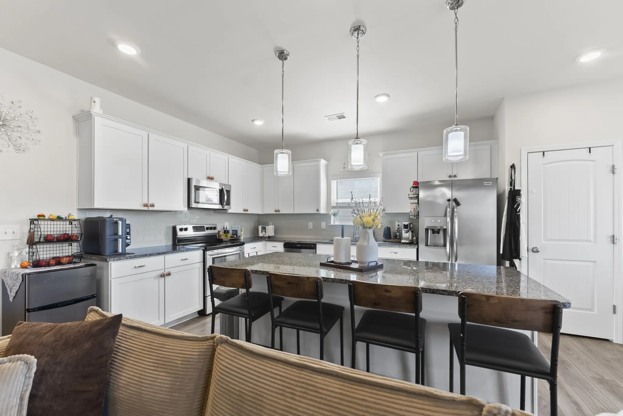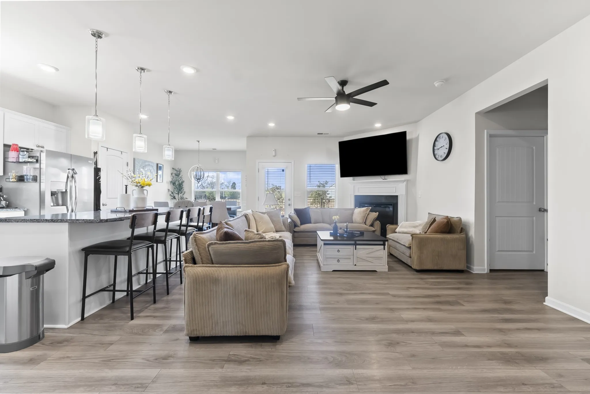 A spacious open-concept living area filled with natural light, stainless steel appliances, large island and fireplace.The primary suite is on the first floor, private backyard which backs up to a well-manicured pond, Home is conveniently located near parks, schools, shopping, and dining,