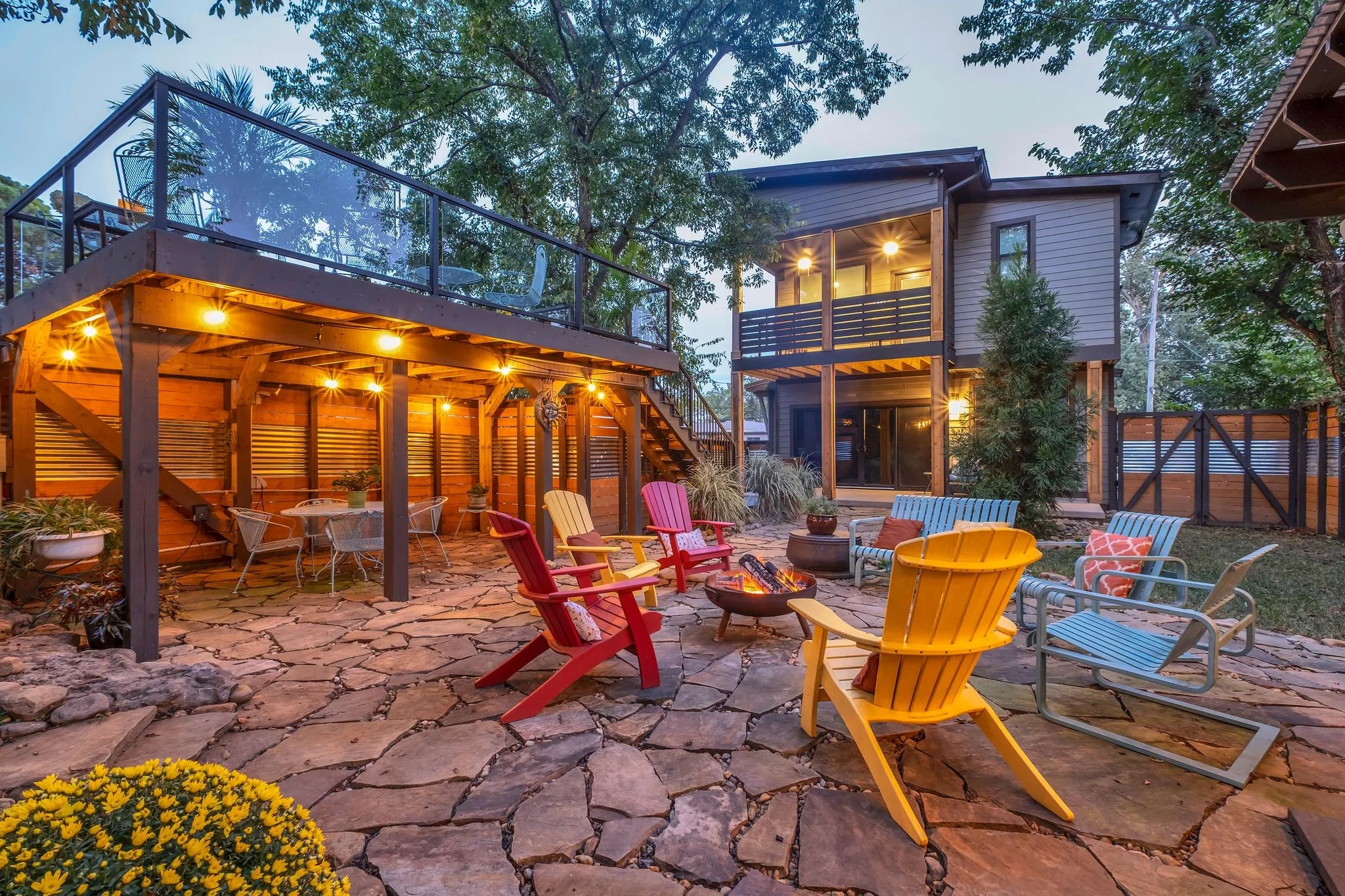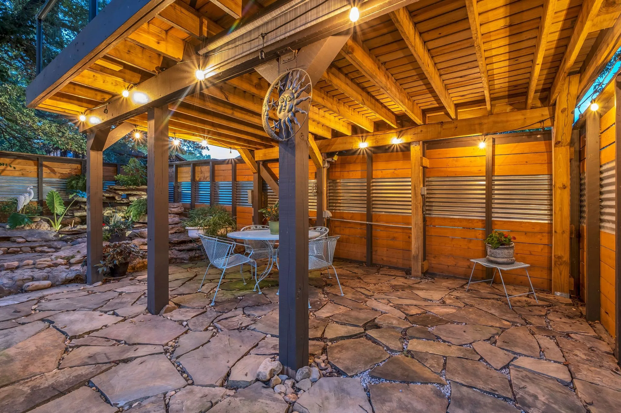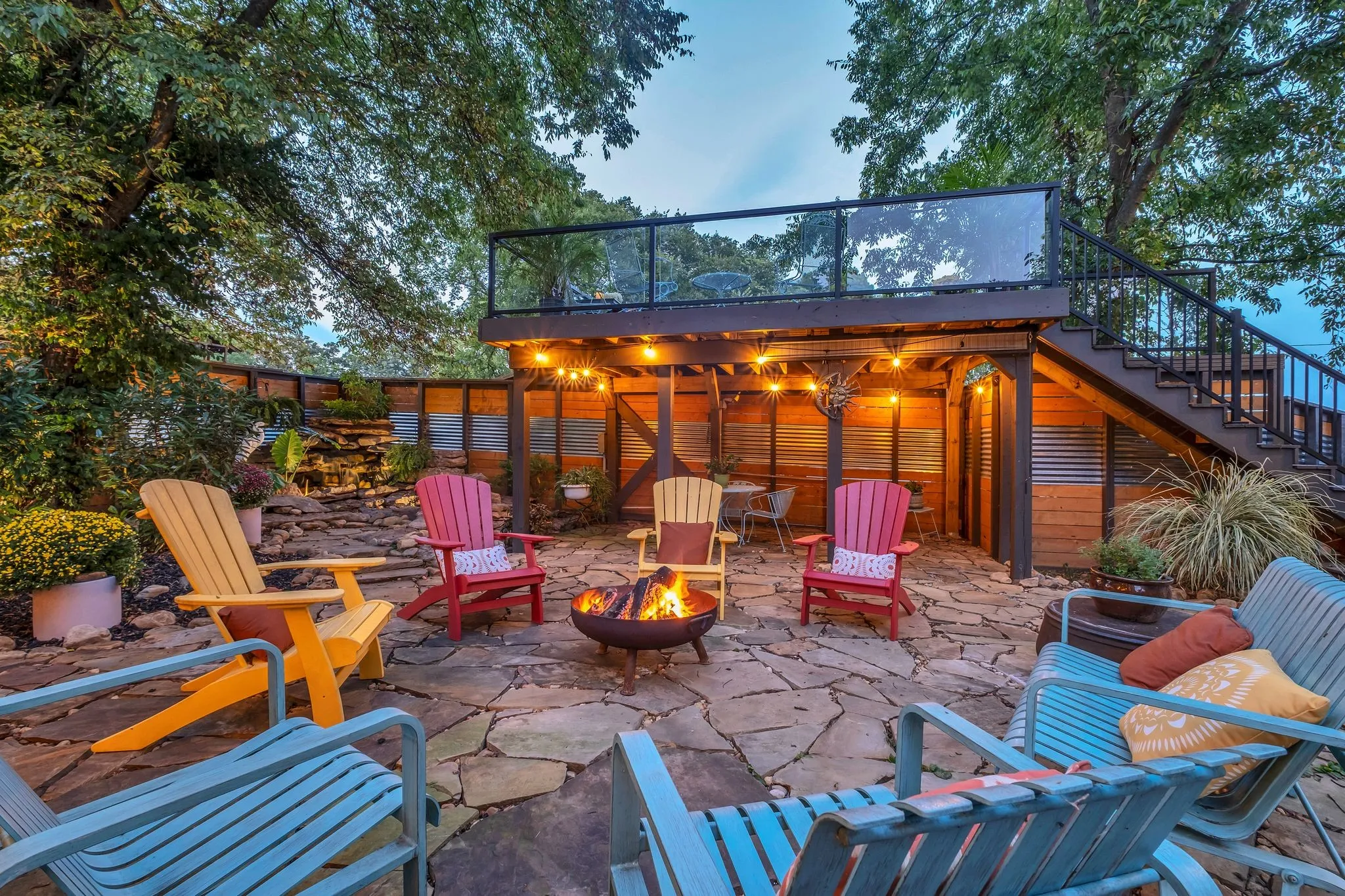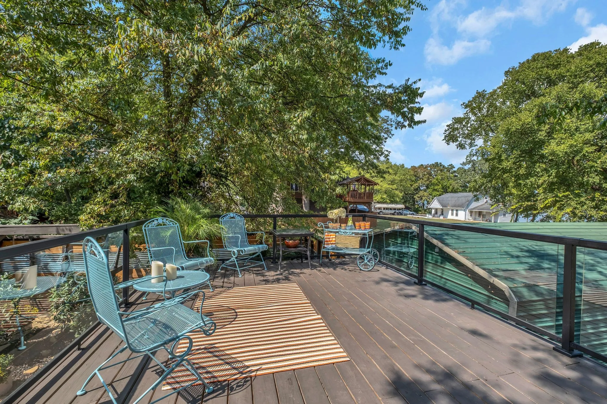 The backyard is a true showpiece—a private, one-of-a-kind oasis designed for luxury entertaining and everyday enjoyment. Features include a 7-foot privacy fence, dramatic waterfall, multiple covered entertaining areas, custom bar, dart board, and an elevated upper deck with sleek glass railings providing unobstructed lake views.
