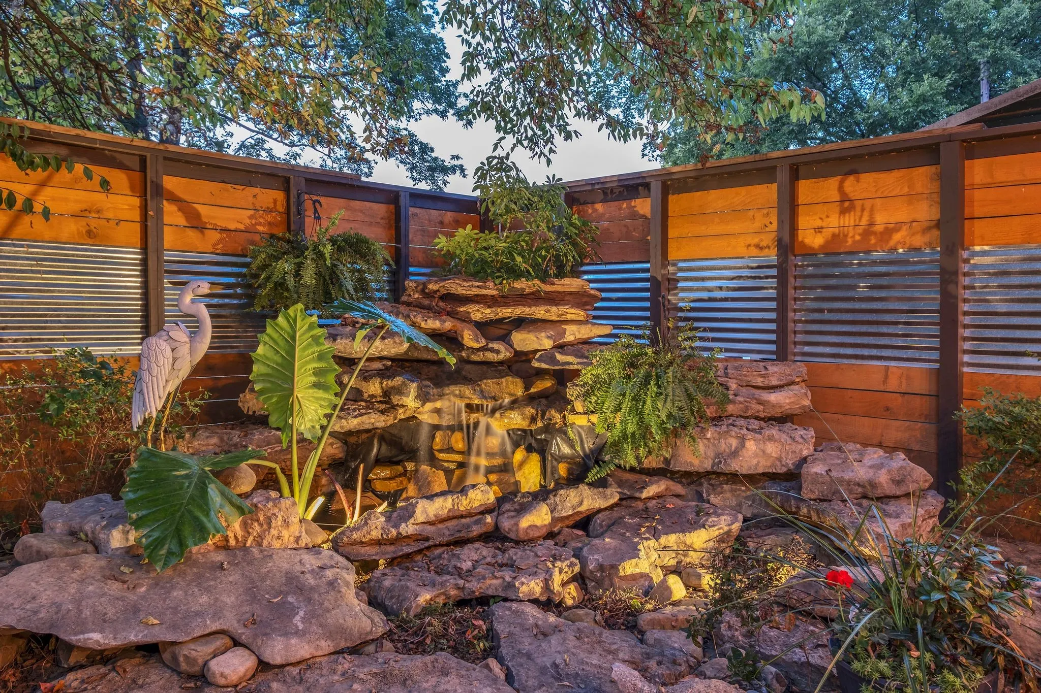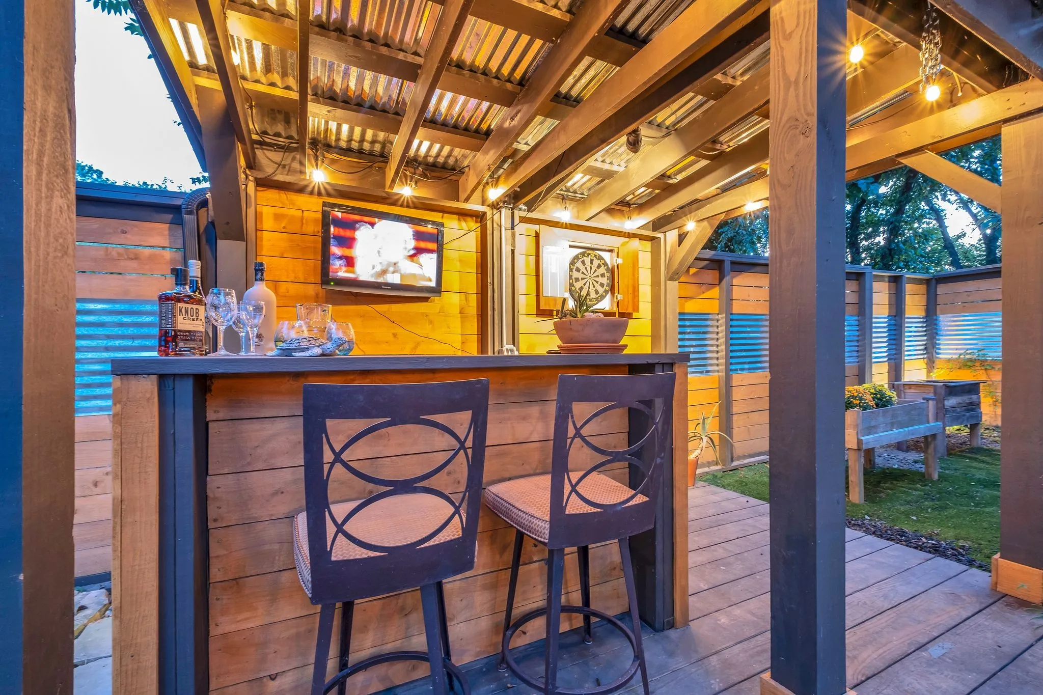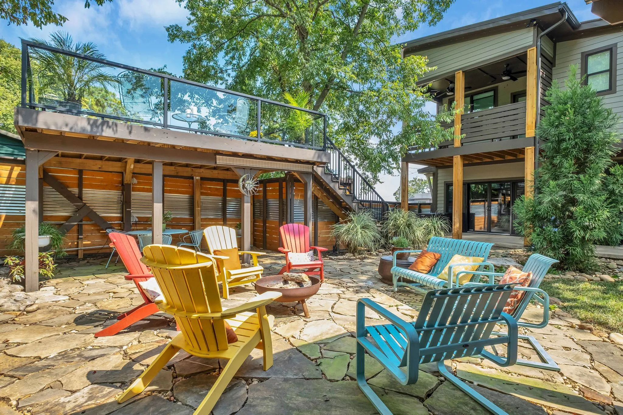 The backyard is a true showpiece—a private, one-of-a-kind oasis designed for luxury entertaining and everyday enjoyment. Features include a 7-foot privacy fence, dramatic waterfall, multiple covered entertaining areas, custom bar, dart board, and an elevated upper deck with sleek glass railings providing unobstructed lake views.