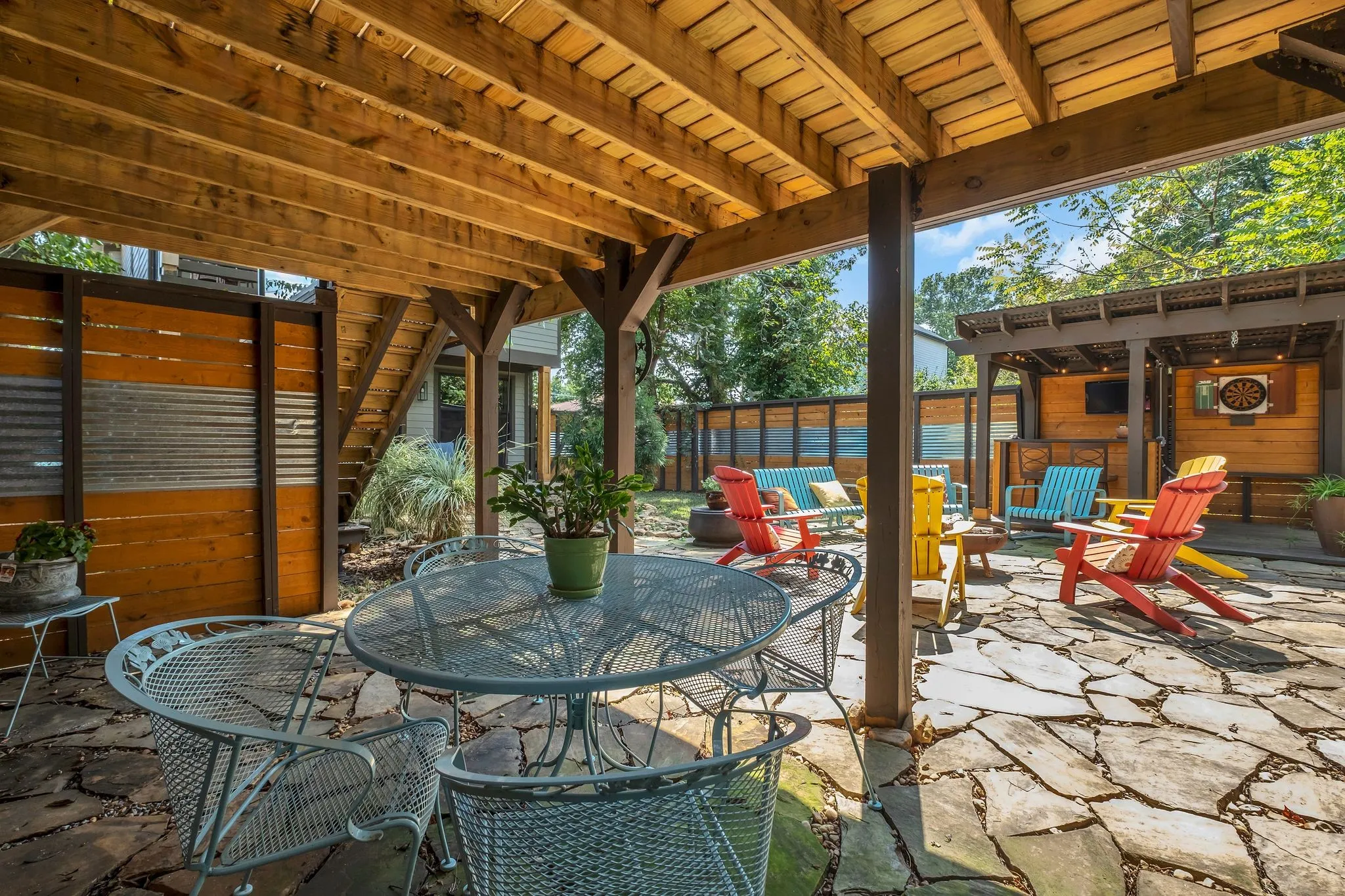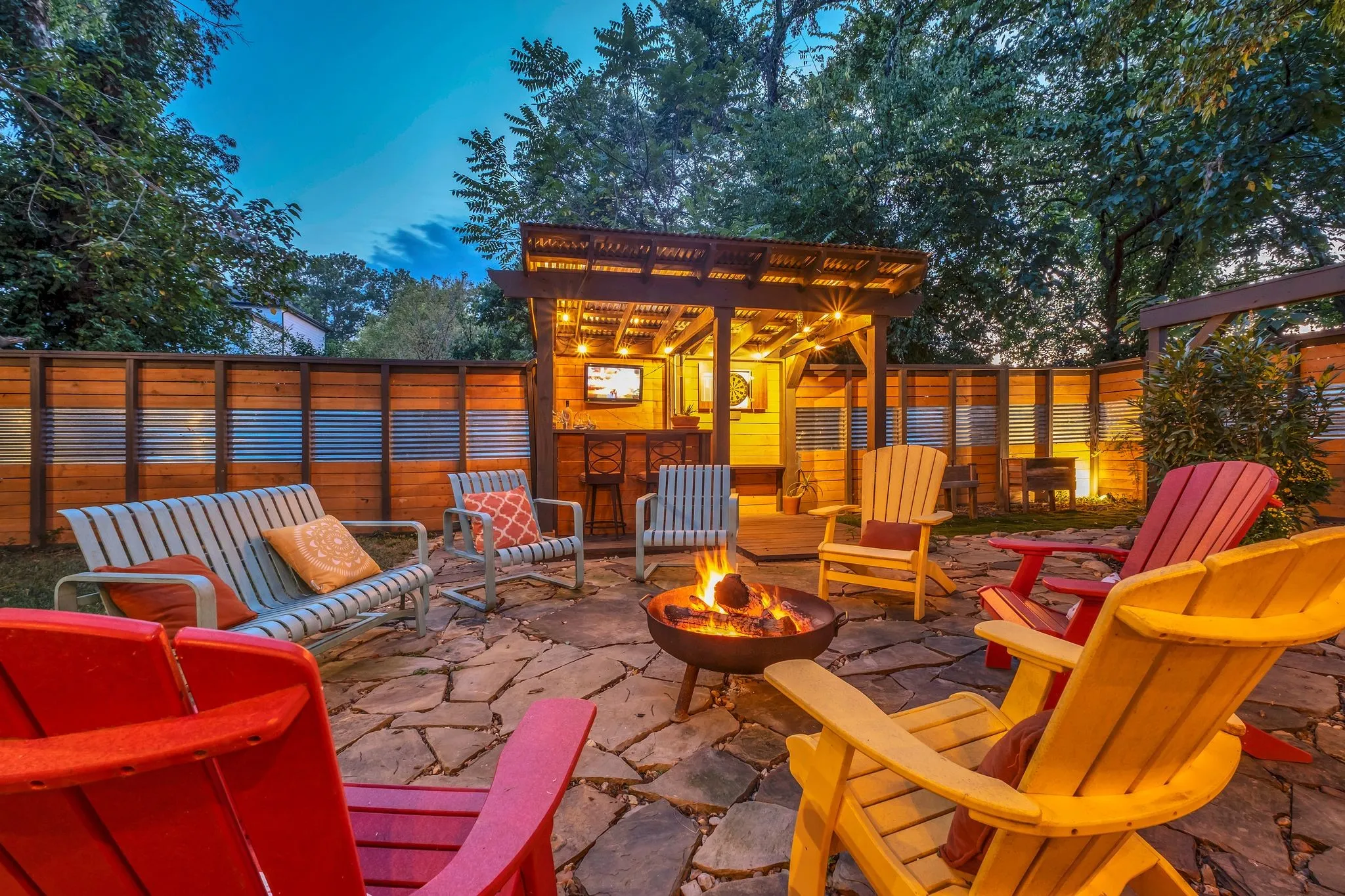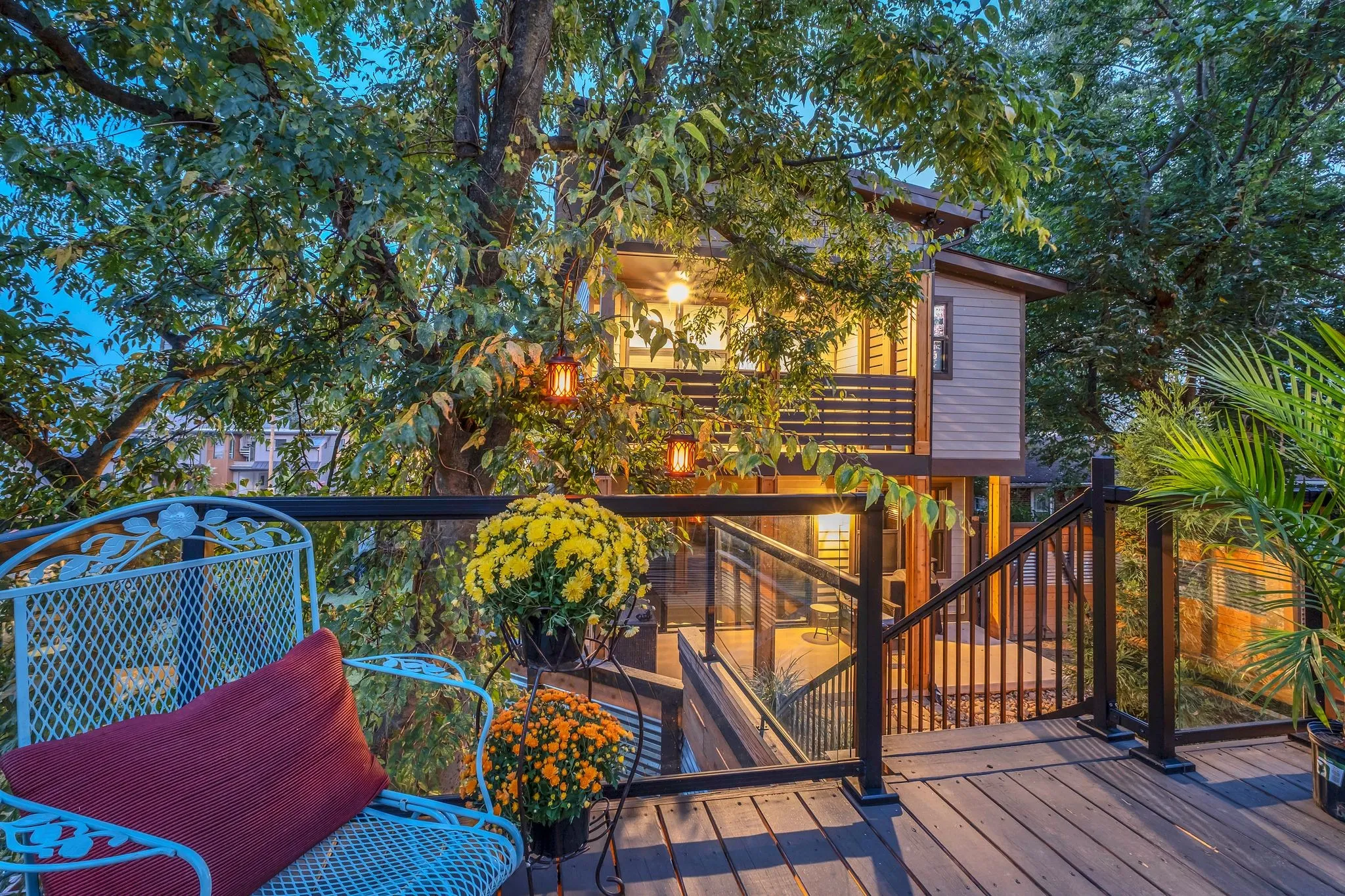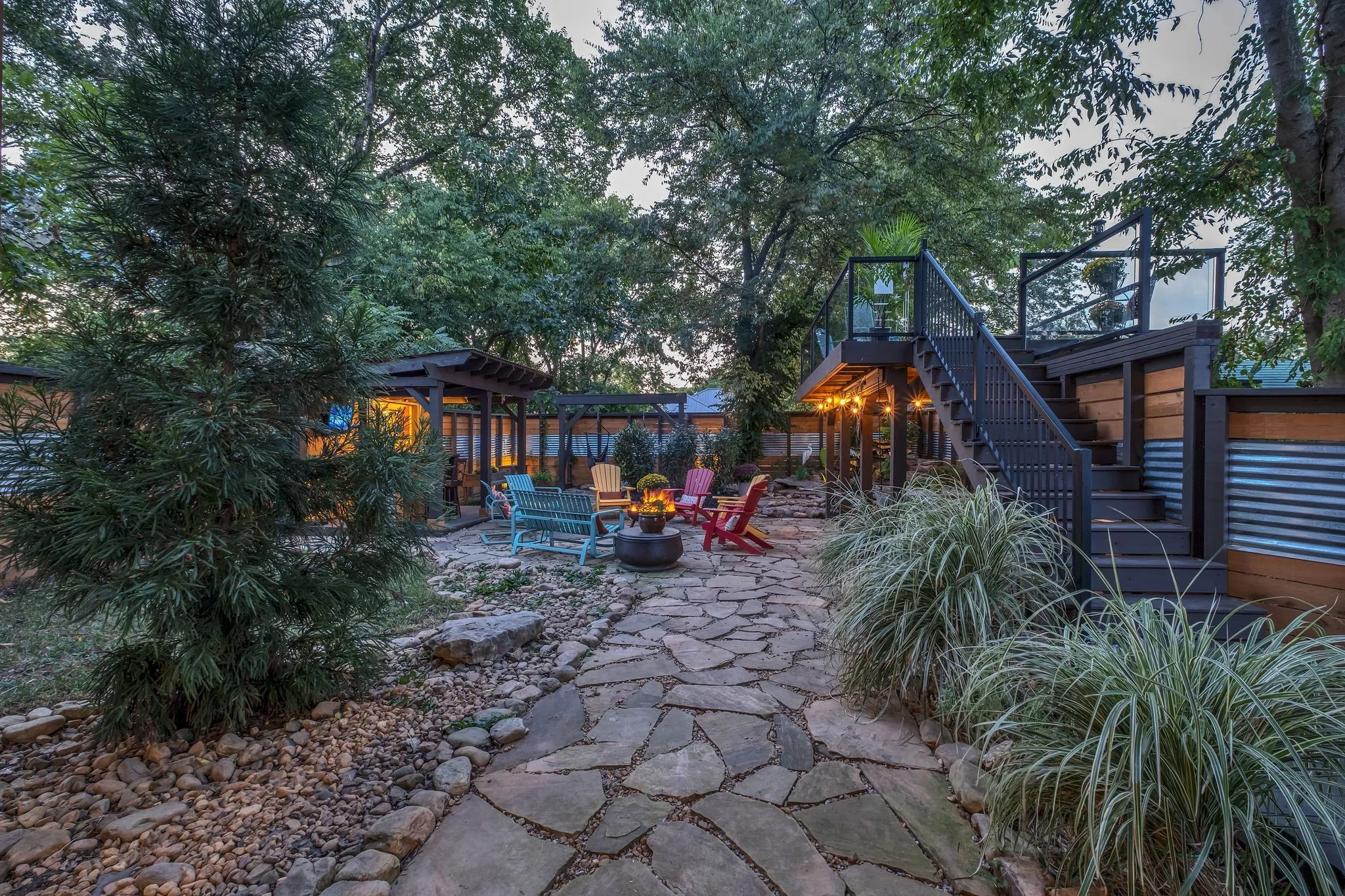 The backyard is a true showpiece—a private, one-of-a-kind oasis designed for luxury entertaining and everyday enjoyment. Features include a 7-foot privacy fence, dramatic waterfall, multiple covered entertaining areas, custom bar, dart board, and an elevated upper deck with sleek glass railings providing unobstructed lake views.
