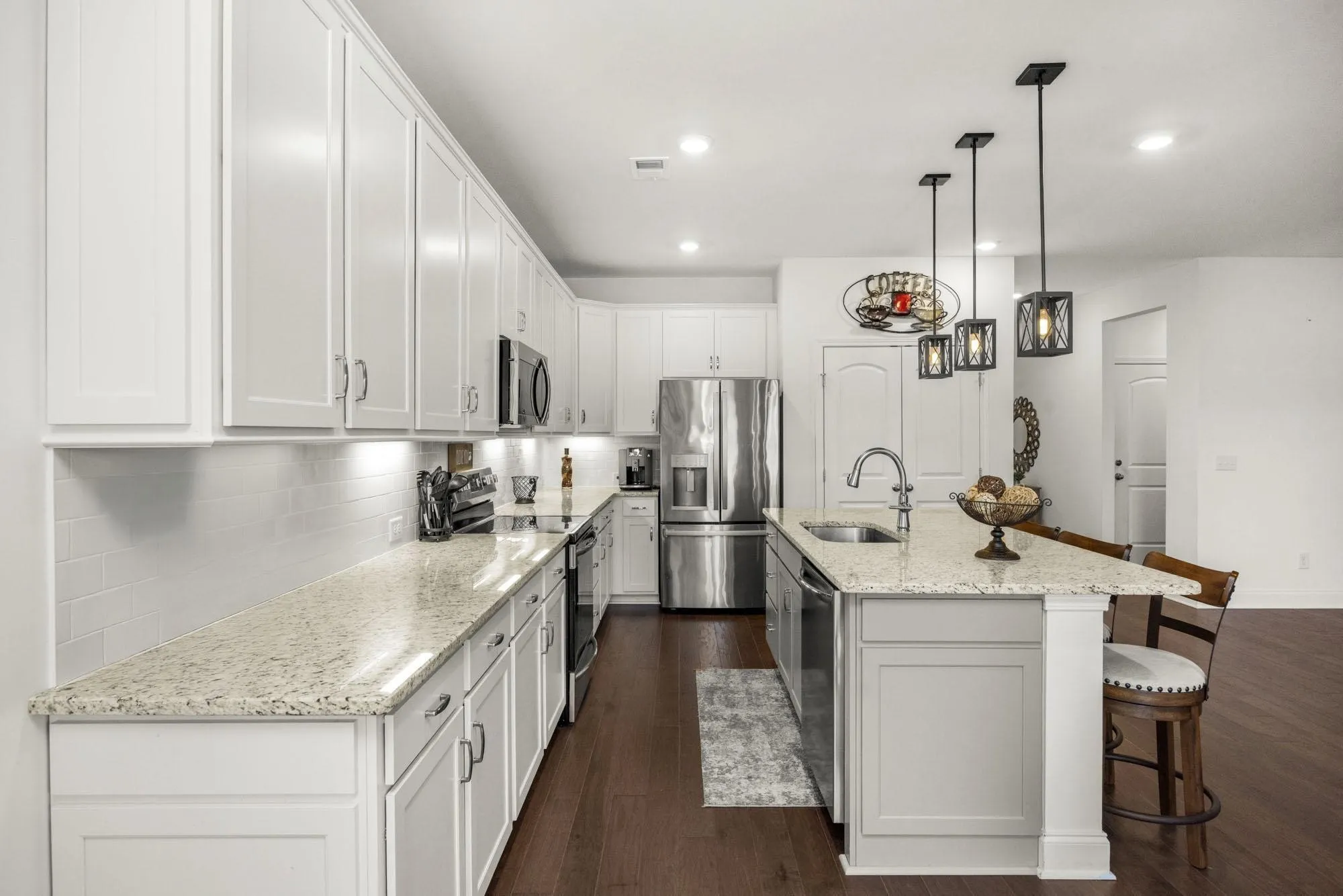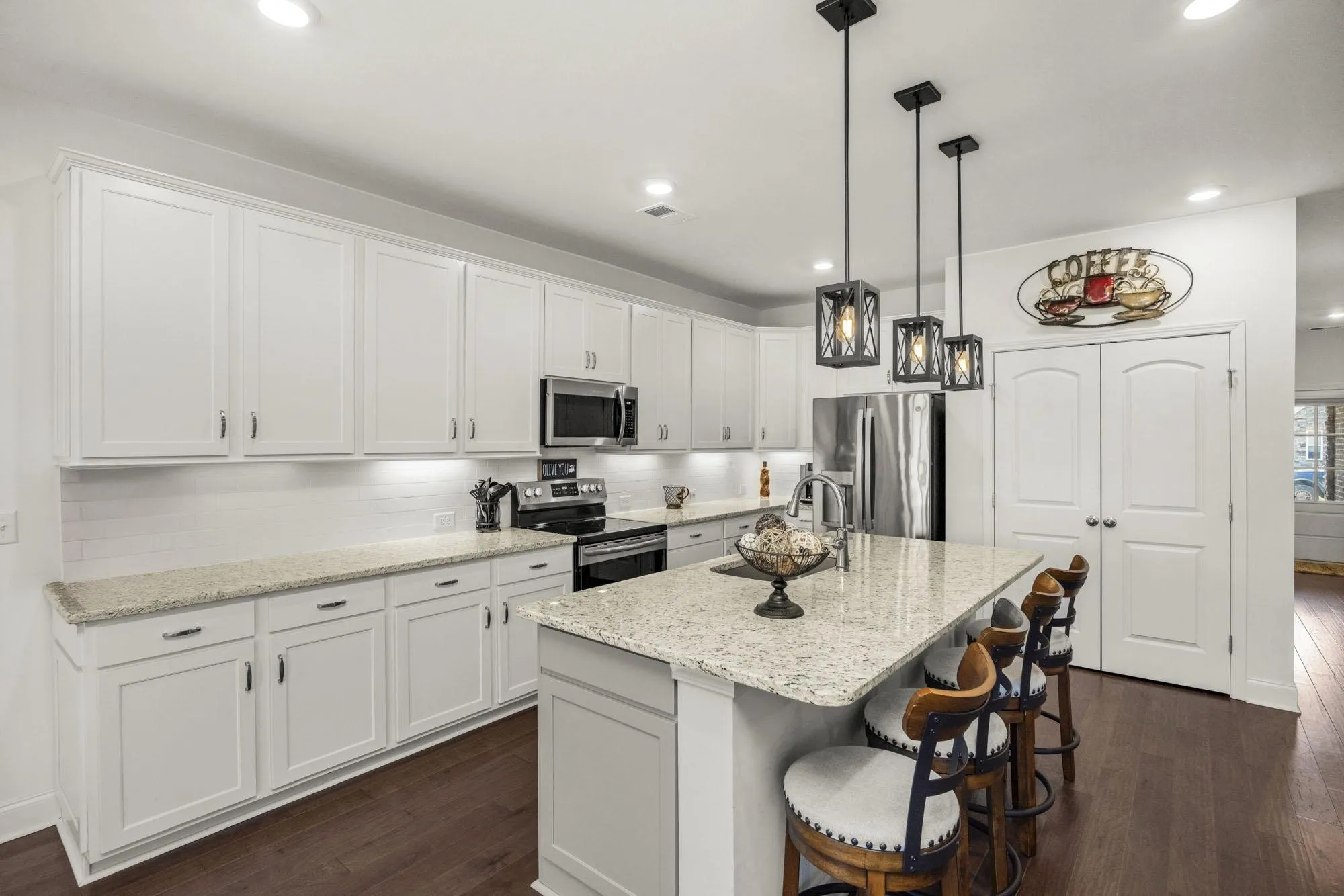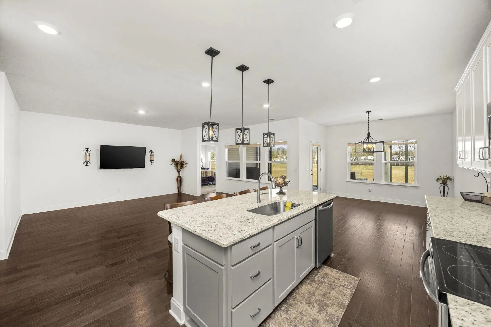 Beautifully maintained and less than three years old, this turnkey home in Langford Farms is move-in ready. The single-level layout offers three spacious bedrooms and two baths with an open-concept design perfect for both everyday living and entertaining. The bright kitchen features pendant lighting, quartz countertops, white cabinetry, and a stylish tile backsplash. Step outside to the extended screened-in patio overlooking open space and a walking trail. Enjoy a peaceful community setting just minutes from shopping, dining, parks, and schools.