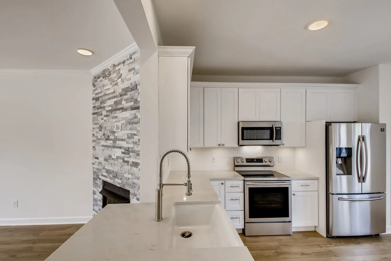 This turnkey home features a bright, open floor plan with a gas stacked-stone fireplace, luxury vinyl plank flooring, and designer lighting throughout. The kitchen stuns with waterfall-edge quartz counters, subway tile backsplash, new stainless appliances, soft-close cabinetry, and an oversized luxury enamel-on-steel sink.\n