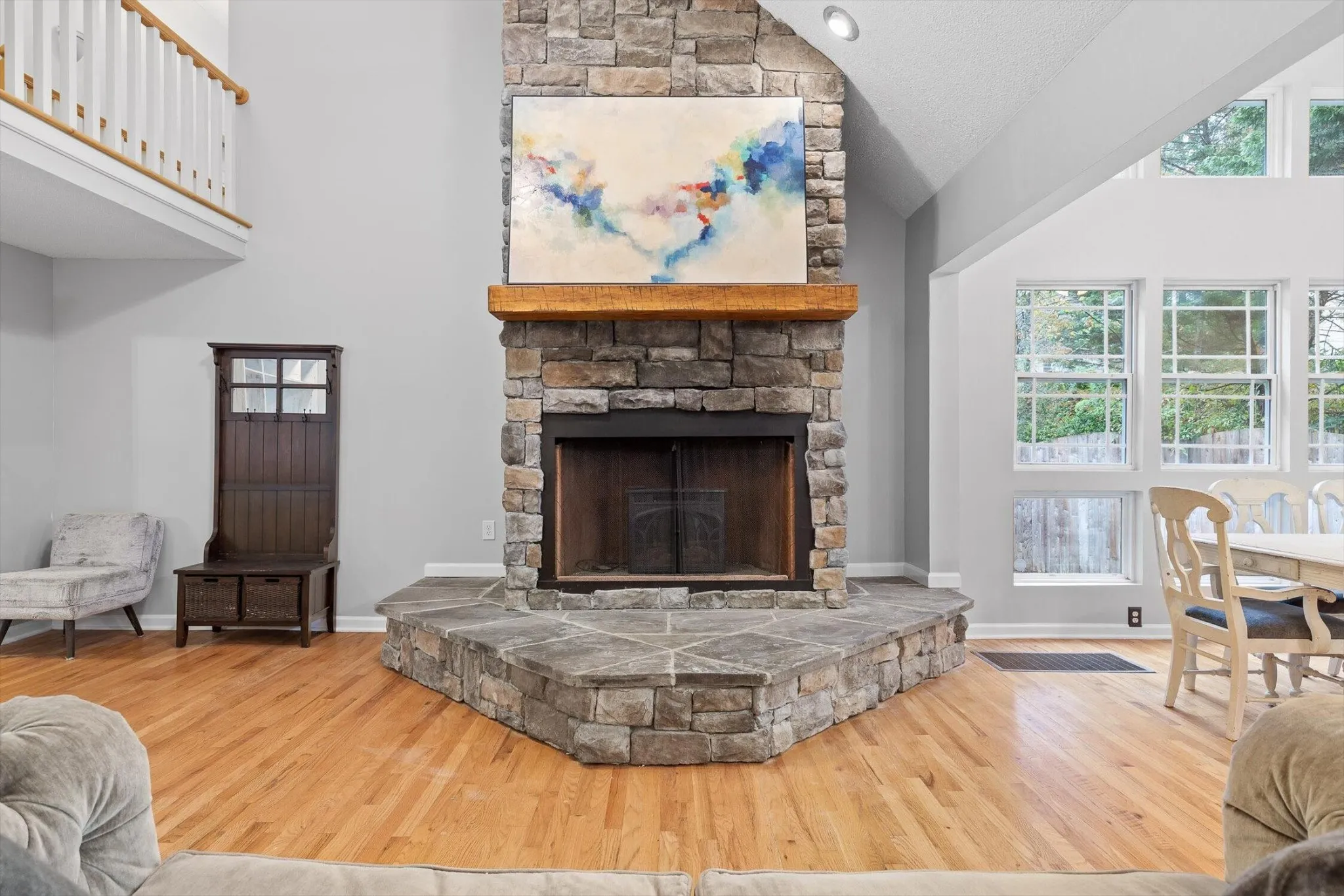 At the heart of the home is the chef-inspired kitchen with custom cabinetry, tons of storage, and elegant finishes—perfect for gathering with family or entertaining friends. The open-concept layout flows seamlessly into the living area, where a stacked-stone fireplace serves as a warm and inviting focal point.