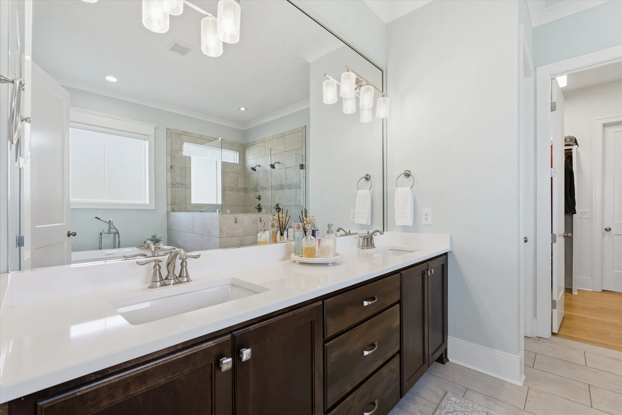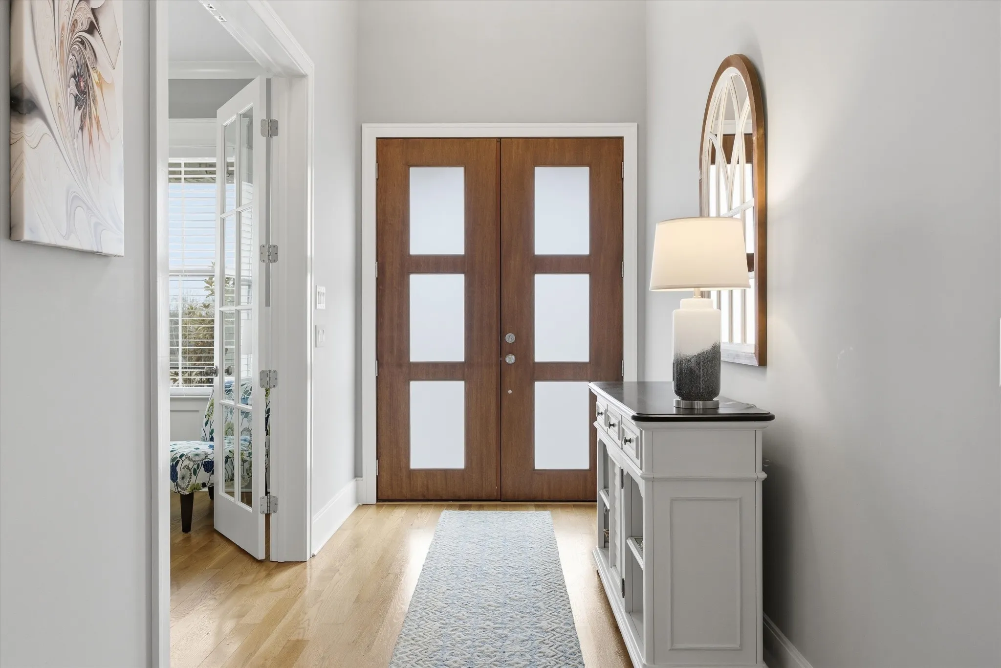 The main-level primary suite provides a private retreat, complemented by an additional main-level bedroom perfect for guests. Just off the foyer, a versatile room with French doors and custom wainscoting currently serves as a home office but can easily function as a formal dining room, play area, or library space.
