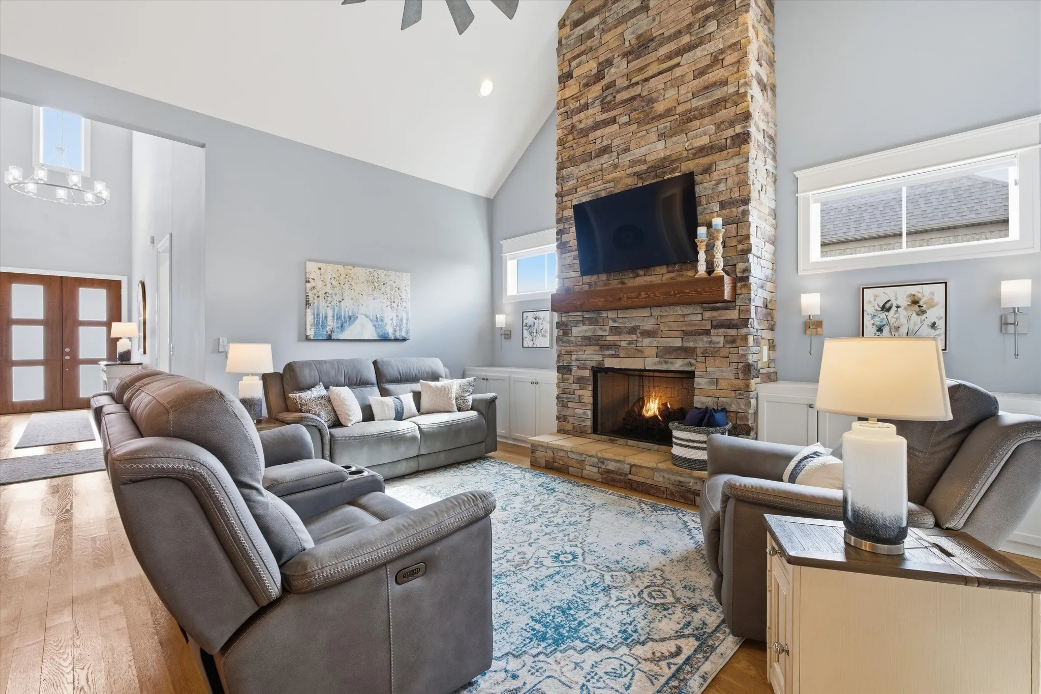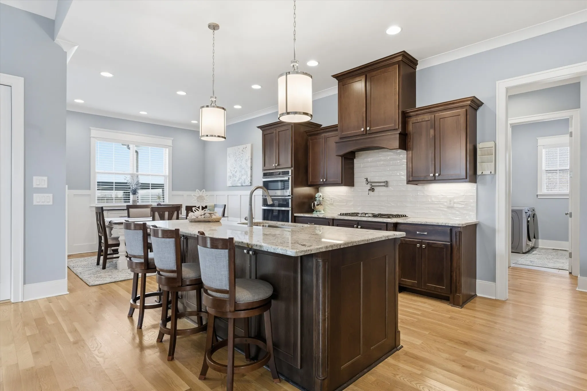The open-concept floor plan is ideal for entertaining and everyday living, with rich hardwood floors throughout the main level and a stunning great room anchored by a floor to ceiling stone fireplace with custom upgraded built-ins. The gourmet kitchen is a true showstopper, featuring granite countertops, stainless steel appliances, an oversized island, abundant cabinetry, a large walk-in pantry, and an eat-in area accented with custom wainscoting.