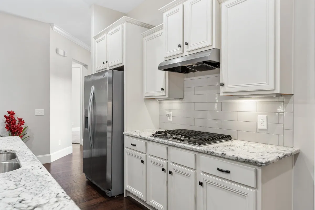 The main living area offers an open-concept design with 10-foot ceilings, 2 full baths, recessed lighting, and elegant finishes throughout. The chef’s kitchen boasts a gas cooktop, large pantry, granite, and an oversized island that’s perfect for entertaining guests. Adjacent to the kitchen, the formal dining room sits just off the grand arched foyer, providing a perfect space for gatherings.