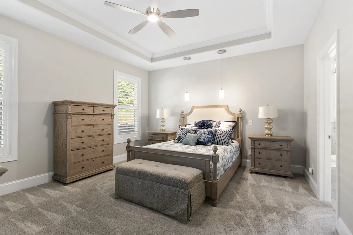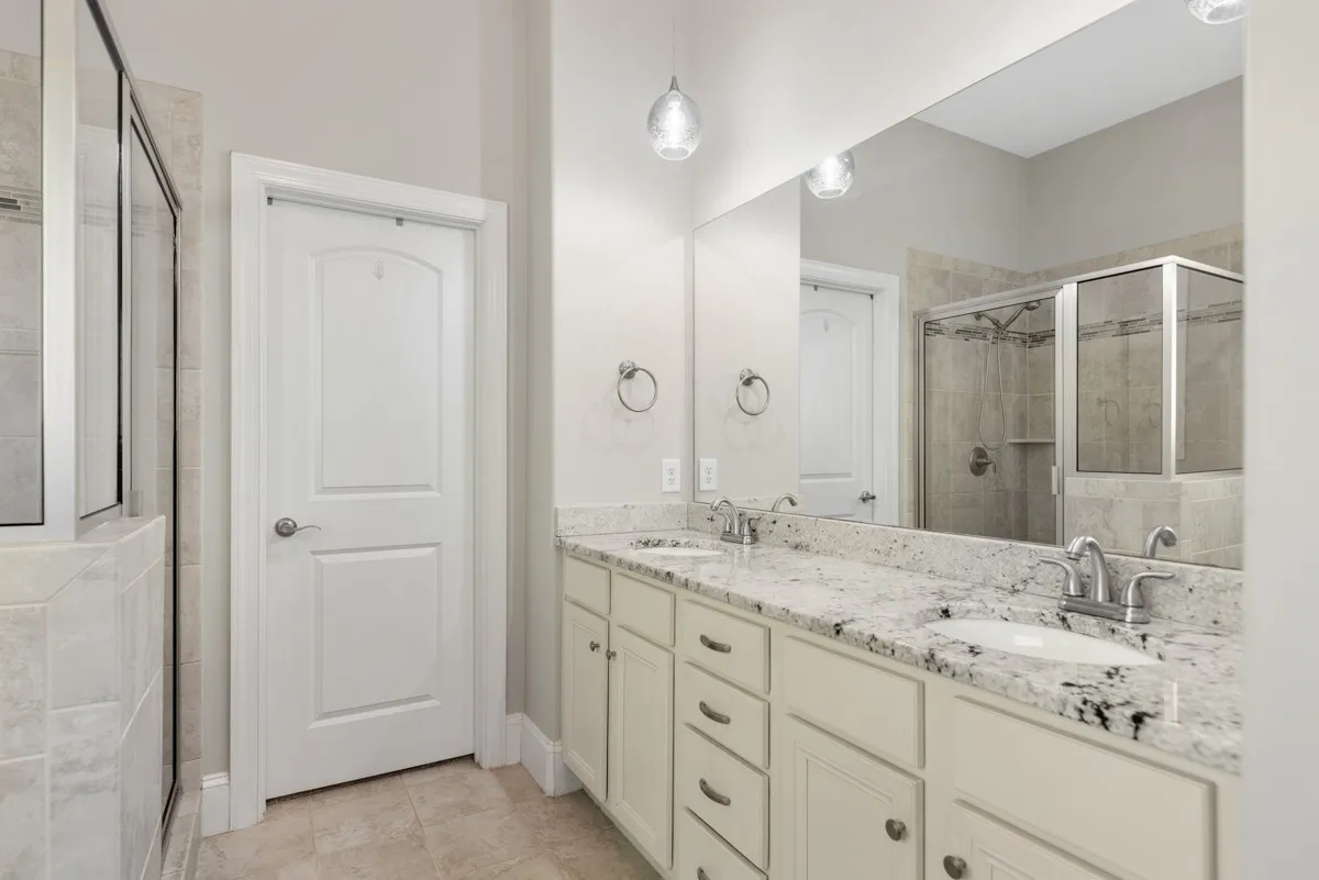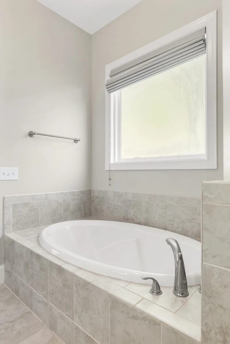 The primary suite is located on the main floor and features a bathroom fit for a king or queen — complete with double vanities, a large soaking tub, a custom-tiled shower, a private water closet, and an oversized walk-in closet.