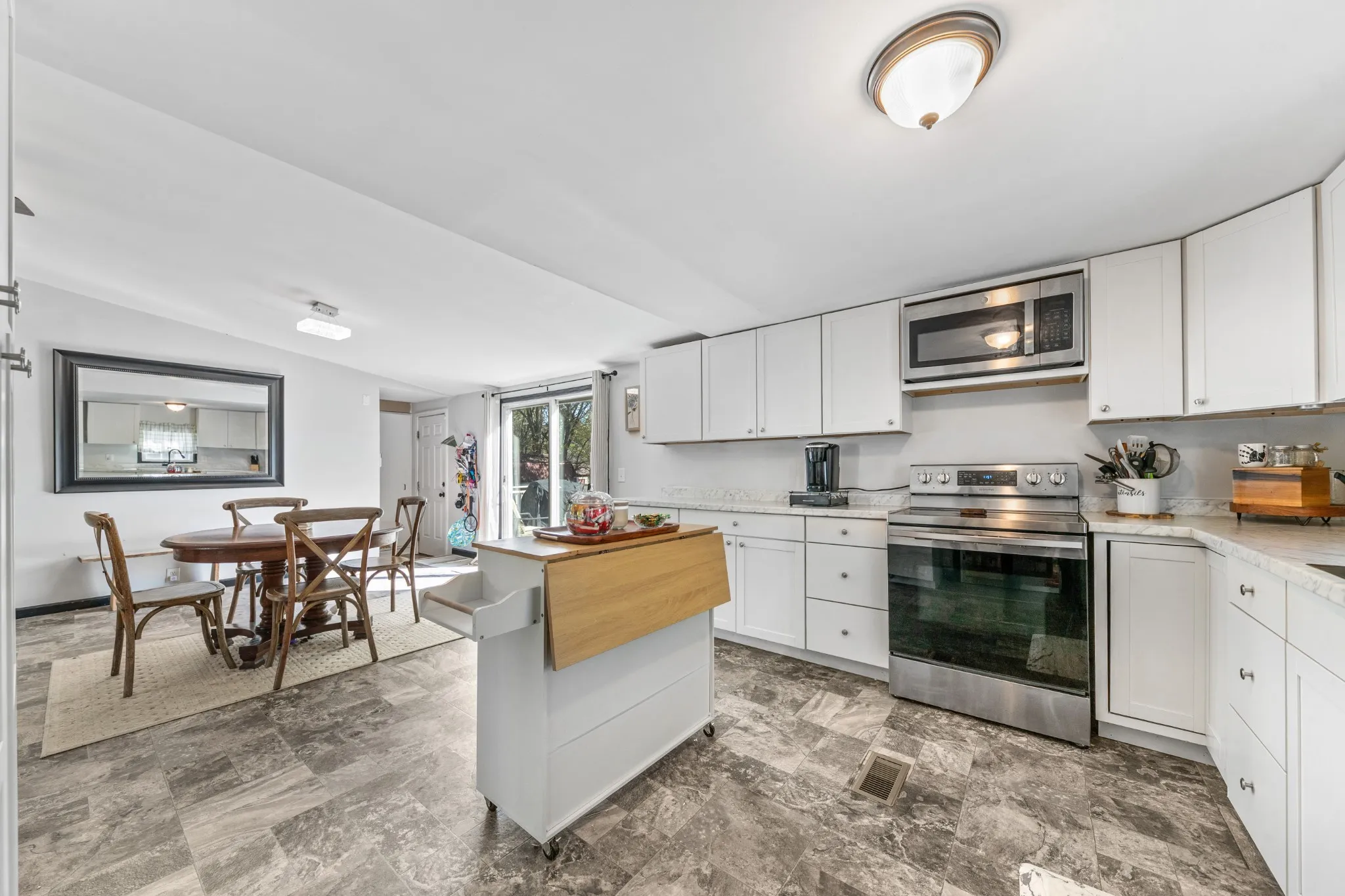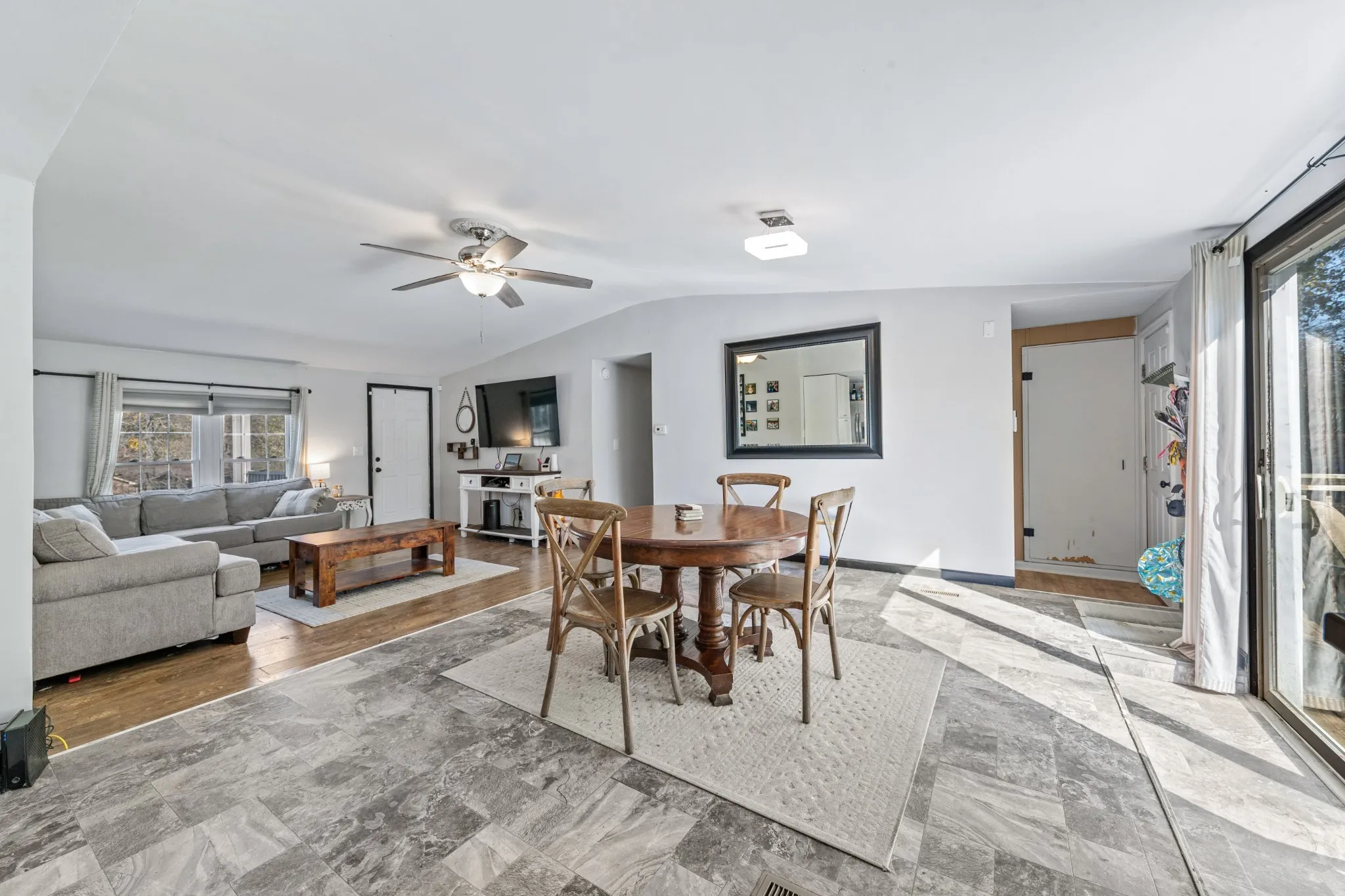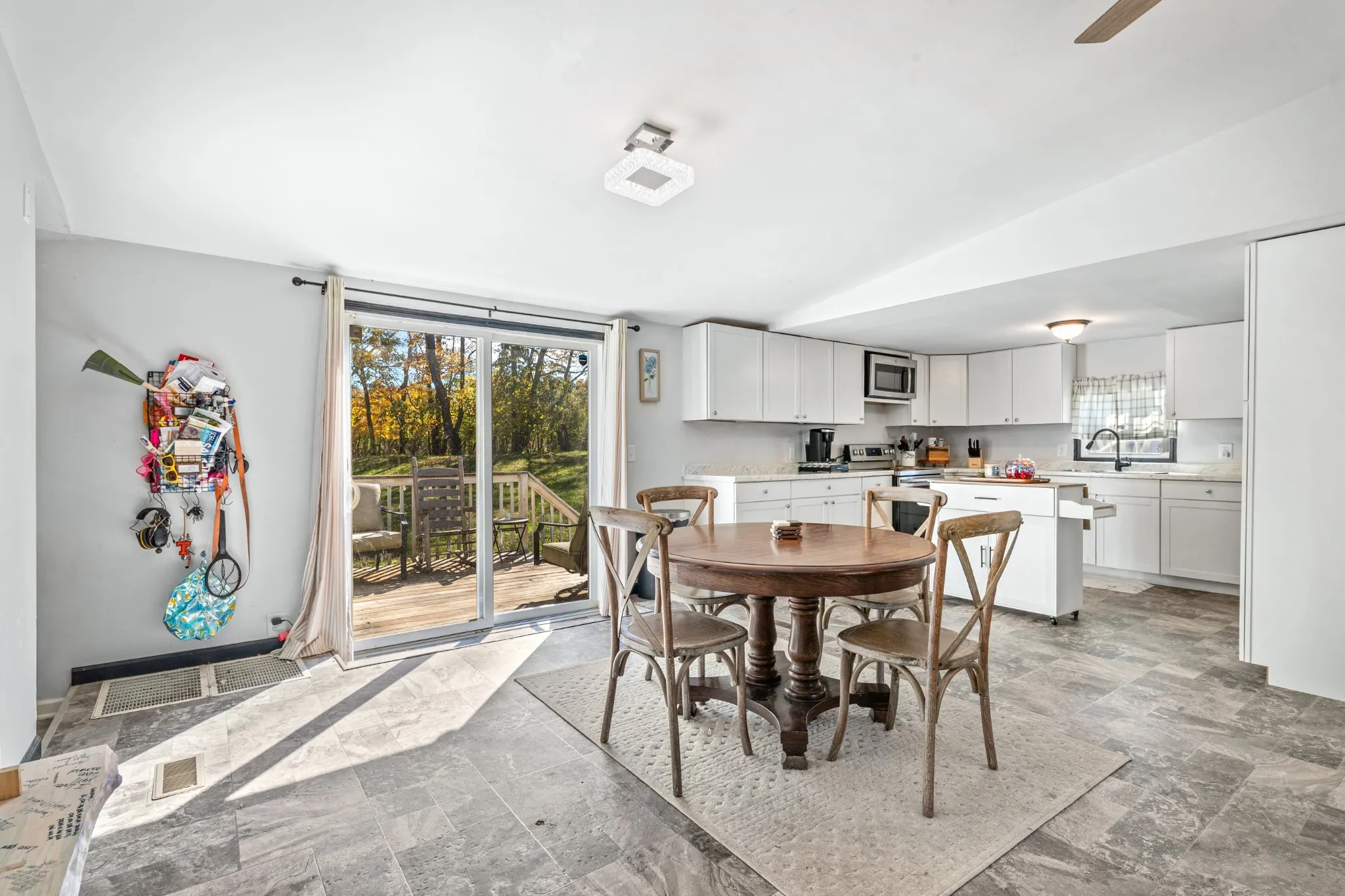 The home’s exterior boasts classic charm with a paved blacktop driveway, brick mailbox, and abundant parking. Inside, modern updates and thoughtful finishes create a warm, move-in-ready space. The dining area’s glass patio doors flood the space with natural light and open directly to the backyard for effortless indoor-outdoor living.