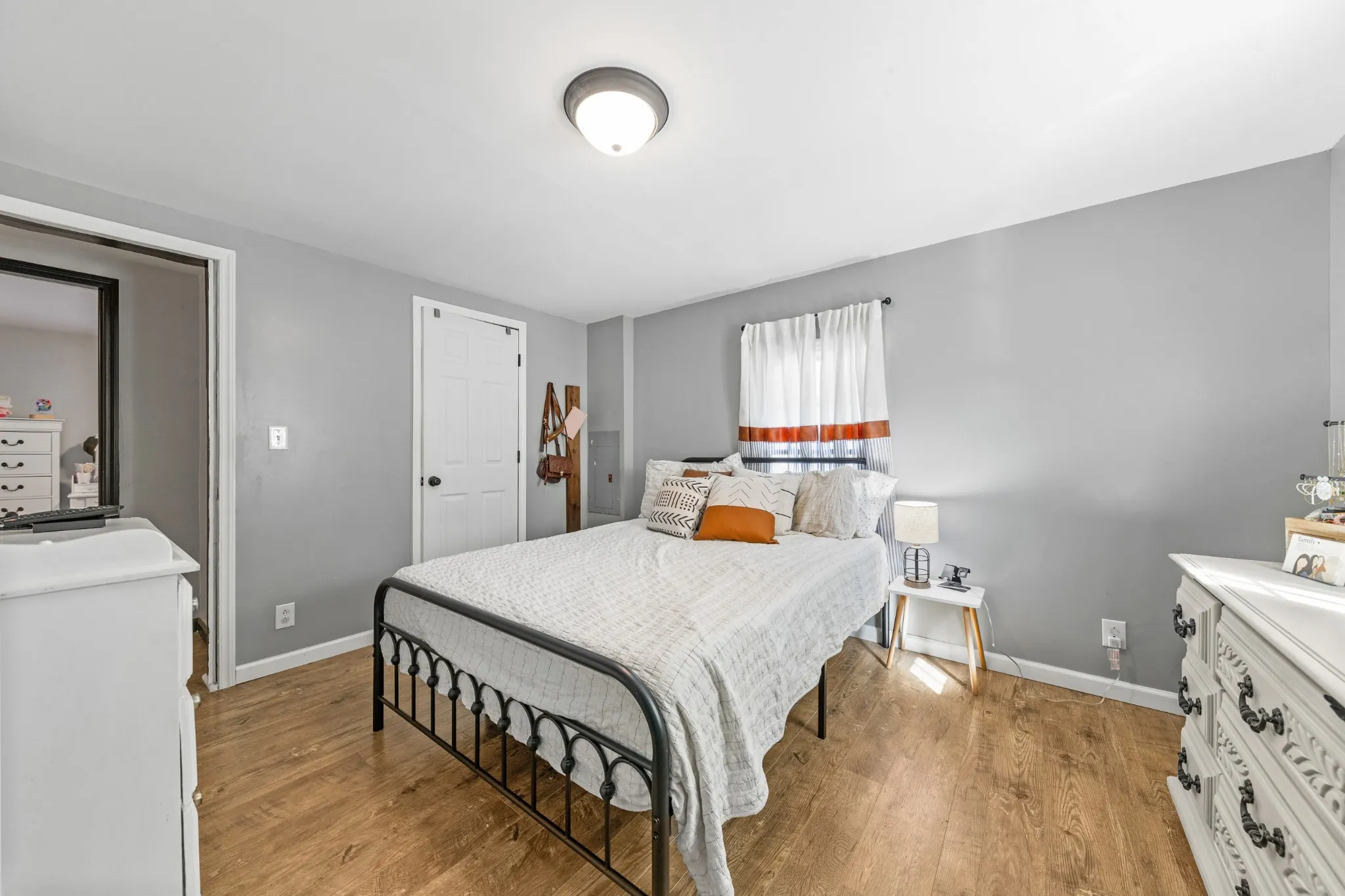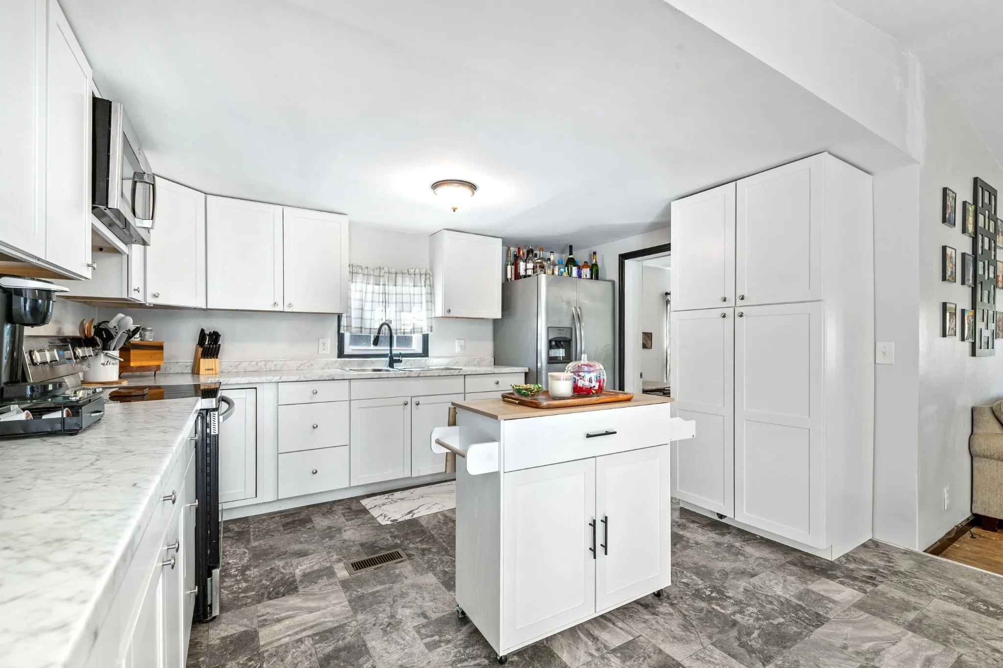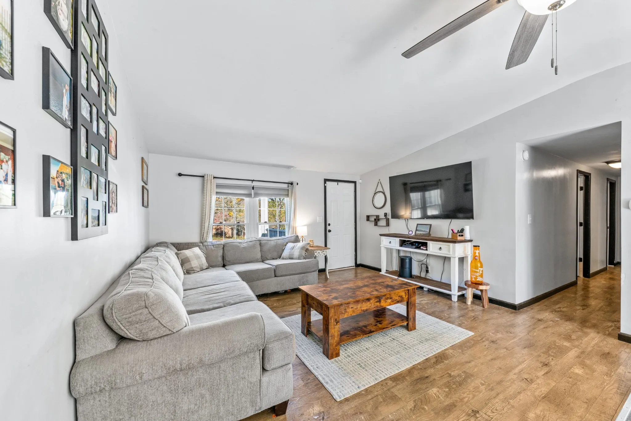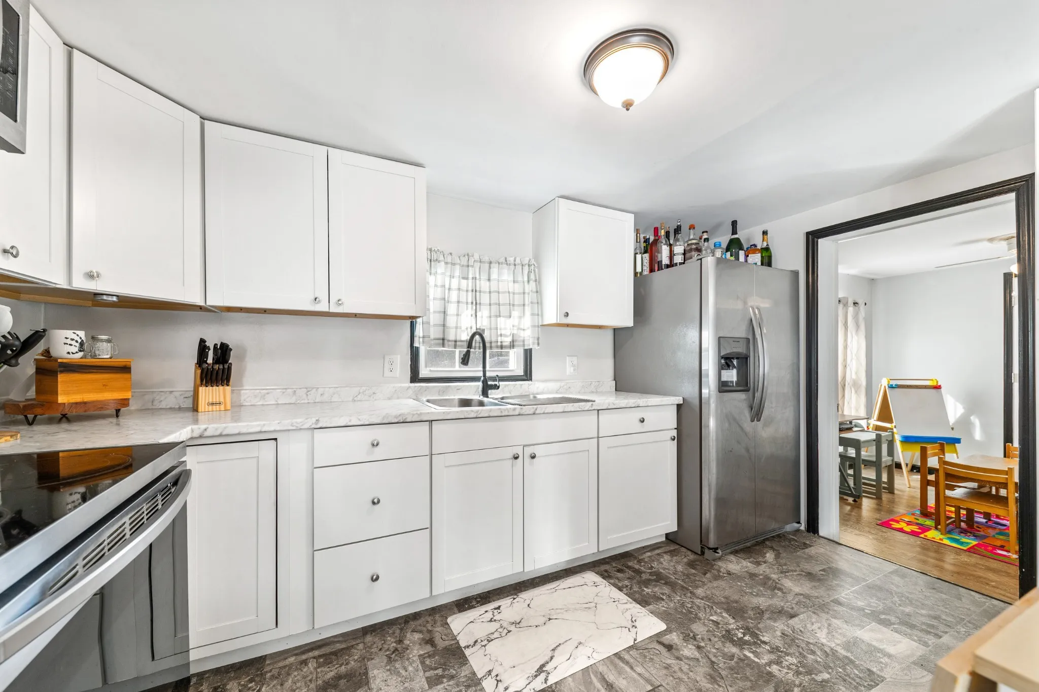 The home’s exterior boasts classic charm with a paved blacktop driveway, brick mailbox, and abundant parking. Inside, modern updates and thoughtful finishes create a warm, move-in-ready space. The dining area’s glass patio doors flood the space with natural light and open directly to the backyard for effortless indoor-outdoor living.