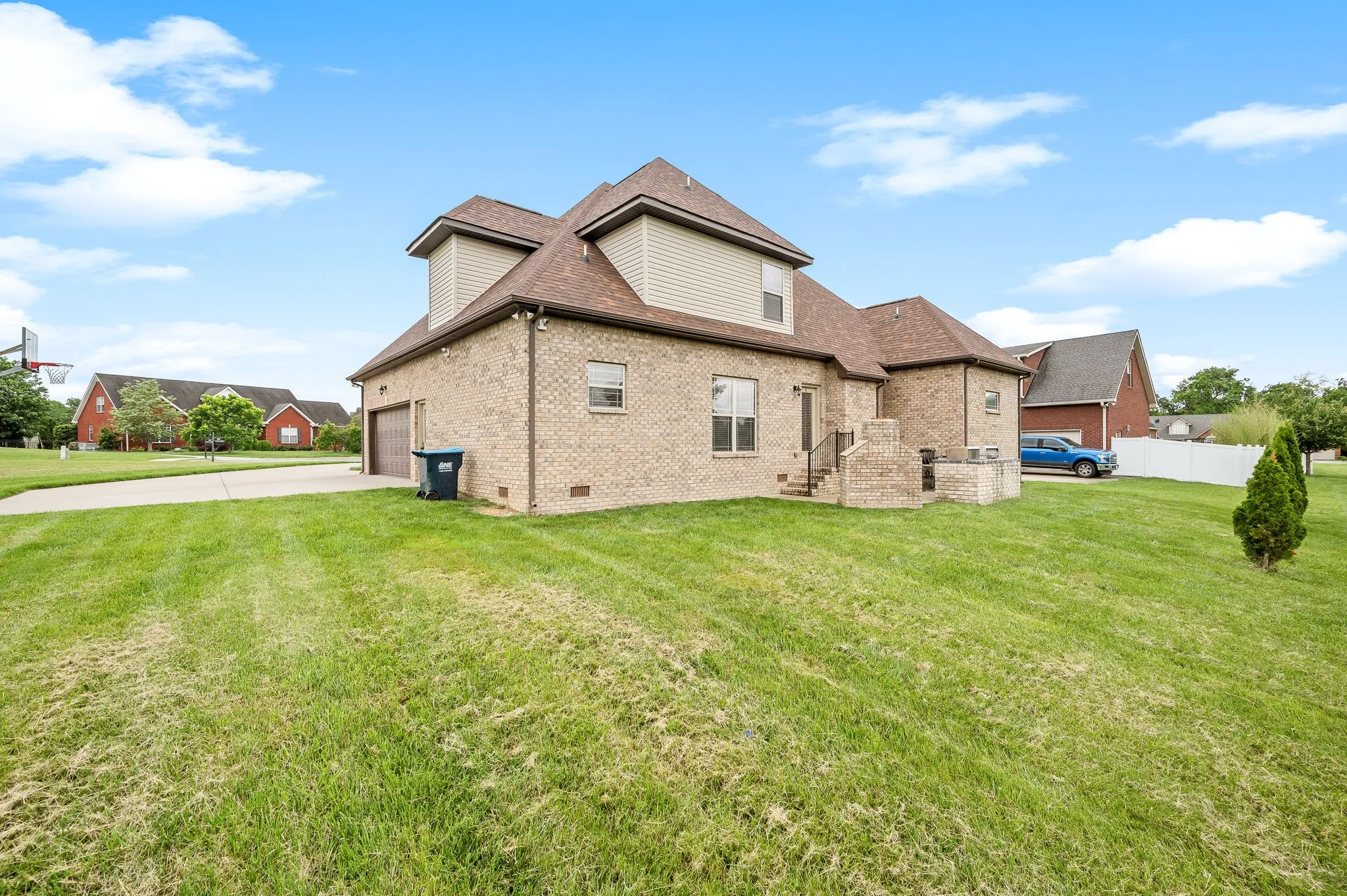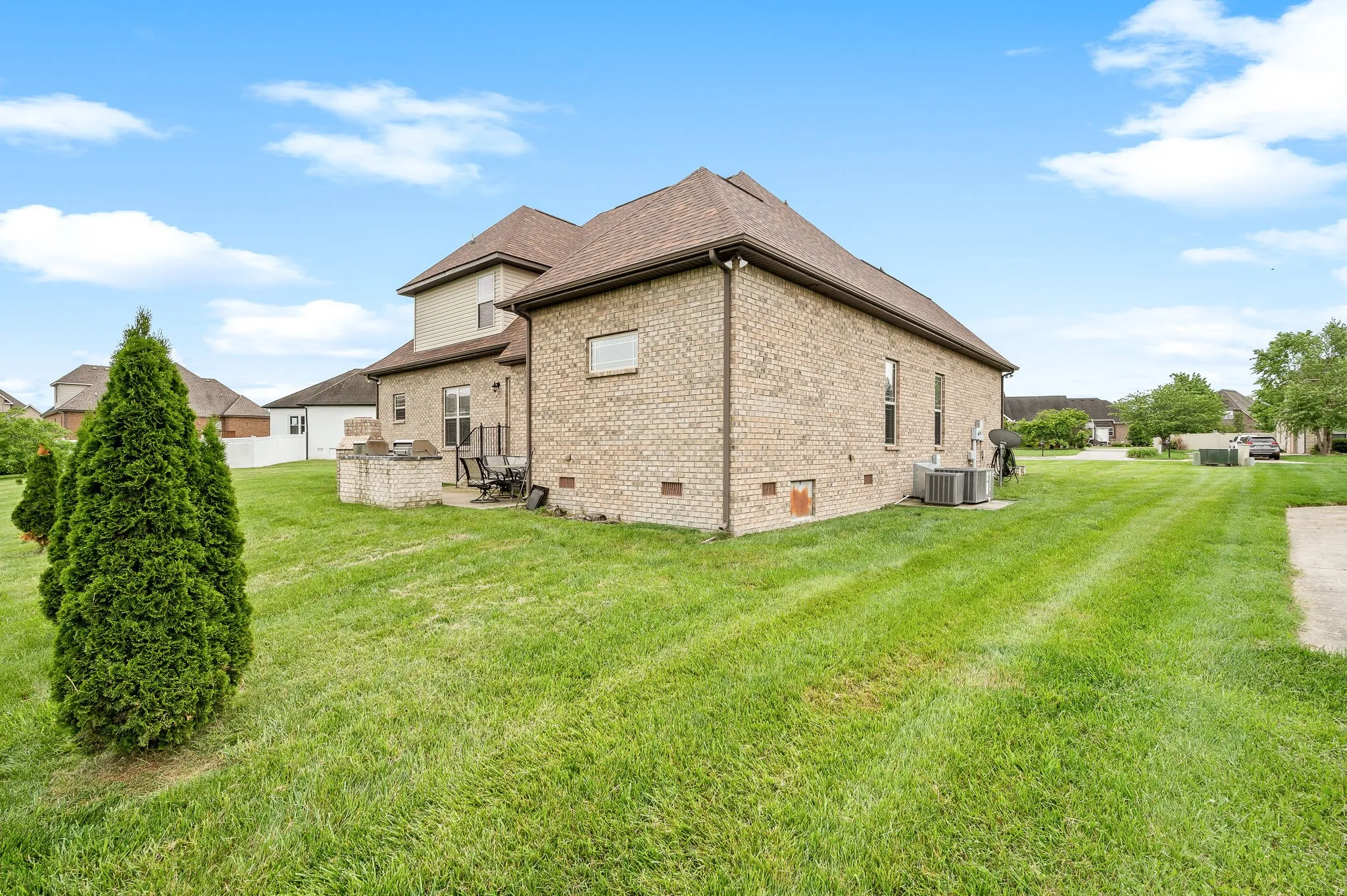 Outdoor living is elevated with a brick fireplace patio, ideal for year-round enjoyment.