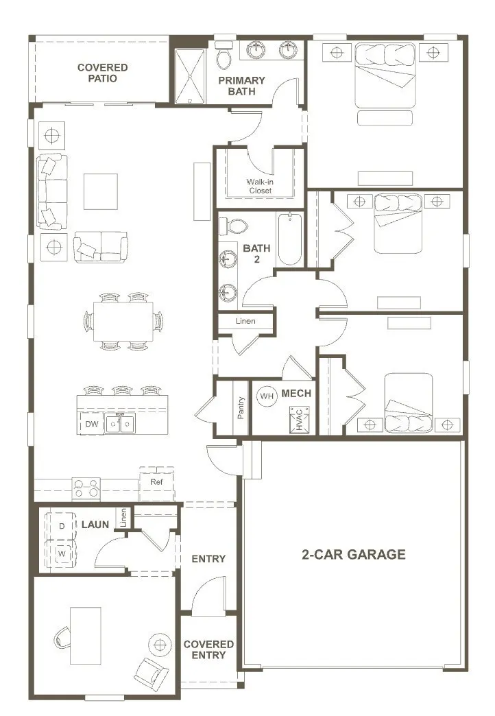 The layout begins with everyday functionality in mind, featuring a quiet dedicated study and a conveniently located laundry room off the front hall. The heart of the home is the expansive social hub: a spacious great room and dining area flowing into a well‑appointed kitchen with a generous island and built‑in pantry. Entertaining is effortless with direct access to the relaxing covered patio.