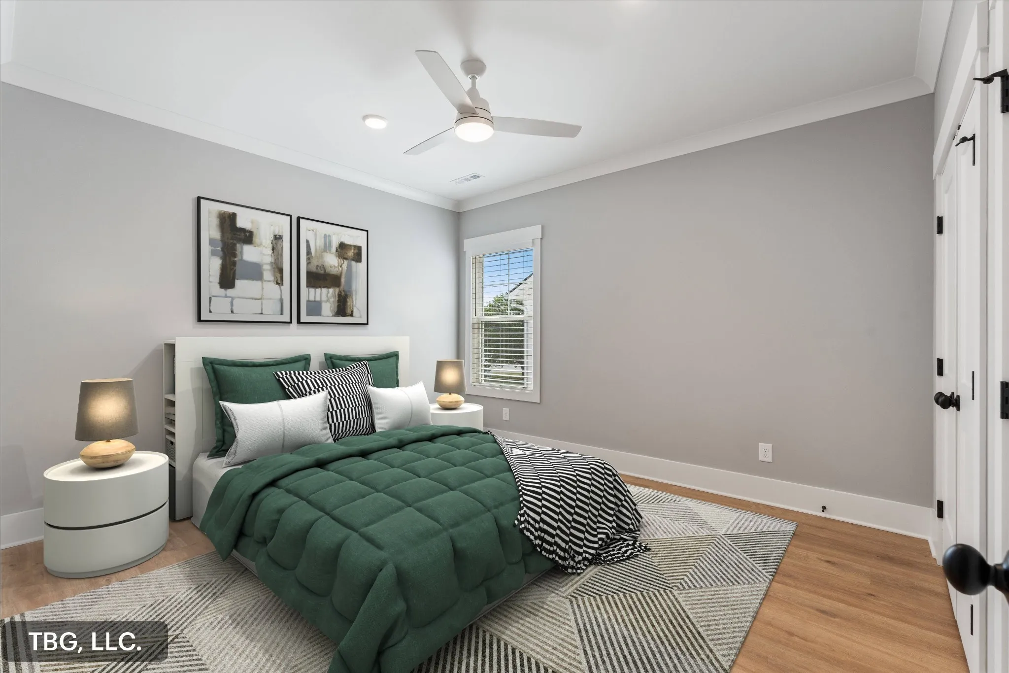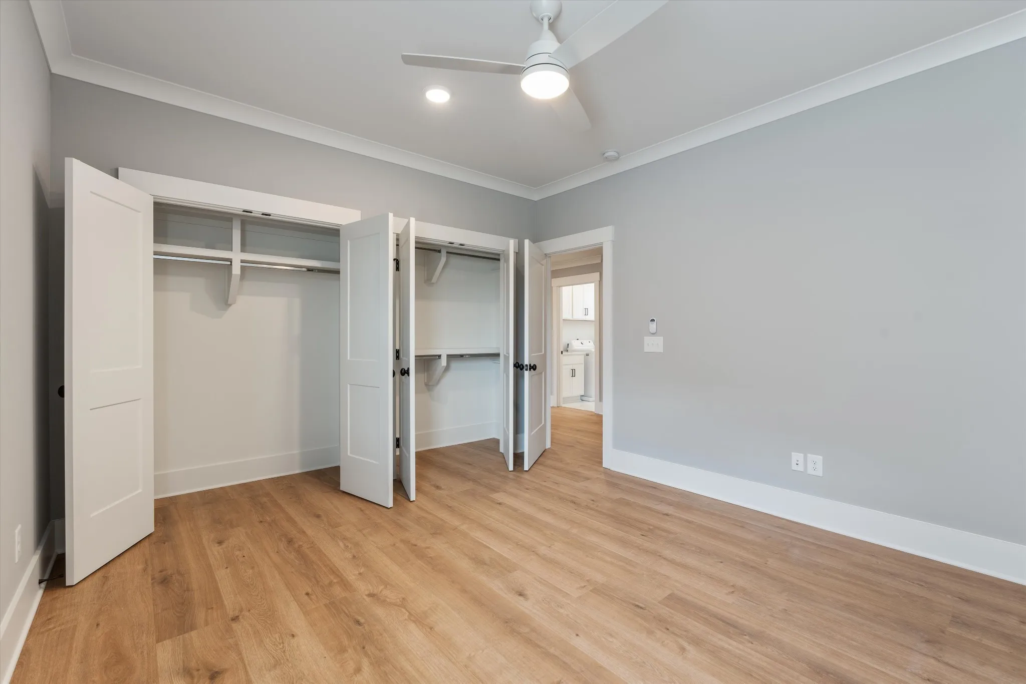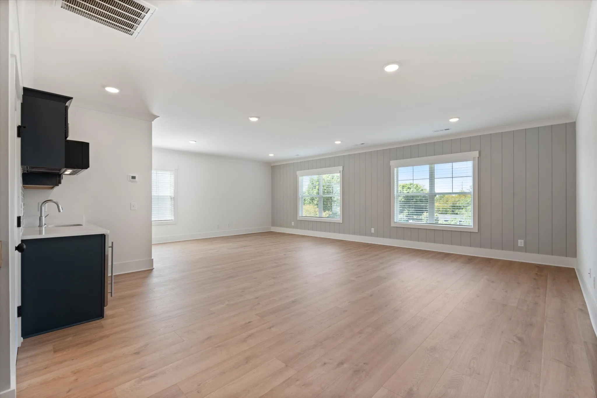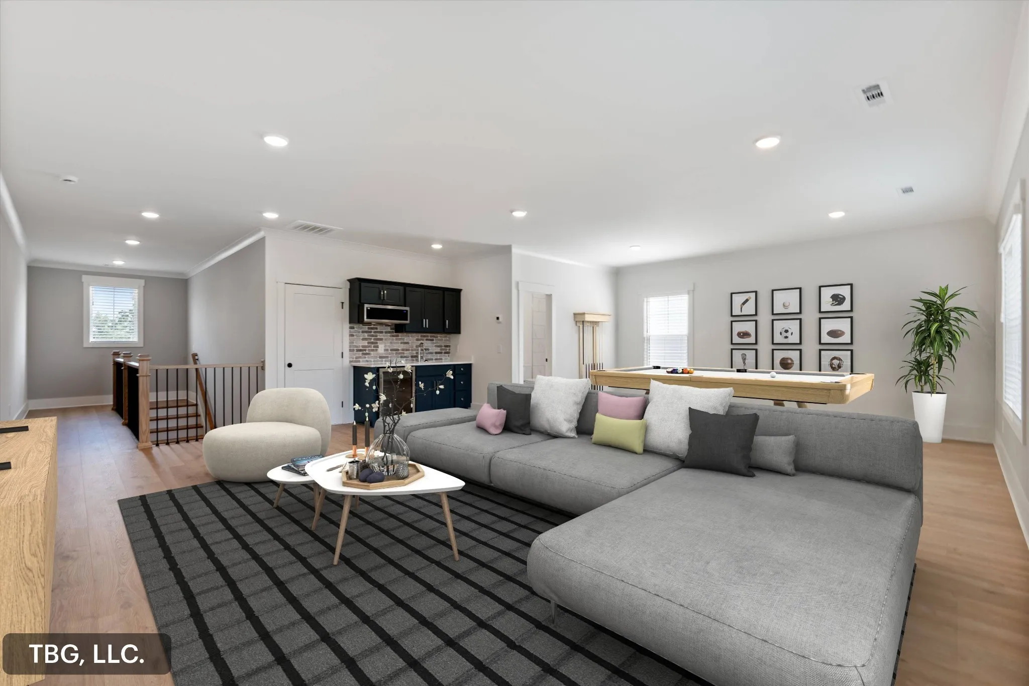 High-end finishes throughout include quartz countertops, custom shelving in every closet, detailed trim work, and stylish accent walls. The spacious flex/bonus room features a full bath and built-in wet bar, along with walk-in attic storage, a two-car garage, and a relaxing covered back patio.
