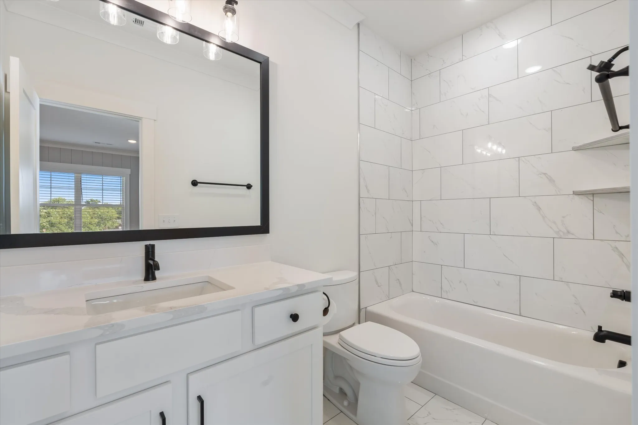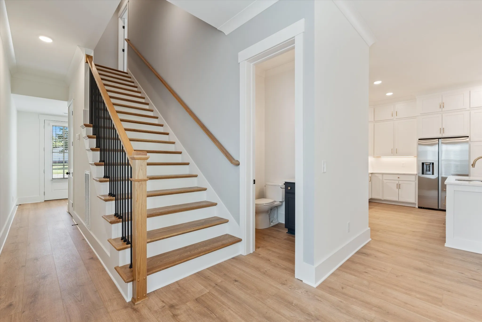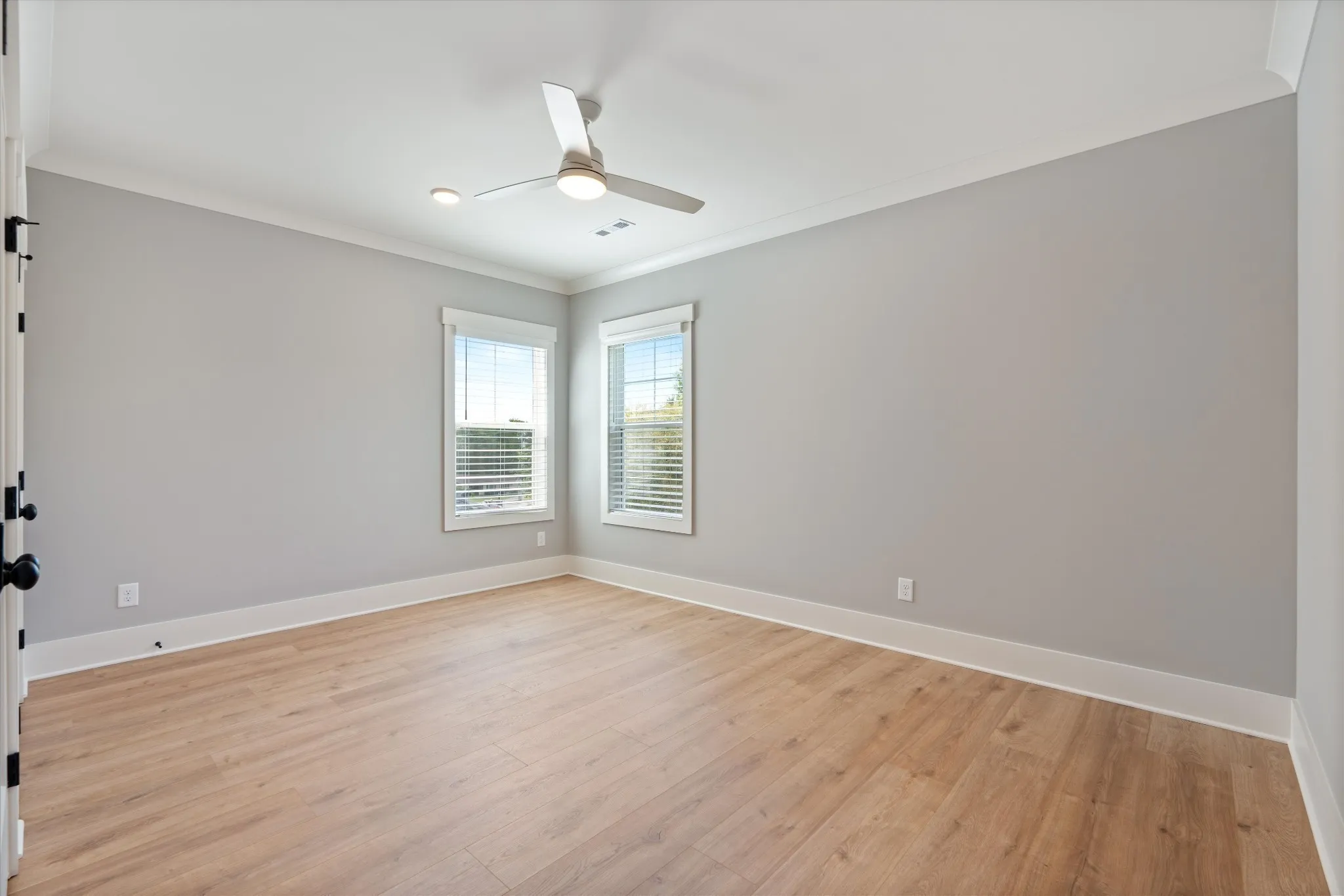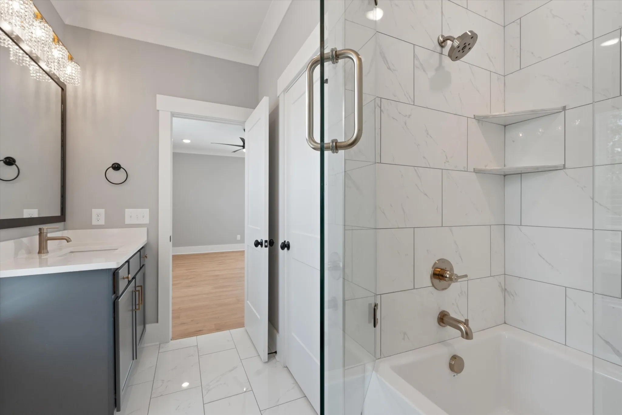High-end finishes throughout include quartz countertops, custom shelving in every closet, detailed trim work, and stylish accent walls. The spacious flex/bonus room features a full bath and built-in wet bar, along with walk-in attic storage, a two-car garage, and a relaxing covered back patio.